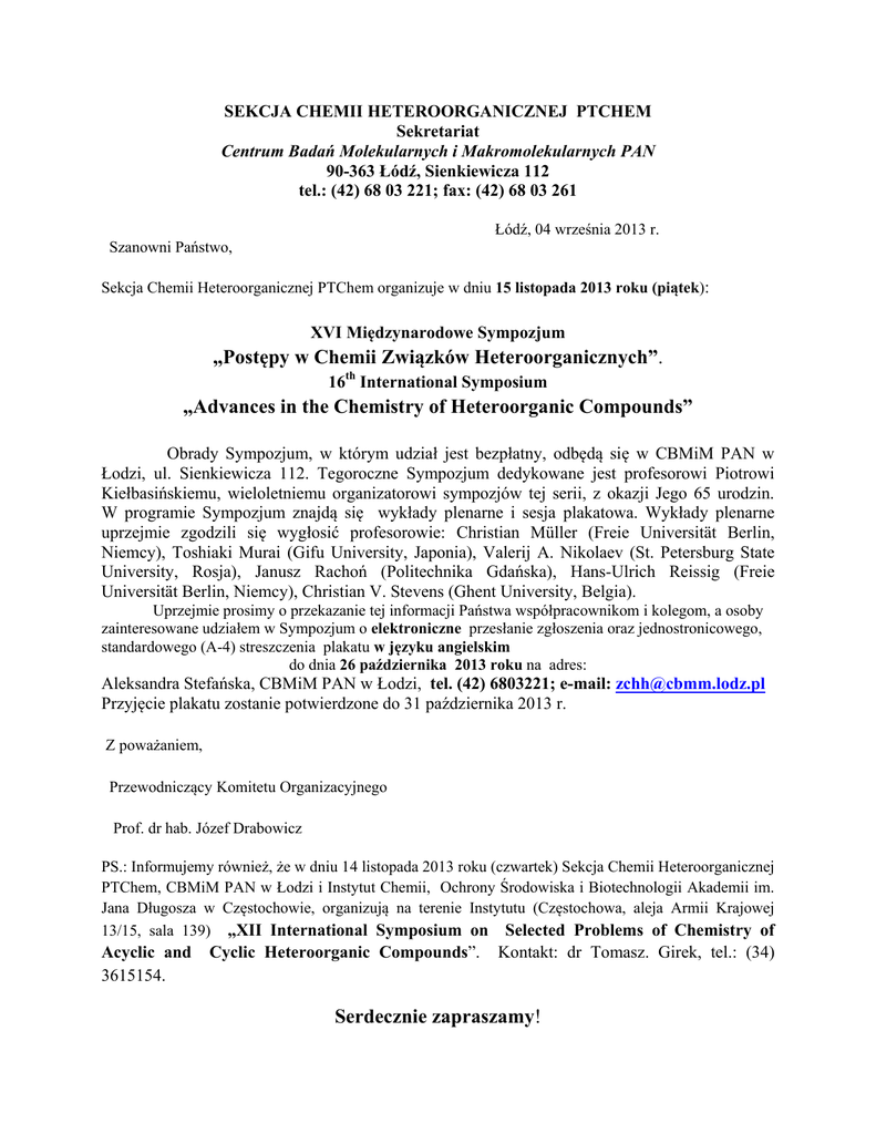 SEKCJA CHEMII HETEROORGANICZNEJ PTCHEM Sekretariat Centrum Badań Molekularnych i Makromolekularnych PAN 90-363 Łódź, Sienkiewicza 112 tel.: (42) 68 03 221; fax: (42) 68 03 261 Łódź, 04 września 2013 r. Szanowni Państwo, Sekcja Chemii Heteroorganicznej PTChem organizuje w dniu 15 listopada 2013 roku (piątek): XVI Międzynarodowe Sympozjum „Postępy w Chemii Związków Heteroorganicznych”. 16th International Symposium „Advances in the Chemistry of Heteroorganic Compounds” Obrady Sympozjum, w którym udział jest bezpłatny, odbędą się w CBMiM PAN w Łodzi, ul. Sienkiewicza 112. Tegoroczne Sympozjum dedykowane jest profesorowi Piotrowi Kiełbasińskiemu, wieloletniemu organizatorowi sympozjów tej serii, z okazji Jego 65 urodzin. W programie Sympozjum znajdą się wykłady plenarne i sesja plakatowa. Wykłady plenarne uprzejmie zgodzili się wygłosić profesorowie: Christian Müller (Freie Universität Berlin, Niemcy), Toshiaki Murai (Gifu University, Japonia), Valerij A. Nikolaev (St. Petersburg State University, Rosja), Janusz Rachoń (Politechnika Gdańska), Hans-Ulrich Reissig (Freie Universität Berlin, Niemcy), Christian V. Stevens (Ghent University, Belgia). Uprzejmie prosimy o przekazanie tej informacji Państwa współpracownikom i kolegom, a osoby zainteresowane udziałem w Sympozjum o elektroniczne przesłanie zgłoszenia oraz jednostronicowego, standardowego (A-4) streszczenia plakatu w języku angielskim do dnia 26 października 2013 roku na adres: Aleksandra Stefańska, CBMiM PAN w Łodzi, tel. (42) 6803221; e-mail: [email protected] Przyjęcie plakatu zostanie potwierdzone do 31 października 2013 r. Z poważaniem, Przewodniczący Komitetu Organizacyjnego Prof. dr hab. Józef Drabowicz PS.: Informujemy również, że w dniu 14 listopada 2013 roku (czwartek) Sekcja Chemii Heteroorganicznej PTChem, CBMiM PAN w Łodzi i Instytut Chemii, Ochrony Środowiska i Biotechnologii Akademii im. Jana Długosza w Częstochowie, organizują na terenie Instytutu (Częstochowa, aleja Armii Krajowej 13/15, sala 139) „XII International Symposium on Selected Problems of Chemistry of Acyclic and 3615154. Cyclic Heteroorganic Compounds”. Kontakt: dr Tomasz. Girek, tel.: (34) Serdecznie zapraszamy! ZGŁOSZENIE UCZESTNICTWA w Sympozjum “Postępy w Chemii Połączeń Heteroorganicznych” Łodź, 15 listopada 2013 r. Imię i nazwisko ........................................................................................................... Stanowisko/stopień naukowy ........................................................................................................... Adres do korespondencji ........................................................................................................... ........................................................................................................... E-mail ...........................................................................................................