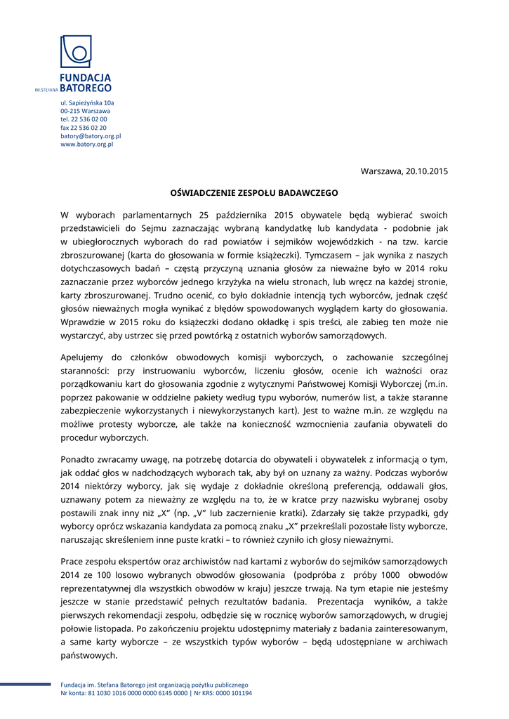 ul. Sapieżyńska 10a 00-215 Warszawa tel. 22 536 02 00 fax 22 536 02 20 [email protected] www.batory.org.pl Warszawa, 20.10.2015 OŚWIADCZENIE ZESPOŁU BADAWCZEGO W wyborach parlamentarnych 25 października 2015 obywatele będą wybierać swoich przedstawicieli do Sejmu zaznaczając wybraną kandydatkę lub kandydata - podobnie jak w ubiegłorocznych wyborach do rad powiatów i sejmików wojewódzkich - na tzw. karcie zbroszurowanej (karta do głosowania w formie książeczki). Tymczasem – jak wynika z naszych dotychczasowych badań – częstą przyczyną uznania głosów za nieważne było w 2014 roku zaznaczanie przez wyborców jednego krzyżyka na wielu stronach, lub wręcz na każdej stronie, karty zbroszurowanej. Trudno ocenić, co było dokładnie intencją tych wyborców, jednak część głosów nieważnych mogła wynikać z błędów spowodowanych wyglądem karty do głosowania. Wprawdzie w 2015 roku do książeczki dodano okładkę i spis treści, ale zabieg ten może nie wystarczyć, aby ustrzec się przed powtórką z ostatnich wyborów samorządowych. Apelujemy do członków obwodowych komisji wyborczych, o zachowanie szczególnej staranności: przy instruowaniu wyborców, liczeniu głosów, ocenie ich ważności oraz porządkowaniu kart do głosowania zgodnie z wytycznymi Państwowej Komisji Wyborczej (m.in. poprzez pakowanie w oddzielne pakiety według typu wyborów, numerów list, a także staranne zabezpieczenie wykorzystanych i niewykorzystanych kart). Jest to ważne m.in. ze względu na możliwe protesty wyborcze, ale także na konieczność wzmocnienia zaufania obywateli do procedur wyborczych. Ponadto zwracamy uwagę, na potrzebę dotarcia do obywateli i obywatelek z informacją o tym, jak oddać głos w nadchodzących wyborach tak, aby był on uznany za ważny. Podczas wyborów 2014 niektórzy wyborcy, jak się wydaje z dokładnie określoną preferencją, oddawali głos, uznawany potem za nieważny ze względu na to, że w kratce przy nazwisku wybranej osoby postawili znak inny niż „X” (np. „V” lub zaczernienie kratki). Zdarzały się także przypadki, gdy wyborcy oprócz wskazania kandydata za pomocą znaku „X” przekreślali pozostałe listy wyborcze, naruszając skreśleniem inne puste kratki – to również czyniło ich głosy nieważnymi. Prace zespołu ekspertów oraz archiwistów nad kartami z wyborów do sejmików samorządowych 2014 ze 100 losowo wybranych obwodów głosowania (podpróba z próby 1000 obwodów reprezentatywnej dla wszystkich obwodów w kraju) jeszcze trwają. Na tym etapie nie jesteśmy jeszcze w stanie przedstawić pełnych rezultatów badania. Prezentacja wyników, a także pierwszych rekomendacji zespołu, odbędzie się w rocznicę wyborów samorządowych, w drugiej połowie listopada. Po zakończeniu projektu udostępnimy materiały z badania zainteresowanym, a same karty wyborcze – ze wszystkich typów wyborów – będą udostępniane w archiwach państwowych. Fundacja im. Stefana Batorego jest organizacją pożytku publicznego Nr konta: 81 1030 1016 0000 0000 6145 0000 | Nr KRS: 0000 101194 Zespół ekspertów: dr hab. Mikołaj Cześnik, Wydział Nauk Humanistycznych i Społecznych Wyższej Szkoły Psychologii Społecznej dr Jarosław Flis, Wydział Zarządzania i Komunikacji Społecznej Uniwersytetu Jagiellońskiego dr Adam Gendźwiłł, Zakład Rozwoju i Polityki Lokalnej, Wydział Geografii i Studiów Regionalnych Uniwersytetu Warszawskiego prof. Mirosława Grabowska, Zakład Metodologii Badań Socjologicznych, Instytut Socjologii Uniwersytetu Warszawskiego dr hab. Jacek Haman, Zakład Statystyki, Demografii i Socjologii Matematycznej, Instytut Socjologii Uniwersytetu Warszawskiego dr Anna Materska-Sosnowska, Instytut Nauk Politycznych, Wydział Dziennikarstwa i Nauk politycznych Uniwersytetu Warszawskiego dr hab. Bartłomiej Michalak, Wydział Politologii i Studiów Międzynarodowych Uniwersytetu Mikołaja Kopernika w Toruniu dr hab. Bartłomiej Nowotarski, Katedra Filozofii i Historii Gospodarczej Uniwersytet Ekonomiczny we Wrocławiu prof. Jacek Raciborski, Zakład Socjologii Polityki Instytutu Socjologii UW prof. Andrzej Rychard, Instytut Filozofii i Socjologii Polskiej Akademii Nauk dr Dawid Sześciło, Zakład Nauki Administracji Wydziału Prawa i Administracji UW dr Jarosław Zbieranek, Centrum Studiów Wyborczych Uniwersytetu Mikołaja Kopernika w Toruniu dr Tomasz Żukowski, Instytut Polityki Społecznej UW