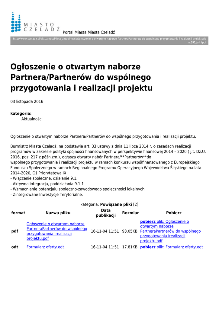 Portal Miasta Miasta Czeladź http://www.czeladz.pl/aktualnosci/lista_aktualnosci/Ogloszenie-o-otwartym-naborze-PartneraPartnerow-do-wspolnego-przygotowania-i-realizacji-projektu/id n:391/printpdf Ogłoszenie o otwartym naborze Partnera/Partnerów do wspólnego przygotowania i realizacji projektu 03 listopada 2016 kategoria: Aktualności Ogłoszenie o otwartym naborze Partnera/Partnerów do wspólnego przygotowania i realizacji projektu. Burmistrz Miasta Czeladź, na podstawie art. 33 ustawy z dnia 11 lipca 2014 r. o zasadach realizacji programów w zakresie polityki spójności finansowanych w perspektywie finansowej 2014 – 2020 ( j.t. Dz.U. 2016, poz. 217 z późn.zm.), ogłasza otwarty nabór Partnera/**Partnerów**do wspólnego przygotowania i realizacji projektu w ramach konkursu współfinansowanego z Europejskiego Funduszu Społecznego w ramach Regionalnego Programu Operacyjnego Województwa Śląskiego na lata 2014-2020, Oś Priorytetowa IX - Włączenie społeczne, działanie 9.1. - Aktywna integracja, poddziałania 9.1.1 - Wzmacnianie potencjału społeczno-zawodowego społeczności lokalnych - Zintegrowane Inwestycje Terytorialne. format Nazwa pliku kategoria: Powiązane pliki [2] Data Rozmiar publikacji Pobierz pdf pobierz plik: Ogłoszenie o Ogłoszenie o otwartym naborze otwartym naborze PartneraPartnerów do wspólnego 16-11-04 11:51 93.05KB PartneraPartnerów do wspólnego przygotowania irealizacji przygotowania irealizacji projektu.pdf projektu.pdf odt Formularz oferty.odt 16-11-04 11:51 17.81KB pobierz plik: Formularz oferty.odt