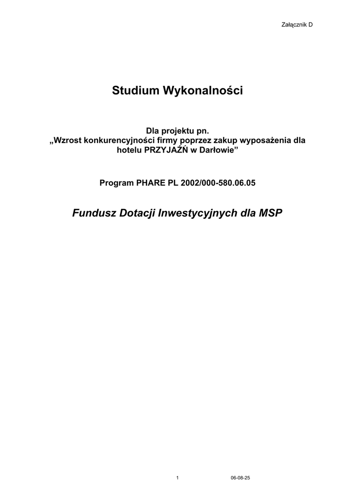 Załącznik D Studium Wykonalności Dla projektu pn. „Wzrost konkurencyjności firmy poprzez zakup wyposażenia dla hotelu PRZYJAŹŃ w Darłowie” Program PHARE PL 2002/000-580.06.05 Fundusz Dotacji Inwestycyjnych dla MSP 1 06-08-25 Phare SSG – 2002/000-580.06.05Fundusz Dotacji Inwestycyjnych dla MSP SPIS TREŚCI Studium Wykonalności............................................................................................................... 1 SEKCJA A INFORMACJE OGÓLNE O WNIOSKODAWCY........................................................................3 A-1 Dane wnioskodawcy...................................................................................................................................... 3 A-2 Charakterystyka działalności przedsiębiorstwa............................................................................................. 3 A-3 Dodatkowe informacje i referencje................................................................................................................3 A-4 Dane autora planu przedsięwzięcia................................................................................................................4 SEKCJA B PLAN MARKETINGOWY............................................................................................................... 5 B-1 Produkt / usługa..............................................................................................................................................5 B-2 Rynek............................................................................................................................................................. 6 B-3 Konkurencja na rynku.................................................................................................................................... 7 B-4 Dystrybucja i promocja.................................................................................................................................. 7 B-5 Cena................................................................................................................................................................8 B-6 Prognoza sprzedaży........................................................................................................................................9 B-7 Przychody.......................................................................................................................................................9 SEKCJA C ZATRUDNIENIE I PERSONEL.................................................................................................... 11 C-1 Personel wnioskodawcy............................................................................................................................... 11 C-2 Kadra kierownicza........................................................................................................................................11 SEKCJA D PLANOWANA INWESTYCJA......................................................................................................13 D-1 Opis planowanej inwestycji......................................................................................................................... 13 D-2 Aktualne zdolności wytwórcze.................................................................................................................... 15 D-3 Informacja o planowanej inwestycji ........................................................................................................... 16 SEKCJA E SYTUACJA EKONOMICZNO-FINANSOWA............................................................................ 17 E-1 Uproszczony bilans...................................................................................................................................... 17 E-2 Rachunek zysków i strat...............................................................................................................................17 E-3 Prognoza przepływów gotówkowych...........................................................................................................18 2 06-08-25 Sekcja B- Plan marketingowy Phare SSG – 2002/000-580.06.05 Fundusz Dotacji Inwestycyjnych dla MSP SEKCJA A INFORMACJE OGÓLNE O WNIOSKODAWCY A-1 Dane wnioskodawcy Proszę o podanie następujących danych HOTEL „PRZYJAŹŃ”, SPÓŁKA Z OGRANICZONĄ ODPOWIEDZIALNOŚCIĄ 2. Adres, siedziba firmy Ul. Lelewela 17, 78-100 Darłowo 3. Lokalizacja działalności przedsiębiorstwa – proszę o Przedsiębiorstwo jest zarejestrowane i prowadzi podanie miejsca wykonywania działalności wraz z działalność hotelowo-gastronomiczną w Darłowie, przy oddziałami ul. Lelewela 17. 4. Osoba uprawiona do kontaktu w sprawach PREZES ZARZĄDU – Jan Nowak dotyczących wniosku 1. Pełna nazwa przedsiębiorcy KOMENTARZ: 1. Pełna nazwa wnioskodawcy musi być zawsze zgodna z dokumentem rejestrowym firmy 2. Osobą uprawnioną do kontaktu ws. wniosku może być pracownik przedsiębiorstwa, jednakże lepiej będzie, gdy sprawą dotacji zajmie się przedstawiciel ścisłego kierownictwa, co podkreśli zaangażowanie potencjalnego beneficjanta w projekt. A-2 Charakterystyka działalności przedsiębiorstwa Proszę zaprezentować w skrócie przedsiębiorstwo, zakres działalności, rodzaj wytwarzanych produktów/ świadczonych usług. Proszę określić charakter jego własności i podać informację o ewentualnych udziałowcach przedsiębiorstwa. 1. Data rozpoczęcia działalności 08.01.1992 roku Jan Nowak 2. Udziałowcy Krystyna Nowak Hotel „Przyjaźń” Sp. z o.o. rozpoczęła swoją działalność w 1992 roku jako firma usługowa. Głównym przedmiotem funkcjonowania spółki są całoroczne usługi hotelarskie i gastronomiczne. Na zakres działalności spółki wpisanej do KRS składają się: hotele i motele z restauracjami, restauracje, 3. Przedmiot i zakres działalności pozostałe placówki gastronomiczne. Hotel usytuowany jest w Darłowie, vis a vis molo, 100 m