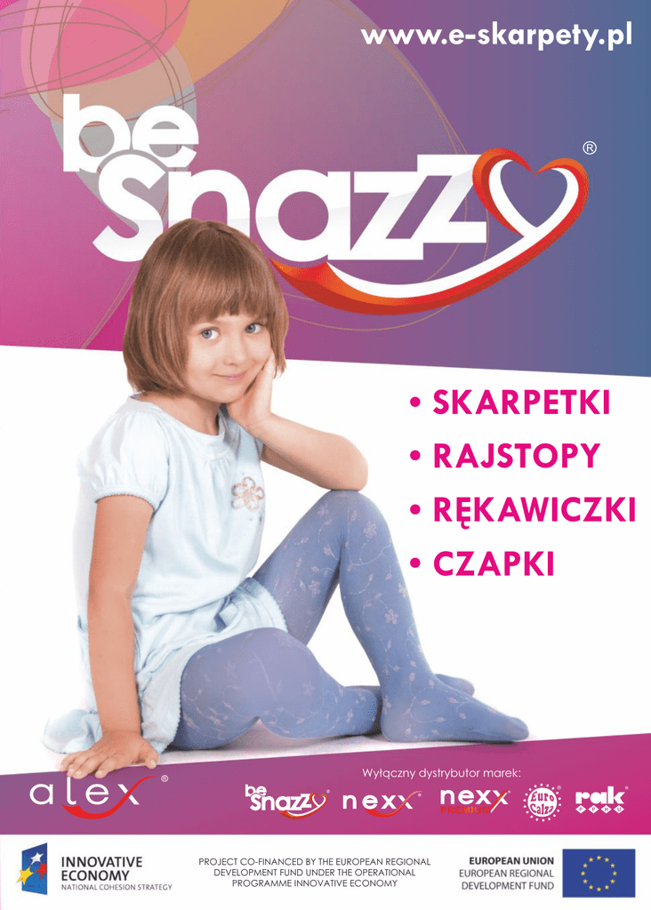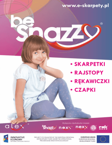 www.e-skarpety.pl SKARPETKI RAJSTOPY RĘKAWICZKI CZAPKI Wyłączny dystrybutor marek: PROJECT CO-FINANCED BY THE EUROPEAN REGIONAL DEVELOPMENT FUND UNDER THE OPERATIONAL PROGRAMME INNOVATIVE ECONOMY SPIS TREŚCI SKARPETKI SOCKS / НОСКИ NIEMOWLĘCE BABY SOCKS / ДЛЯ НОВОРОЖДЁННЫХ s.4-18 s.4-9 DZIECIĘCE I MŁODZIEŻOWE FOR CHILDREN AND YOUNGSTERS / ДЕТСКИЕ И МОЛОДЁЖНЫЕ s.10-11 MŁODZIEŻOWE i DAMSKIE FOR YOUNGSTERS AND WOMENS / МОЛОДЁЖНЫЕ И ЖЕНСКИЕ s.12-15 MĘSKIE FOR MENS / МУЖСКИЕ SPORTOWE SPORT SOCKS / СПОРТИВНЫЕ s.16 s.17-18 PODKOLANÓWKI KNEE SOCKS / ГОЛЬФЫ MŁODZIEŻOWE i DAMSKIE FOR YOUNGSTERS AND WOMENS / МОЛОДЁЖНЫЕ И ЖЕНСКИЕ s.18 s.18 BALETKI i BALERINKI BALLERINAS / БАЛЕРИНКИ И БАЛЕТКИ MŁODZIEŻOWE i DAMSKIE FOR YOUNGSTERS AND WOMENS / МОЛОДЁЖНЫЕ И ЖЕНСКИЕ s.19 s.19 RAJSTOPY TIGHTS / КОЛГОТКИ DZIECIĘCE I MŁODZIEŻOWE FOR CHILDREN AND YOUNGSTERS / ДЕТСКИЕ И МОЛОДЁЖНЫЕ DZIECIĘCE i DAMSKIE FOR CHILDREN AND WOMENS / ДЕТСКИЕ И ЖЕНСКИЕ s.20-28 s.20-27 s.28 GETRY LEGGINGS / ГЕТРЫ DZIECIĘCE I MŁODZIEŻOWE FOR CHILDREN AND YOUNGSTERS / ДЕТСКИЕ И МОЛОДЁЖНЫЕ s.29 s.29 CZAPKI CAPS / ШАПКИ s.30-39 CZAPKI CAPS / ШАПКИ s.30-31 KAPELUSZE HATS / ШЛЯПЫ s.32-33 CHUSTKI Z DASZKIEM SHAWL CAPS / КОСЫНКИ С КОЗЫРЬКОМ BASEBALLÓWKI BASEBALL CAPS / БЕЙСБОЛКИ PATROLÓWKI PATROL CAPS / КЕПКИ RĘKAWICZKI GLOVES / РУКОВИЦЫ s.33 s.34-38 s.39 s.40-48 TABELE ROZMIARÓW SIZES / РАЗМЕРНЫЙ РЯД s.50 MAPA DOJAZDU MAP / КАРТА s.51 2 Historia mojej firmy rozpoczęła się w 1995 roku. Osiemnaście lat na rynku przyniosło mi ogromne doświadczenie w branży i pozytywnie wpłynęło na jakość produktów oferowanych przez firmę ALEX. Stały kontakt z odbiorcami, pozwala mi wyjść naprzeciw oczekiwaniom nawet najbardziej wymagających klientów. To wy jako klienci macie najważniejszy głos. Dzisiaj produkuję i importuję bardzo szeroką gamę skarpet, rajstop i rękawiczek dla wszystkich grup wiekowych. Wprowadzane od kilku lat innowacyjne rozwiązania zaowocowały rozwojem rynku zbytu, rozpoznawalnością marek własnych oraz niepowtarzalnym wzornictwem. W tym roku oferowany przeze mnie asortyment wzbogacił się o czapki. Wzornictwo podążające za najnowszymi trendami, dbałość o jakość surowców, dokładne wykonanie oraz wysiłki moich współpracowników składają się na sukces naszych głównych marek oraz . Wysoką jakość potwierdzają przyznane nam certyfikaty : „BEZPIECZNY DLA NIEMOWLĄT” „ BEZPIECZNY DLA DZIECKA” oraz ”PRZYJAZNY DLA CZŁOWIEKA”. DLA ZNY A K YJA PRZ ŁOWIE CZ Zapraszamy do naszej nowej siedziby, gdzie będziecie mogli Państwo zapoznać się z naszą ofertą, obejrzeć i dotknąć nasze produkty. Atrakcyjnością cen oferowanych przez nas artykułów chcemy zaprosić do współpracy z naszą firmą, która spełni wszystkie Państwa oczekiwania. The history of my company began in 1995. Eighteen years on the market gives me a lot of experience in business and positively affected the quality of products offered by ALEX company. Constant contact with wholesalers enables me to face the expectations of the most demanding clients. Your opinion is the most important to me. Nowadays I produce and import a wide range of socks, tights and gloves for ale age groups. Innovations which have been introduced by us resulted in development of the market, recognition of our brands and unique design. This year our assortment has been enriched with caps and hats. Trendy design, care for the quality of materials, accurate workmanship and efforts of my co-workers result in the success of our main brands „BE SNAZY” and „NEXX”. High quality is confirmed by certificates: „Safe for babies”, „Safe for children”, „Friendly for human”. We encourage you to visit our new head office where you can acquaint with our offer, see and touch our products. We invite you to cooperate with our company, which will fulfil all your expectations. История моей фирма началась в 1995 году. Восемнадцать лет существования на рынке дало мне огромный опыт в данной отрасли и позитивно повлияло на качество продуктов, предлагаемых фирмой ALEX. Постоянный контакт с получателями, позволяет мне выйти напротив ожиданиям даже наиболее требовательных клиентов. Это Вы – наши клиенты, обладаете самым важным для нас голосом. Сегодня я произвожу и импортирую широкую гамму носков, колготок и руковиц для всех возрастных групп. Применённые инновационные решения повлияли на развитие рынка сбыта, узнаваемость брэндов, а также неповторимого дизайна. В этом году в рядах продаваемых нами продуктов появились шапки. Дизайн отвечающий наиновшим тенденциям, забота о качество сырья, отличное изготовление, а также труд моих сотрудников повлияли на упех наших главных брэндов „BE SNAZZY”, а также „NEXX”. Высокое качество потверждают сертификаты: «Безопасный для новорожденных», «Безопасный для детей», «Безопасный для человека». Приглашаем Вас посетить нашу