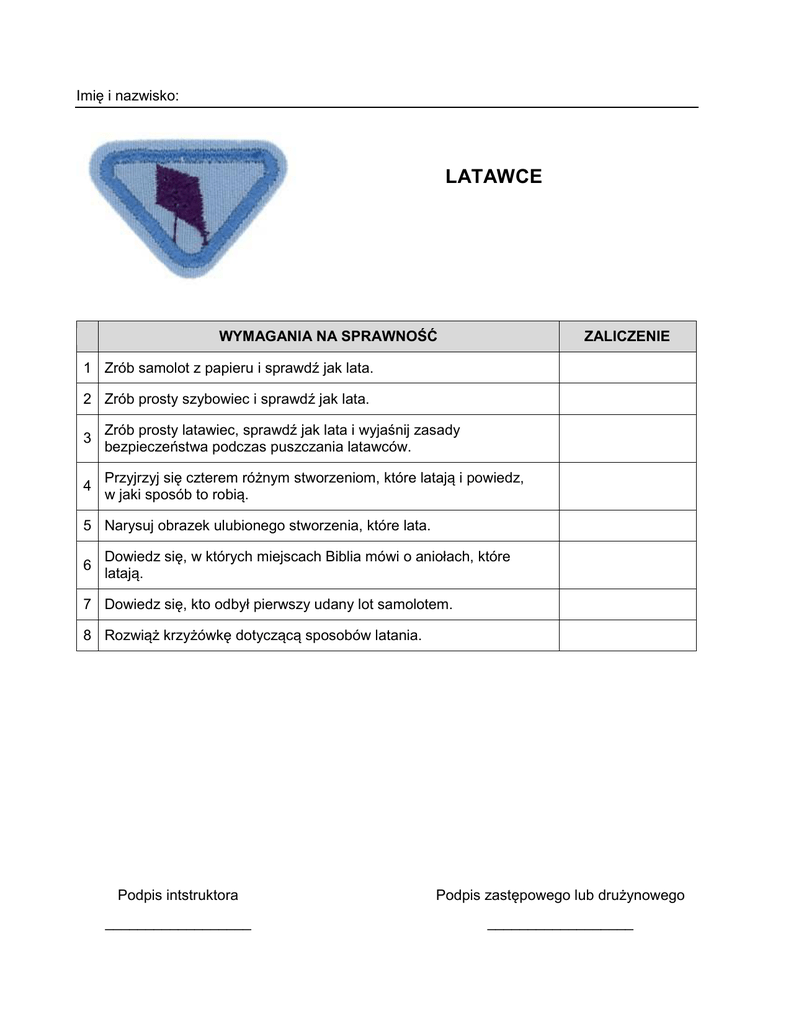 Imię i nazwisko: LATAWCE WYMAGANIA NA SPRAWNOŚĆ ZALICZENIE 1 Zrób samolot z papieru i sprawdź jak lata. 2 Zrób prosty szybowiec i sprawdź jak lata. 3 Zrób prosty latawiec, sprawdź jak lata i wyjaśnij zasady bezpieczeństwa podczas puszczania latawców. 4 Przyjrzyj się czterem różnym stworzeniom, które latają i powiedz, w jaki sposób to robią. 5 Narysuj obrazek ulubionego stworzenia, które lata. 6 Dowiedz się, w których miejscach Biblia mówi o aniołach, które latają. 7 Dowiedz się, kto odbył pierwszy udany lot samolotem. 8 Rozwiąż krzyżówkę dotyczącą sposobów latania. Podpis intstruktora Podpis zastępowego lub drużynowego __________________ __________________