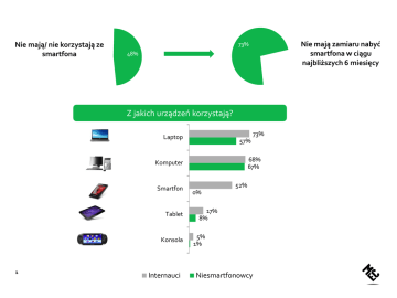 Nie mają/ nie korzystają ze smartfona Nie mają zamiaru nabyć smartfona w ciągu najbliższych 6 miesięcy 73% 48% 52% 27% Z jakich urządzeń korzystają? 73% Laptop 57% 68% 67% Komputer Smartfon Tablet Konsola 1 Internauci 52% 0% 17% 8% 5% 1% Niesmartfonowcy Czemu ma smartfona a nie korzysta z jego możliwości? 51% Nie mam/ miałem takiej potrzeby 57% 39% Jest zbyt drogi 32% 2012 2 2013 Czy zamierza kupić smartfona w ciągu najbliższych 6 miesięcy? 2012 36% 30% 13% 73% nie zamierza 2013 3 38% 16% 5% 18% zamierza 35% Zdecydowanie nie Raczej nie Raczej tak Zdecydowanie tak 9% 12% 6% Ani tak ani nie 73% Nie mają zamiaru nabyć smartfona w ciągu najbliższych 6 miesięcy 27% Dlaczego nie zamierza kupić smartfona w ciągu najbliższych 6 miesięcy? 54% Telefon wykorzystuję tylko do dzwonienia/pisania SMSów 57% 62% Nie potrzebuję dostępu do Internetu non-stop 42% 47% Mam telefon bez dostępu do Internetu, z którego jestem zadowolony(a) 31% 31% Niewygoda korzystania (niewielki ekran, mało wyraźne strony) 21% 24% Mam tablet, laptopa przez który mam stały dostęp do Internetu 22% 22% Boję się wysokich rachunków 18% 21% Aparat telefoniczny jest za drogi 17% 17% Nie chcę być non-stop dostępny(a) w Internecie 8% Taki telefon jest zbyt skomplikowany w obsłudze 16% W takim telefonie jest słaba bateria 11% 13% Boję się o bezpieczeństwo danych 9% 13% 16% 12% Mam podpisaną umowę z operatorem, która kończy mi się później Słaby zasięg w mojej okolicy 11% 10% Zbyt wolny transfer danych 11% 10% Boję się uzależnienia od Internetu 63% 2% 3% 4 2012 2013 73% Nie mają zamiaru nabyć smartfona w ciągu najbliższych 6 miesięcy TOP2BOXES – odpowiedzi raczej/ zdecydowanie tak 27% Co mogłoby przekonać do zakupu smartfona? Niższa cena aparatu telefonicznego 44% 46% Niższa cena połączeń z Internetem 41% 46% 40% 38% Pełna kontrola nad łączeniem się z Internetem (wydatkami) 39% 38% Lepsza bateria 33% 38% Większy ekran 31% Oferta promocyjna 28% Lepszy zasięg 24% Łatwiejszy w obsłudze telefon komórkowy/smartfon 36% 31% 24% 30% Darmowy test telefonu 23% Większy wybór darmowych apliakcji 5 2012 2013 37% 30% 82% 18% Mają zamiar nabyć smartfona w ciągu najbliższych 6 miesięcy Dlaczego zamierza kupić smartfona w ciągu najbliższych 6 miesięcy? 59% Są sytuacje, kiedy Internet jest niezbędny Łączy w sobie funkcje różnych urządzeń (dostęp do Internetu, GPS, aparat telefoniczny, mp3) 44% 29% Są dostępne użyteczne aplikacje 57% 50% 45% 43% Można korzystać z multimediów/słuchać muzyki/oglądać filmy 33% 35% Taki telefon ma nawigację (GPS) Potrzebuję kontaktu ze znajomymi non-stop (portale społecznościowe, poczta, komunikatory) 24% 8% Wszyscy teraz mają smartfona/ telefon z dostępem do Internetu 23% 21% 21% Jest ładny/fajnie wygląda Mój operator oferuje mi smartfona/telefon z dostępem do Internetu w korzystnej cenie 23% 20% Potrzebuję dostępu do Internetu non-stop 12% 18% 9% 12% Jest modny/podnosi prestiż 9% 9% Potrzebuję go w pracy 2012 2013 31% 69% 82% 18% Mają zamiar nabyć smartfona w ciągu najbliższych 6 miesięcy TOP2BOXES – odpowiedzi raczej/ bardzo ważne Jakie parametry smartfona są najważniejsze? 71% Dobry aparat fotograficzny 91% Cena aparatu telefonicznego 90% 90% Szybki procesor 89% 90% Rozdzielczość ekranu 87% 90% 83% Duży wyświetlacz 90% Estetyka telefonu 87% 86% Możliwość wymiany karty pamięci 86% 85% 77% 80% System operacyjny 79% 76% Dostępne do ściągnięcia aplikacje Wielkość wbudowanej pamięci 75% Zainstalowane aplikacje 72% Obsługiwane formaty multimediów 72% 54% Ekran dotykowy Marka telefonu/smartfona 32% 2012 2013 42% 80% 80% 62% 61% Klawiatura Qwerty 83% 80%