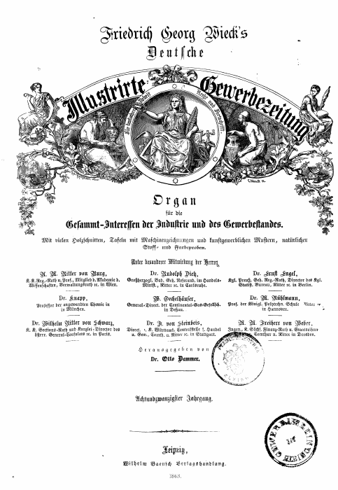 FriedrichHeorgDrecke , - g » ,— v. Jz ; , , il - , L· id« —, -. ·-"H«s-..«’ . , lxv » N ». . ,«-· » , für die der Industrie und Bestimmt-Interessen Mit Tafeln Holzfchnitten, vielen und Stoff- von Dr« « Brosessor der Gewerbe-standen Farbcproben. der Hinterbei-andererMitwirkung A. Zel. Ritter Dr. Burg, u.Prof., Mitglied d.Akademie d. K.Reg.-—Rath Wissenschaften,Verwaltungsvath ic. in Wien. K. des und kunstgewerblichen Mustern, natürlichen Maschinenzeichnringen mit WerterzDr. Rudotplj Yietz, Bad. Geh. Referand. Großherzogl. Minist., Ritter 2c. im Handels- in Carlsruhe. gös. Gechelljäuser, Wapp, angewandten Chemie in General-Direct. in München. Continental-Gas-Gefellich. der in Deßau. Ottrnit Osngeh KgL Preuß. Geh. Reg.-Rath, Director-des KgL Statist. Burean, Ritter 2c. in Berlin. der Prof. Dr. Zel. Rätjtmann, Königl.·Polytechn. Schule In . Ritter Hannover. Dr. Wilhelm Ritter von Hctjwarz, -Rath nnd Kanzlei-Director österr. General-Consulats 2c. in Paris. K. K. Sections des Dr— Direct. u. ). F. von K. Württemb. Gew., Comth. Centralstellef. Ritter u. Ic. Herausgegeben Otto Dr. get »Zei-Freitjerr Hteinliei5, m Handel Stuttgart. IT von Dammes-. Jahrgang Achtundzwanzigster ff — « ——--—-- Yeipzig , Wilhelm Baenjch Versagshandlung. J18i53« Jn en K. « Vetter, von Sächs. Finanz-Rath Comthur U. Ritter » . « -—- u. Staatseisents in Dresden. " s« « k .... ..x»-,,«« . ·"«,-'-·--.-e...II-«HTY-·.s-« usl -.. .« -. .», « -’- « ? »J. CJHT I s. Ast-IF J «-.«4;L13»3-1Mk - .« Erd-sk- act-: »F:,«s:d.« .. såa Jnhalts--Verzeichsniß« Baumaterialien Abblasen 340. Absperrventile ll2. Achseniager l.04. 108. Aether, Reinheit 243. Aetznatron 57. H Altohole, Reinheit Aluminiumbronze Amalgam 60. 83. Ambosfabritation im Annnoniak auf Glas 420. 303, Blei 364. Brauerei Brenners 380. 104. 212. 363. Brennerei Brennmaterial 25. 97. 354. Brennöl 138. 139. 109· 84. Briefbeförderung Brillantiue 140. 244. » Briquettes 35. Asphalt-Röhre11 Brot 108« Asphaltsclzmieke 25. Bronze 9l. " Brücke49. Brückenwagen 124. Buchbindekmaschine132· 188. s Biifselfieisch Bl-» Backmafchinen Backsteine, seuerfelte227. Baggermaschine324 l - I Canäle, 116. 364. Transport Carbolsäure 36. 34«·t. Dampsentwickelung Dampltessel 12. 343. 87. 212. 351. 366. 6B. 244. 348. Dainpftkabn Dampfmaschine 140. 191 383. Dampfmaschine von Polignac l9. Dampfmaschine von Schutz 76. Dampfmotoren 340. Dampfomnibus 228. Dampfpfannenbetrieb 270. 287. 29V 37. Dampsspslug Damptpresse 248. Dampfpumpe mit Schiebcr Dampfpumpe, Sewells 55. 3. Dampfstrahlvumpe 212. Dampf-Ventile 100. Darmsaiten 19. Darröfen 49. Deckel, luftdichte 224. «139. Depeschenbeförderung Dephlegmator 242. Desinfection 258. C. i Cadmium I Camvfer Dachschiefer 28. Dämmein Wasser 2R9. Dampfdreschniaschine 78. Dampfregulator 228. Dampffpritzen 324. 354. 223. Btvkbackmaschinen61· Bronziren 148. AsphaltEchuhe 340. Aufzugkasten12-1« Ausbküten, Künstl· ZieAusringemafchine91. 273» Barytindustrie Bastband 280. 277 293. 290. 97. Braunkohlentheer Brausevulver 404. Brechmaschine 124. Brems hr)drostat. 72. 59. . Braugerätbe 4tt—«. und Braunkohlen 125. 218. D- 76. Bohrmaschine 20. 180. 367. 332. Bomben ohne-Sünder 84. Branntwein 236. 26. Arsenal in Woolwich 85. 109. Barometer Baryt 9. 64. Bleistifte 373. 85. Arnlftrong-Gefchütze Cornuti Coaks, Reinigung 99. Cylindrische Gläser 307. . Bleiröbren Blitzableiter 8. 9l. Blutlaugensalzfabr. 281. Blutlaugensalz 313. 319. . 213. 316- 180. Ascaniqlith So 188. 68. 39. Bleiche, chemische250Bleichen 116. l39. Asphattrack Coaks 107. Bierwürze-Kiihlungsavparat 249. Antichlor 36. Appretur entfernen 212. Spias 100. 136. l24. der Luft 227 Comprimiren Copalsirniß Zö. Cyankalium 196. Cylinder für Lampen l96. 228. s Anstrich f. Drabtgehege Anstrich für Essen Und Holzbauten 107. Anstrich mit Kupferpulver cotuja 284. Cloaken Chromgelb 292. Biertlärmittel 139. 247. 197. Arbeiterbewegung Chlornatron Cllronifarbe,neue ·Cl)romroth 292. 292. Bessemerstahl 91. Blau Collodium Anilinroth ll. 139. 247. Anllinschwarz 138. Anthemis 180. Berliner Cognac 228. Colonial-Rum Anilingelb 380. Anilinvioiet 0. 402. 179. Beleuchtung in Theatern 36.· Beleuchtungsmaterialien 163. Bierconservator 420. 59. 139. l62. 348 »375. Eifens Chamäleonbeize300. 17l. Befsemerverfahren 87. Bewegung, rotirende 396. Wein 329. 139. Anilinfarben 167. Bierfässer-11nterlage196. 164. 123. Anilin 89. 99. des Centrifuge bei Stärkefabr 34. Centrifugalmasclzine242. 332. , 111.1.42. 228. Ammoniaksalze 313. 319. Ammoniakwasser 339. Anitinblau 57. 76. 243. 9l. 60. Ammoniatflüssigkett Attilin Ccmentiren verpackcu ll6. 8. 229. 52. 323. 11· Alkaiien 44. Alkalimetrie Alkohol aus Gas Cement 66· 338. 9l.,31,5. Beleuchtlm Albuminpapier 83. 52. 235. Algen Baumwolle Baumwolle, Baumwollengewebe 212. Baumwollsurrogat 59. 363. 292. Albumin - Destillationsappmt Dialyse Diamant Diamant auf dens. l2. 164- 35. 418. zum Bohren li- 76. Differentialslaschenzüge Dinasteine 84. 252. 324. 340. 1V · — Flaschenlack Flaschen, verbesserte 203. Flaschenziige 76. Fleisch aufbewahren 244. Flintenlänfe 92. Flintglas 92. Flußsäure 369. 412. 204. Druckapparat Drucksormen 252. Druckpuinpe 321. Druckpumpe de Javelle und Eichenrinde Hautausschläge156. Hechelmaschine 80. Galvan. Garne Garne Garne Einmachekruken 224. Cis 334. Eismaschine119. 132. Eisen 348. Eisen, Festigteit 227. Eisen und Stahl 92. Eisen verbleien 332. Eisen, vertupfertes 276. Eisen- verzinktes und gewelltes 20. Eisen, weiches, krystallinisches 348. Eisenader, magnettsche 340. Eisen-Architektur 364. Eisenbahnrad 115. Eisenbahnbriicke iiber den Rhein l9. Gasbrenner 394. 380. 132. 402. Facetten anschleifen 312. FaeomRum 420. Färberei 44. 100. 139. Farbstoff, rother neuer 100. Faizhahn 321. Feiienhauinaschine387. ltx Felle zu bohren mit Diamant 364. Fette nachzuweisen 401. Feuchtigkeltsmesser Feuerieste Steine 227. 248. 420. Feuersestigkettvon Thon Zö. , «- · 321. Fsllkixen115.- Fk