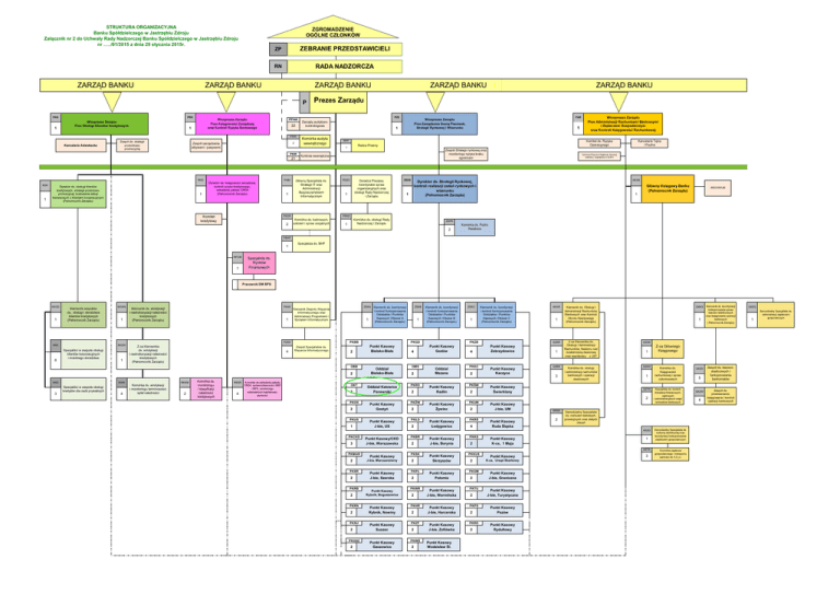 STRUKTURA ORGANIZACYJNA Banku Spółdzielczego w Jastrzębiu Zdroju Załącznik nr 2 do Uchwały Rady Nadzorczej Banku Spółdzielczego w Jastrzębiu Zdroju nr …../01/2015 z dnia 29 stycznia 2015r. ZARZĄD BANKU ZGROMADZENIE OGÓLNE CZŁONKÓW ZP ZEBRANIE PRZEDSTAWICIELI RN RADA NADZORCZA ZARZĄD BANKU ZARZĄD BANKU P PKK 1 PRK Wiceprezes Zarządu Pion Obsługi Klientów Kredytowych Wiceprezes Zarządu Pion Księgowości Zarządczej oraz Kontroli Ryzyka Bankowego 1 PPAK 22 PAW Kancelaria Adwokacka Zespół ds. strategii produktowopromocyjnej Zespół zarządzania aktywami i pasywami 2 21 RKD KDK 1 Dyrektor ds. obsługi klientów kredytowych, strategii produtowopromocyjnej, budowania relacji biznesowych z klientami korporacyjnymi (Pełnomocnik Zarządu) 1 Dyrektor ds. księgowości zarządczej, kontroli ryzyka kredytowego, wdrażania pakietu CRD4 (Pełnomocnik Zarządu) PABI 1 PZS Zarządy audytowokontrolingowe Komórka audytu wewnętrznego Główny Specjalista ds. Strategii IT oraz Administracji Bezpieczeństwem Informatycznym 2 PAR Wiceprezes Zarządu Pion Zarządzania Siecią Placówek, Strategii Rynkowej i Wizerunku 1 1 RPP Zespół Strategii rynkowej oraz monitoringu ryzyka braku zgodności PDZO Doradca Prezesa, koordynator spraw organizacyjnych oraz obsługi Rady Nadzorczej i Zarządu 1 Wiceprezes Zarządu Pion Administracji Rachunkami Bankowymi i Zapleczem Gospodarczym oraz Kontroli Księgowości Rachunkowej Komitet ds. Ryzyka Operacyjnego Radca Prawny Kontrola wewnętrzna PKDR Komitet kredytowy ZARZĄD BANKU Prezes Zarządu 1 PKW ZARZĄD BANKU ZSDS Ochrona Fizyczna Zaplecza, Konwój wartości, współpraca z SUFO AEGK Dyrektor ds. Strategii Rynkowej, kontroli realizacji zadań rynkowych i wizerunku (Pełnomocnik Zarządu) 1 Kancelaria Tajna i Poufna Główny Księgowy Banku (Pełnomocnik Zarządu) ARCHIWUM 1 PRNZ Komórka ds. kadrowych, szkoleń i spraw socjalnych Komórka ds. obsługi Rady Nadzorczej i Zarządu 1 ZSPR 2 Komórka ds. Public Relations PBHP 1 RPUM 1 Specjalista ds. BHP Specjalista ds. Rynków Finansowych Pracownik DM BPS KKOD 1 Kierownik zespołów ds. obsługi i doradztwa klientów kredytowych (Pełnomocnik Zarządu) KKWN 1 PKWI Kierownik ds. windykacji i restrukturyzacji należności kredytowych (Pełnomocnik Zarządu) 1 8 KKZW Specjaliści w zespole obsługi klientów korporacyjnych i mobilnego doradztwa 1 Z-ca Kierownika ds. windykacji i restrukturyzacji należności kredytowych (Pełnomocnik Zarządu) 4 1 Zespół Specjalistów ds. Wsparcia Informatycznego 2 OBB 2 KKD 3 KWN Specjaliści w zespole obsługi kredytów dla osób prywatnych 4 Komórka ds. windykacji i monitoringu terminowości spłat należności RKKM 2 Komórka ds. monitoringu i klasyfikacji należności kredytowych RKSR 4 Komórka ds.wdrażania pakietu CRD4, sprawozdawczości NBP i BPS, monitoringu adekwatności kapitałowej i płynności OKT 2 ZSKB Kierownik ds. koordynacji i kontroli funkcjonowania Oddziałów i Punktów Kasowych /Obszar A (Pełnomocnik Zarządu) PKBB PZWI KKK ZSKA Kierownik Zespołu Wsparcia Informatycznego oraz Administracji Programami i Sprzętem Informatycznym 1 Kierownik ds. koordynacji i kontroli funkcjonowania Oddziałów i Punktów Kasowych /Obszar B (Pełnomocnik Zarządu) PKGD Punkt Kasowy Bielsko-Biała 4 Oddział Bielsko-Biała 2 Oddział Katowice Panewniki OMS PKRD 2 ZSKC 1 Kierownik ds. koordynacji i kontroli funkcjonowania Oddziałów i Punktów Kasowych /Obszar C (Pełnomocnik Zarządu) PKZB Punkt Kasowy Godów Oddział Mszana Punkt Kasowy Radlin 4 PKKC 2 PKŚW 2 AKAR 1 AZAR Punkt Kasowy Zebrzydowice Punkt Kasowy Kaczyce 1 AZRR 3 Kierownik ds. Obsługi i Administracji Rachunków Bankowych oraz Kontroli Obrotu Dewizowego (Pełnomocnik Zarządu) GKKS 1 Z-ca Kierownika ds. Obsługi i Administracji Rachunków, Nadzoru nad działalnością dewizową oraz współpracy z JST AZGK Komórka ds. obsługi i administracji rachunków bankowych i operacji dewizowych GZKR Punkt Kasowy Świerklany 1 1 GZTR 2 PKGS 2 PKUS 1 Punkt Kasowy Gostyń Punkt Kasowy J-bie, US PKŻW 2 PKŁD 2 Punkt Kasowy Żywiec Punkt Kasowy Łodygowice PKUM 2 PKRŚ 4 Punkt Kasowy J-bie, UM Punkt Kasowy Ruda Śląska ARSK 2 3 Punkt Kasowy/CKD J-bie, Warszawska PKBR 2 Punkt Kasowy J-bie, Borynia PKKS 2 Punkt Kasowy K-ce, 1 Maja 1 AZTS PKMAR 2 PKSR 2 PKRB 2 PKRN 2 PKSU 2 PKGSZ 2 Punkt Kasowy J-bie, Marusarzówny Punkt Kasowy J-bie, Szeroka Punkt Kasowy Rybnik, Boguszowice Punkt Kasowy Rybnik, Nowiny Punkt Kasowy Suszec Punkt Kasowy Gaszowice PKSK 2 PKPŁ 2 PKWR 2 PKHR 2 PKZF 2 PKWŚ 2 Punkt Kasowy Skrzyszów Punkt Kasowy Połomia Punkt Kasowy J-bie, Warmińska Punkt Kasowy J-bie, Harcerska Punkt Kasowy J-bie, Zofiówka Punkt Kasowy Wodzisław Śl. PKKUS 2 PKGM 2 PKTU 2 PKPS 2 PKRD 2 Punkt Kasowy K-ce, Urząd Skarbowy Punkt Kasowy J-bie, Graniczna Punkt Kasowy J-bie, Turystyczna Punkt Kasowy Pszów Punkt Kasowy Rydułtowy Z-ca Głównego Księgowego Komórka ds. Księgowości rachunkowej i spraw członkowskich Specjalista ds. kontroli transakcji finansowych, sądowych i administracyjnych zajęć rachunków bankowych Samodzielny Specjalista ds. rozliczeń kartowych, prowizyjnych oraz stałych zleceń ASZG PKCKD 3 Kierownik ds. koordynacji funkcjonowania spraw kasowo-skarbcowych oraz księgowania operacji bankowych ( Pełnomocnik Zarządu) Samodzielny Specjalista ds. ochrony technicznej oraz koordynacji funkcjonowania zapleczem gospodarczym Komórka zaplecza gospodarczego i transportu wartości do 0,3 j.o. GKZS 5 GKZW 4 Zespół ds. kasowoskarbcowych i funkcjonowania bankomatów Zespół ds. przetwarzania, księgowania i kontroli operacji bankowych GKZG 1 Samodzielny Specjalista ds. administracji zapleczem gospodarczym