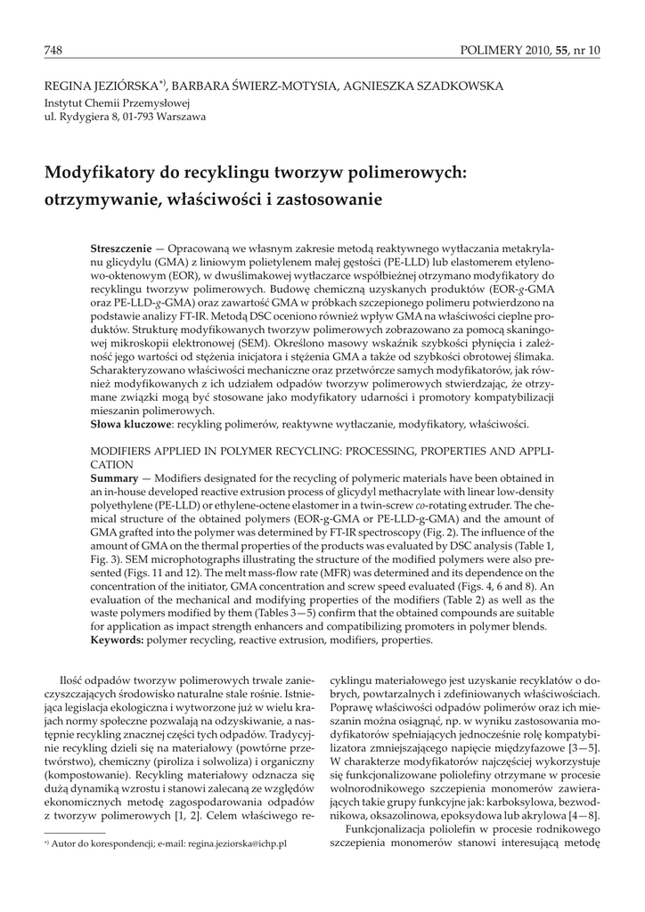 POLIMERY 2010, 55, nr 10 748 REGINA JEZIÓRSKA*), BARBARA ŒWIERZ-MOTYSIA, AGNIESZKA SZADKOWSKA Instytut Chemii Przemys³owej ul. Rydygiera 8, 01-793 Warszawa Modyfikatory do recyklingu tworzyw polimerowych: otrzymywanie, w³aœciwoœci i zastosowanie Streszczenie — Opracowan¹ we w³asnym zakresie metod¹ reaktywnego wyt³aczania metakrylanu glicydylu (GMA) z liniowym polietylenem ma³ej gêstoœci (PE-LLD) lub elastomerem etylenowo-oktenowym (EOR), w dwuœlimakowej wyt³aczarce wspó³bie¿nej otrzymano modyfikatory do recyklingu tworzyw polimerowych. Budowê chemiczn¹ uzyskanych produktów (EOR-g-GMA oraz PE-LLD-g-GMA) oraz zawartoœæ GMA w próbkach szczepionego polimeru potwierdzono na podstawie analizy FT-IR. Metod¹ DSC oceniono równie¿ wp³yw GMA na w³aœciwoœci cieplne produktów. Strukturê modyfikowanych tworzyw polimerowych zobrazowano za pomoc¹ skaningowej mikroskopii elektronowej (SEM). Okreœlono masowy wskaŸnik szybkoœci p³yniêcia i zale¿noœæ jego wartoœci od stê¿enia inicjatora i stê¿enia GMA a tak¿e od szybkoœci obrotowej œlimaka. Scharakteryzowano w³aœciwoœci mechaniczne oraz przetwórcze samych modyfikatorów, jak równie¿ modyfikowanych z ich udzia³em odpadów tworzyw polimerowych stwierdzaj¹c, ¿e otrzymane zwi¹zki mog¹ byæ stosowane jako modyfikatory udarnoœci i promotory kompatybilizacji mieszanin polimerowych. S³owa kluczowe: recykling polimerów, reaktywne wyt³aczanie, modyfikatory, w³aœciwoœci. MODIFIERS APPLIED IN POLYMER RECYCLING: PROCESSING, PROPERTIES AND APPLICATION Summary — Modifiers designated for the recycling of polymeric materials have been obtained in an in-house developed reactive extrusion process of glicydyl methacrylate with linear low-density polyethylene (PE-LLD) or ethylene-octene elastomer in a twin-screw co-rotating extruder. The chemical structure of the obtained polymers (EOR-g-GMA or PE-LLD-g-GMA) and the amount of GMA grafted into the polymer was determined by FT-IR spectroscopy (Fig. 2). The influence of the amount of GMA on the thermal properties of the products was evaluated by DSC analysis (Table 1, Fig. 3). SEM microphotographs illustrating the structure of the modified polymers were also presented (Figs. 11 and 12). The melt mass-flow rate (MFR) was determined and its dependence on the concentration of the initiator, GMA concentration and screw speed evaluated (Figs. 4, 6 and 8). An evaluation of the mechanical and modifying properties of the modifiers (Table 2) as well as the waste polymers modified by them (Tables 3—5) confirm that the obtained compounds are suitable for application as impact strength enhancers and compatibilizing promoters in polymer blends. Keywords: polymer recycling, reactive extrusion, modifiers, properties. Iloœæ odpadów tworzyw polimerowych trwale zanieczyszczaj¹cych œrodowisko naturalne stale roœnie. Istniej¹ca legislacja ekologiczna i wytworzone ju¿ w wielu krajach normy spo³eczne pozwalaj¹ na odzyskiwanie, a nastêpnie recykling znacznej czêœci tych odpadów. Tradycyjnie recykling dzieli siê na materia³owy (powtórne przetwórstwo), chemiczny (piroliza i solwoliza) i organiczny (kompostowanie). Recykling materia³owy odznacza siê du¿¹ dynamik¹ wzrostu i stanowi zalecan¹ ze wzglêdów ekonomicznych metodê zagospodarowania odpadów z tworzyw polimerowych [1, 2]. Celem w³aœciwego re*) Autor do korespondencji; e-mail: [email protected] cyklingu materia³owego jest uzyskanie recyklatów o dobrych, powtarzalnych i zdefiniowanych w³aœciwoœciach. Poprawê w³aœciwoœci odpadów polimerów oraz ich mieszanin mo¿na osi¹gn¹æ, np. w wyniku zastosowania modyfikatorów spe³niaj¹cych jednoczeœnie rolê kompatybilizatora zmniejszaj¹cego napiêcie miêdzyfazowe [3—5]. W charakterze modyfikatorów najczêœciej wykorzystuje siê funkcjonalizowane poliolefiny otrzymane w procesie wolnorodnikowego szczepienia monomerów zawieraj¹cych takie grupy funkcyjne jak: karboksylowa, bezwodnikowa, oksazolinowa, epoksydowa lub akrylowa [4—8]. Funkcjonalizacja poliolefin w procesie rodnikowego szczepienia monomerów stanowi interesuj¹c¹ metodê POLIMERY 2010, 55, nr 10 kompatybilizacji in situ poliolefin z innymi polimerami a zw³aszcza poliestrami. Tematyka ta jest przedmiotem badañ wielu oœrodków naukowych, a tak¿e licznych doniesieñ literaturowych [4, 9—13]. Dotycz¹ one w szczególnoœci procesu funkcjonalizacji poliolefin (PP, PE-HD, PE-LD), oceny efektywnoœci procesu szczepienia oraz w³aœciwoœci produktów funkcjonalizacji. Wœród monomerów zawieraj¹cych grupy funkcyjne, stosowanych w procesie funkcjonalizacji poliolefin, du¿ym zainteresowaniem cieszy siê dwufunkcyjny monomer jakim jest metakrylan glicydylu (GMA) [14—18]. Proces wolnorodnikowego szczepienia poliolefin przebiega w tym przypadku kosztem obecnego w ³añcuchu GMA podwójnego wi¹zania. Jednoczeœnie, funkcjonalizowany polimer mo¿e byæ promotorem reakcji kompatybilizacji w mieszaninach dziêki istniej¹cemu elektrofilowemu ugrupowaniu epoksydowemu w GMA, ³atwo reaguj¹cemu z nukleofilowymi grupami: karboksylowymi, aminowymi lub wodorotlenowymi. W literaturze opisano badania funkcjonalizacji: kopolimerów etylenowo-propylenowych, polietylenu PE-HD i PE-LD oraz elastomerów styren-butadien-styren (SBS) metod¹ wolnorodnikowego szczepienia GMA z udzia³em ró¿nego typu inicjatorów, równie¿ w obecnoœci komonomerów zawieraj¹cych wi¹zania podwójne (styren lub diwinylobenzen), które, bêd¹c donorami elektronów, zwiêkszaj¹ efektywnoœæ szczepienia GMA, eliminuj¹c jednoczeœnie konkurencyjn¹ reakcjê homopolimeryzacji GMA [4, 9—12, 14—18]. Przedmiotem naszej pracy by³o otrzymywanie, stosowanych w procesie recyklingu materia³owego, modyfikatorów tworzyw polimerowych, tj. funkcjonalizowanych metakrylanem glicydylu poliolefin [liniowego polietylenu ma³ej gêstoœci (PE-LLD) oraz elastomeru etylenowo-oktenowego (EOR)]. Modyfikatory wytwarzano metod