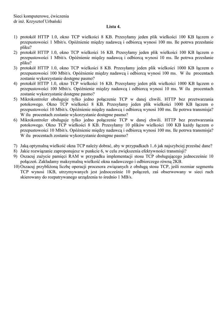 Sieci komputerowe, ćwiczenia dr inŜ. Krzysztof Urbański Lista 4. 1) protokół HTTP 1.0, okno TCP wielkości 8 KB. Przesyłamy jeden plik wielkości 100 KB łączem o przepustowości 1 Mbit/s. Opóźnienie między nadawcą i odbiorcą wynosi 100 ms. Ile potrwa przesłanie pliku? 2) protokół HTTP 1.0, okno TCP wielkości 16 KB. Przesyłamy jeden plik wielkości 100 KB łączem o przepustowości 1 Mbit/s. Opóźnienie między nadawcą i odbiorcą wynosi 10 ms. Ile potrwa przesłanie pliku? 3) protokół HTTP 1.0, okno TCP wielkości 8 KB. Przesyłamy jeden plik wielkości 1000 KB łączem o przepustowości 100 Mbit/s. Opóźnienie między nadawcą i odbiorcą wynosi 100 ms. W ilu procentach zostanie wykorzystanie dostępne pasmo? 4) protokół HTTP 1.0, okno TCP wielkości 16 KB. Przesyłamy jeden plik wielkości 1000 KB łączem o przepustowości 100 Mbit/s. Opóźnienie między nadawcą i odbiorcą wynosi 10 ms. W ilu procentach zostanie wykorzystanie dostępne pasmo? 5) Mikrokontroler obsługuje tylko jedno połączenie TCP w danej chwili. HTTP bez przetwarzania potokowego. Okno TCP wielkości 8 KB. Przesyłamy jeden plik wielkości 1000 KB łączem o przepustowości 10 Mbit/s. Opóźnienie między nadawcą i odbiorcą wynosi 100 ms. Ile potrwa transmisja? W ilu procentach zostanie wykorzystanie dostępne pasmo? 6) Mikrokontroler obsługuje tylko jedno połączenie TCP w danej chwili. HTTP bez przetwarzania potokowego. Okno TCP wielkości 8 KB. Przesyłamy 10 plików wielkości 100 KB kaŜdy łączem o przepustowości 10 Mbit/s. Opóźnienie między nadawcą i odbiorcą wynosi 100 ms. Ile potrwa transmisja? W ilu procentach zostanie wykorzystanie dostępne pasmo? 7) Jaką optymalną wielkość okna TCP naleŜy dobrać, aby w przypadkach 1..6 jak najszybciej przesłać dane? 8) Jakie rozwiązanie zaproponujesz w punkcie 6, w celu zwiększenia efektywności transmisji? 9) Oszacuj zuŜycie pamięci RAM w przypadku implementacji stosu TCP obsługującego jednocześnie 10 połączeń. Zakładamy maksymalną wielkość okna nadawczego i odbiorczego równą 2KB. 10) Oszacuj przybliŜoną liczbę operacji procesora związanych z obsługą stosu TCP, jeśli rozmiar segmentu TCP wynosi 1KB, utrzymywanych jest jednocześnie 10 połączeń, zaś obserwowany w sieci ruch skierowany do rozpatrywanego urządzenia to średnio 1 MB/s.