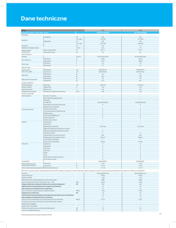 Dane techniczne SERIA ECO AR09KSFPEWQNZE Oznaczenie (jedn. wewn./jedn. zewn.) Parametry Chłodzenie Wydajność kW min.-maks. Ogrzewanie kW min.-maks. ECO AR12KSFPEWQNZE 2,50 3,50 1,10~3,30 1,10~4,00 3,20 3,50 1,05~4,40 1,05~4,80 Osuszanie l/h 0,9 1,2 Wydajność wentylatora (maks.) m3/min 10,5 11,5 Poziom ciśnienia akustycznego Wewn. (wysoki/niski) dB 38 / 21 42 / 21 Zewnętrzna (maks.) dB 46 48 1Φ, 220-240V/50Hz 1Φ, 220-240V/50Hz Dane elektryczne Zasilanie V/Hz/Φ Chłodzenie W 780,0 1270,0 Ogrzewanie W 910,0 1000,0 Chłodzenie A 3,6 5,6 Ogrzewanie A 4,1 4,4 Wewnętrzna mm 820*285*215 820*285*215 Zewnętrzna mm 660*475*242 660*475*242 Wewnętrzna kg 8,2 8,2 Zewnętrzna kg 22,5 22,5 Wewnętrzna kg 9,8 9,8 Zewnętrzna kg 22,7 22,7 Średnica przyłączy Ciecz/gaz mm 6,35/9,52 6,35/9,52 Długość instalacji Maksymalna m 15,0 15,0 Różnica poziomów Maksymalna m 8,0 8,0 Dodatkowa ilość czynnika Powyżej 5 mb długości linii freonowej g/mb 15,0 15,0 Moc elektryczna Pobór prądu Wymiary i waga Wymiary netto (szer. x wys. x głęb.) Waga netto Waga brutto (transportowa) Instalacja chłodnicza Funkcje i technologie Jakość powietrza Jonizator Virus Doctor – – Neo Triple Filter (Easy filter Plus) – – Easy Filter – – 3 CareFilter(HD 60) 3 CareFilter(HD 60) 3-CARE Filter Oszczędność energii Komfort Automatyczne osuszanie wymiennika • • Wskaźnik czyszczenia filtra – – Funkcja 2 step cooling • • Technologia Advanced Digital Inverter • • Silnik 8-polowy • • Technologia POWERboost™ • • Funkcja single user • • Odczyt zużycia energii – – Funkcja Wi-Fi – – Smart home – – Wyświetlacz temperatury 3 Led Lamp 3 Led Lamp Włączanie/wyłączanie wyświetlacza na panelu – – Włączanie/wyłączanie dźwięku komunikatu • Funkcja good sleep Tryby pracy • • Regulacja kierunku żaluzji poziomych Auto Auto Regulacja kierunku żaluzji pionowych Manual Manual Liczba biegów wentylatora 4 4 Zegar czasu rzeczywistego 24 Hour 24 Hour Chłodzenie • • Ogrzewanie • • Cyrkulacja • • Osuszanie • • Cichy • • Auto • • Automatyczna zmiana trybu pracy • • Automatyczny restart • • BLDC ROTARY BLDC ROTARY Typ sprężarki Zakres temperatur pracy dla jednostki zewnętrznej Chłodzenie 0 -5~46 -5~46 Ogrzewanie 0 -10~24 -10~24 0 16 ~ 30 16 ~ 30 Zakres nastaw temperatury wewnętrznej Chłodzenie/Ogrzewanie C C C Informacje o produkcie zgodnie z Dyrektywą WE (EU) Nr. 626/2011. Etykiety energetyczne oraz dane dotyczące urządzeń dostępne są na http://www.samsung.com/global/business/system-air-conditioner/energylabel/# Producent Samsung Electronics Samsung Electronics Czynnik chłodniczy* R410A R410A Współczynnik GWP >150 >150 GWP (współczynnik ocieplenia globalnego czynnika chłodniczego) 2088 2088 Poziom mocy akustycznej (jedn. wewn./jedn. zew.) – maks. dBA 56/63 59/65 Pdesignc (deklarowana wydajność chłodnicza dla warunków katalogowych) kW 2,50 3,50 SEER (wskaźnik sezonowej efektywności energetycznej/chłodzenie) 5,6 5,6 Klasa energetyczna/chłodzenie/sezon umiarkowany A+ A+ 156,0 219,0 2,5 3,5 3,8 3,8 QCE (roczne zużycie energii elektrycznej na potrzeby chłodzenia) kWh/a Pdesignh (sezon umiarkowany) kW SCOP (wskaźnik sezonowej efektywności energetycznej/ogrzewanie/sezon umiarkowany) Klasa energetyczna/ogrzewanie/sezon umiarkowany A A 811,0 811,0 Pozostałe sezony grzewcze, dla których producent deklaruje dane urządzeń – – Pdesignh (sezon ciepły) kW – – Pdesignh (sezon chłodny) kW – – QHE (roczne zużycie energii elektrycznej na potrzeby ogrzewania/sezon umiarkowany) kWh/a Deklarowana wydajność grzewcza dla warunków katalogowych kW 2.3 2.4 Łączna moc grzałek elektrycznych kW 0 0 *Produkty zawierają fluorowane gazy cieplarniane (R410A) 41 ECO Biały Główne funkcje Digital Inverter 40 Triple Protector Plus • 5 lat gwarancji • Oszczędność • Cisza Funkcja good’sleep Filtr HD Easy Filter