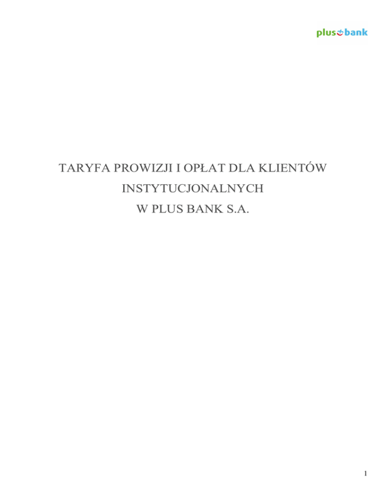 TARYFA PROWIZJI I OPŁAT DLA KLIENTÓW INSTYTUCJONALNYCH W PLUS BANK S.A. 1 SPIS TREŚCI: Ogólne zasady pobierania prowizji i opłat dla Klientów Instytucjonalnych w PLUS BANK S.A. I. DEPOZYTY 1. Rachunki 1.1 Rachunek biznes 1.1.2 Rachunki w formie pakietu 1.1.3 Rachunek lokacyjny biznes 1.1.4 Rachunki depozytowe bonów skarbowych 2. Rozliczenia pieniężne 2.1 Wpłaty gotówkowe 2.2 Wypłaty gotówkowe 2.3 Czeki 2.4 Przelewy i zlecenia płatnicze 2.4.1 Przelewy krajowe 2.4.2 Polecenie zapłaty 2.4.3 Program przelewy masowe 2.4.4 Polecenia wypłaty w obrocie dewizowym 3. System bankowości elektronicznej 3.1 plusbank24 3.1.1 Identyfikator 3.1.2 Hasła 3.1.3 Autoryzacja 3.1.4 Przelewy i zlecenia płatnicze 3.1.5 Polecenie wypłaty w obrocie dewizowym zlecone w plusbank24 3.1.6 Doładowanie telefonu komórkowego 3.1.7 Aktywacja karty 3.2 p@rtner24 - homebanking 4. Karty płatnicze 4.1 Karta Visa Business II. KREDYTY I GWARANCJE 5. Kredyty 5.1 Udzielenie kredytu 5.2 Zmiany warunków kredytowania na wniosek klienta 5.3 Inne usługi związane z prowadzeniem rachunków kredytowych 6. Gwarancje III INNE USŁUGI 7 Informacje i zaświadczenia 8 Monity i wezwania 9 Blokada środków na rachunku 10 Pozostałe usługi 11 Zryczałtowane opłaty telekomunikacyjne, pocztowe i kurierskie 11.1 Zryczałtowane opłaty telekomunikacyjne 11.2 Zryczałtowane opłaty pocztowe 11.3 Zryczałtowane opłaty kurierskie 2 Ogólne zasady pobierania prowizji i opłat dla Klientów Instytucjonalnych w PLUS BANK S.A. obowiązuje od dnia 31.03.2015 r. 1. Niniejsza Taryfa dotyczy: rezydentów będących osobami fizycznymi prowadzącymi działalność gospodarczą, osobami prawnymi (z wyłączeniem banków krajowych) jednostkami organizacyjnymi nie posiadającymi osobowości prawnej, nierezydentów (z wyłączeniem osób fizycznych i banków zagranicznych). 2. Wszelkie opłaty i prowizje pokrywa Klient – zleceniodawca czynności bankowych, chyba że strony umówiły się inaczej. Opłaty i prowizje prezentowane są w Taryfie w kwocie brutto. 3. Bank nie pobiera opłat i prowizji za: otwarcie i prowadzenie rachunku na rzecz Organizacji pożytku publicznego - w rozumieniu przepisów Ustawy z dnia 24 kwietnia 2003 r. o działalności pożytku publicznego i o wolontariacie (DZ. U. Nr 96, poz. 873) oraz Ustawy –Przepisy wprowadzające ustawę o działalności pożytku publicznego i o wolontariacie (Dz. U. Nr 96, poz. 874). wpłaty związane ze spłatą zobowiązań wobec Banku (w tym kredytów i odsetek), przygotowanie, sporządzenie i przekazanie informacji o kliencie i/lub prowadzonych rachunkach bankowych uprawnionym osobom, organom i instytucjom gdy udzielanie informacji następuje na żądanie: sądu lub prokuratury w toku postępowania karnego lub postępowania w sprawie o przestępstwo skarbowe • przeciwko osobie fizycznej będącej stroną umowy; prokuratury w sprawach dotyczących wykorzystywania działalności banków do celów mających związek • z przestępstwem, o którym mowa w art. 299 ustawy z dnia 6 czerwca 1997 r.-kodeks karny; Generalnego Inspektora Kontroli Skarbowej, Dyrektora Urzędu Kontroli Skarbowej oraz Naczelnika Urzędu • Skarbowego w zakresie uregulowanym w odrębnych ustawach; Zakładu Ubezpieczeń Społecznych w sprawach dotyczących numerów rachunków bankowych płatników • składek oraz danych umożliwiających identyfikację posiadaczy tych rachunków; Służb Ochrony Państwa, Agencji Wywiadu, Policji, Żandarmerii Wojskowej, Straży Granicznej i Służby • Więziennej w związku z postępowaniami sprawdzającymi na podstawie przepisów o ochronie informacji niejawnych. 4. Bank zastrzega sobie prawo, bez odrębnej dyspozycji Posiadacza rachunku, do obciążania rachunku kwotami z tytułu bankowych opłat i prowizji. 5. Za usługi nietypowe, nieprzewidziane w Taryfie, Oddziały mogą pobierać opłaty, których wysokość ustalają we własnym zakresie Dyrektorzy Oddziałów. 6. Niezależnie od prowizji lub opłat ustalonych w Taryfie Bank pobiera również: zryczałtowane opłaty stanowiące pokrycie ponoszonych przez Bank kosztów pocztowych telekomunikacyjnych w obrocie krajowym i zagranicznym, prowizje i opłaty na rzecz innych banków (krajowych i zagranicznych) pośredniczących w wykonaniu zlecenia, zgodnie z obowiązującymi taryfami tych banków lub według odrębnie zawartych porozumień, 7. Opłaty i prowizje za poszczególne czynności pobierane są po ich wykonaniu, za wyjątkiem opłaty za przyjęcie i rozpatrzenie wniosku o udzielenie/odnowienie kredytu, podwyższenie kwoty kredytu, prolongatę terminu spłaty (wydłużenie okresu obowiązywania umowy), wystawienie promesy kredytu, zmianę warunków kredytowania, prowizji za administrowanie kredytem oraz za wystawienie gwarancji, które są pobierane z góry. Prowizje i opłaty za prowadzenie rachunku oraz opłaty cykliczne, pobierane są ostatniego dnia kalendarzowego każdego miesiąca z wyjątkiem prowizji za gotowość, która pobierana jest pierwszego dnia miesiąca za miesiąc poprzedni. W przypadku pozytywnej decyzji w sprawie zmiany warunków kredytowania pobrana opłata za rozpatrzenie wniosku zaliczana jest na poczet prowizji za wykonanie danej czynności. 8. W przypadku braku na rachunku środków na pokrycie prowizji i opłat pobieranych cyklicznie, Bank pobierze je z pierwszych wypływów na rachunek. 9. Bank może odmówić wykonania czynności zleconej przez Posiadacza rachunku w przypadku braku środków na zapłatę prowizji lub opłaty za tą czynność. 10. Pobierane opłaty i prowizje nie podlegają zwrotowi. 3 11. Niepobranie opłaty lub prowizji w terminach określonych w niniejszej Taryfie nie ogranicza możliwości ich pobrania w terminach późniejszych. 12. Klient jest obciążany opłatami i prowizjami na następujących zasadach: 1. gdy opłaty i prowizje są pobierane z rachunku złotowego: a. dla opłat i prowizji wyrażonych w złotych – kwotą wynikającą z Taryfy, b. dla opł