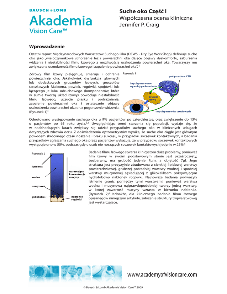 Akademia Vision Care™ Suche oko Część I Współczesna ocena kliniczna Jennifer P. Craig Wprowadzenie Ostatni raport Międzynarodowych Warsztatów Suchego Oka (DEWS - Dry Eye WorkShop) definiuje suche oko jako „wieloczynnikowe schorzenie łez i powierzchni oka dające objawy dyskomfortu, zaburzenia widzenia i niestabilności filmu łzowego z możliwością uszkodzenia powierzchni oka. Towarzyszy mu zwiększona osmolarność filmu łzowego i zapalenie powierzchni oka”. 1 Zdrowy film łzowy pielęgnuje, smaruje i ochrania powierzchnię oka. Jakakolwiek dysfunkcja głównych lub dodatkowych gruczołów łzowych, gruczołów tarczkowych Maiboma, powiek, rogówki, spojówki lub łączącego je łuku odruchowego (komponentów, które w sumie tworzą układ łzowy) powoduje niestabilność filmu łzowego, uczucie piasku i podrażnienia, zapalenie powierzchni oka i ostatecznie objawy uszkodzenia powierzchni oka oraz pogorszenie widzenia. (Rysunek 1)2 Odnotowano występowanie suchego oka u 9% pacjentów po czterdziestce, oraz zwiększenie do 15% u pacjentów po 65 roku życia.3,4 Uwzględniając trend starzenia się populacji, wydaje się, że w nadchodzących latach zwiększy się udział przypadków suchego oka w klinicznych usługach dotyczących zdrowia oczu. Z doświadczenia optometrystów wynika, że suche oko ciągle jest głównym powodem skróconego czasu noszenia i braku sukcesu, w przypadku soczewek kontaktowych, a badania przypadków zgłaszania suchego oka przez pacjentów wykazują, że w przypadku soczewek kontaktowych występuje ono w 50%, podczas gdy u osób nie noszących soczewek kontaktowych jedynie w 25%.5 Badanie filmu łzowego stwarza klinicystom duże problemy, ponieważ film łzowy w swoim podstawowym stanie jest przeźroczysty, bezbarwny, ma grubość jedynie 7μm, a objętość 7μl. Jego struktura jest precyzyjnie zbudowana z cienkiej lipidowej warstwy powierzchniowej, grubszej pośredniej warstwy wodnej i spodniej warstwy mucynowej sąsiadującej z glikokaliksem pokrywającym hydrofobowy nabłonek rogówki. Najnowsze badania podważyły istnienie granic pomiędzy tymi warstwami, ponieważ warstwa wodna i mucynowa najprawdopodobniej tworzy jedną warstwę, w której zawartość mucyny wzrasta w kierunku nabłonka. (Rysunek 2)6 Jednakże, dla klinicznego badania filmu łzowego opisanegow niniejszym artykule, założenie struktury trójwarstwowej jest wystarczające. www.academyofvisioncare.com © Bausch & Lomb Akademia Vision CareTM 2009 Akademia Vision Care™ Normalny, podstawowy (niewymuszony) przepływ filmu łzowego wynosi niewiele ponad 1μl na minutę, a szybkość wymiany w minucie wynosi około 16%, ale może się on zwiększyć stukrotnie po uruchomieniu łzawienia odruchowego.7,8 Takie łzy odruchowe wywołane inwazyjnym badaniem, różnią się składem od zwykłych łez i w konsekwencji mogą niekorzystnie wpłynąć na wartości wyników testu. ETIOLOGIA SUCHEGO OKA Choć pacjenci z suchym okiem odczuwają podobne objawy suchości, piasku pod powiekami, podrażnienia i pieczenia, przyczyny mogą być różne. Podobnie jak raport National Eye Institute z przemysłowego sympozjum na temat prób klinicznych z suchym okiem, z roku 1995, raport DEWS z roku 2007 również potwierdza, że suche oko jest schorzeniem wieloczynnikowym i może być zakwalifikowane do dwóch głównych grup etiologicznych: niedostateczne wydzielanie łez i nadmierne parowanie filmu łzowego.1,9 Suche oko z niedostatecznym wydzielaniem łez dzieli się na dysfunkcję gruczołów łzowych spowodowaną zespołem Sjögrena i na dysfunkcję spowodowaną innymi przyczynami, nie będącymi zespołem Sjögrena . Suche oko z nadmiernym parowaniem filmu łzowego dzieli się na powodowane przyczynami wewnętrznymi i przyczynami zewnętrznymi, przy czym czynniki wewnętrzne obejmują dysfunkcję gruczołu Meiboma (MGD) i anomalie powieki, a czynniki zewnętrzne obejmują noszenie soczewek kontaktowych i choroby powierzchni oka, takie jak alergie. (Rysunek 3) Suche oko z niedostatecznym wydzielaniem łez występuje, gdy główne lub dodatkowe gruczoły łzowe źle działają. Natomiast suche oko z nadmiernym parowaniem filmu łzowego występuje przy źle działającym gruczole Meiboma, nieregularnej powierzchni oka, nienormalnej budowie powiek lub z powodu noszenia soczewek kontaktowych.1 Soczewki kontaktowe wywołują objaw suchego oka poprzez zaburzanie warstwy lipidowej, pocienianie filmu łzowego, wysuszanie rogówki z powodu odwodnienia soczewek, nieprawidłowe zmiany w „dopasowaniu” powiek i/lub wprowadzanie zmian w mruganiu. Wszystkie soczewki kontaktowe zaburzają budowę filmu łzowego do pewnego stopnia. Podczas gdy pacjenci, którzy przed zastosowaniem soczewek posiadali zdrową powierzchnię oka i zdrowy film łzowy, mogą wytrzymać to zaburzenie, to tacy, którzy posiadają wrażliwy na zmiany system łzowy, mają większą tendencję do zgłaszania objawów suchego oka przy noszeniu soczewek kontaktowych. www.academyofvisioncare.com © Bausch & Lomb Akademia Vision CareTM 2009 Akademia Vision Care™ Suche oko z niedostatecznym wydzielaniem łez oraz suche oko z nadmiernym parowaniem filmu łzowego może występować razem, ale ważne jest ustalenie przy pomocy dokładnego badania, która przyczyna jest bardziej prawdopodobna, aby zająć się suchym okiem jak najefektywniej. SUBIEKTYWNA OCENA SUCHEGO OKA Oznaki i symptomy suchego oka często nie bardzo się zgadzają, ale wszystko uważa się za ważne przy diagnozowaniu i leczeniu suchego oka, a krytyczne znaczenie mają symptomy zgłaszane przez pacjenta, oraz to, co pacjent mówi.10 Pacjenci często sami mówią o oku suchym, piekącym, podrażnionym, z uczuciem piasku pod powiekami, oraz o rozmazanym obrazie. Jednakże ważne jest uzyskanie od nich w czasie badania dodatkowych informacji, aby ułatwić zidentyfikowanie przyczyn suchego oka. Może to być historia noszenia soczewek kontaktowych, poprzednie leczenie s