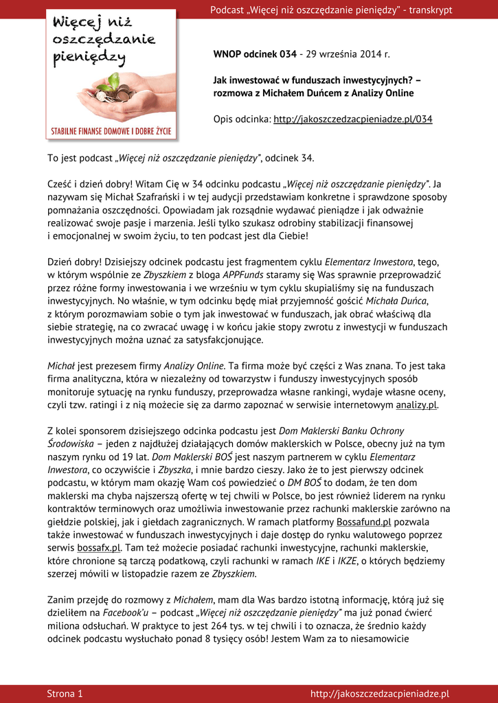 Podcast „Więcej niż oszczędzanie pieniędzy” - transkrypt ae WNOP odcinek 034 - 29 września 2014 r. Jak inwestować w funduszach inwestycyjnych? – rozmowa z Michałem Duńcem z Analizy Online Opis odcinka: http://jakoszczedzacpieniadze.pl/034 To jest podcast „Więcej niż oszczędzanie pieniędzy”, odcinek 34. Cześć i dzień dobry! Witam Cię w 34 odcinku podcastu „Więcej niż oszczędzanie pieniędzy”. Ja nazywam się Michał Szafrański i w tej audycji przedstawiam konkretne i sprawdzone sposoby pomnażania oszczędności. Opowiadam jak rozsądnie wydawać pieniądze i jak odważnie realizować swoje pasje i marzenia. Jeśli tylko szukasz odrobiny stabilizacji finansowej i emocjonalnej w swoim życiu, to ten podcast jest dla Ciebie! Dzień dobry! Dzisiejszy odcinek podcastu jest fragmentem cyklu Elementarz Inwestora, tego, w którym wspólnie ze Zbyszkiem z bloga APPFunds staramy się Was sprawnie przeprowadzić przez różne formy inwestowania i we wrześniu w tym cyklu skupialiśmy się na funduszach inwestycyjnych. No właśnie, w tym odcinku będę miał przyjemność gościć Michała Duńca, z którym porozmawiam sobie o tym jak inwestować w funduszach, jak obrać właściwą dla siebie strategię, na co zwracać uwagę i w końcu jakie stopy zwrotu z inwestycji w funduszach inwestycyjnych można uznać za satysfakcjonujące. Michał jest prezesem firmy Analizy Online. Ta firma może być części z Was znana. To jest taka firma analityczna, która w niezależny od towarzystw i funduszy inwestycyjnych sposób monitoruje sytuację na rynku funduszy, przeprowadza własne rankingi, wydaje własne oceny, czyli tzw. ratingi i z nią możecie się za darmo zapoznać w serwisie internetowym analizy.pl. Z kolei sponsorem dzisiejszego odcinka podcastu jest Dom Maklerski Banku Ochrony Środowiska – jeden z najdłużej działających domów maklerskich w Polsce, obecny już na tym naszym rynku od 19 lat. Dom Maklerski BOŚ jest naszym partnerem w cyklu Elementarz Inwestora, co oczywiście i Zbyszka, i mnie bardzo cieszy. Jako że to jest pierwszy odcinek podcastu, w którym mam okazję Wam coś powiedzieć o DM BOŚ to dodam, że ten dom maklerski ma chyba najszerszą ofertę w tej chwili w Polsce, bo jest również liderem na rynku kontraktów terminowych oraz umożliwia inwestowanie przez rachunki maklerskie zarówno na giełdzie polskiej, jak i giełdach zagranicznych. W ramach platformy Bossafund.pl pozwala także inwestować w funduszach inwestycyjnych i daje dostęp do rynku walutowego poprzez serwis bossafx.pl. Tam też możecie posiadać rachunki inwestycyjne, rachunki maklerskie, które chronione są tarczą podatkową, czyli rachunki w ramach IKE i IKZE, o których będziemy szerzej mówili w listopadzie razem ze Zbyszkiem. Zanim przejdę do rozmowy z Michałem, mam dla Was bardzo istotną informację, którą już się dzieliłem na Facebook’u – podcast „Więcej niż oszczędzanie pieniędzy” ma już ponad ćwierć miliona odsłuchań. W praktyce to jest 264 tys. w tej chwili i to oznacza, że średnio każdy odcinek podcastu wysłuchało ponad 8 tysięcy osób! Jestem Wam za to niesamowicie Strona 1 http://jakoszczedzacpieniadze.pl Podcast „Więcej niż oszczędzanie pieniędzy” - transkrypt wdzięczny. Moje ego niesamowicie... czuje się dopieszczony w momencie kiedy widzę podcast wysoko w rankingach, ale też kiedy widzę Wasze recenzje i widzę, że Wam się przydaje ta wiedza, którą staram się tutaj dzielić sam oraz z moimi gośćmi. Pod koniec odcinka będę miał dla Was jeszcze dwa ogłoszenia, a teraz już oddam głos mojemu gościowi. Chcę tylko uprzedzić, że kiedy nagrywaliśmy tę rozmowę Michała dręczyło przeziębienie, tak więc to słychać w jego głosie, ale myślę, że tym bardziej warto docenić jego poświęcenie. Zapraszam serdecznie do wysłuchania tej rozmowy! Michał Szafrański: Cześć Michale! Michał Duniec: Witaj! Michał Sz.: Powiedz Michale czym się zajmujesz, co robisz, gdzie pracujesz? Słuchacze mogą Cię jeszcze nie znać. Michał D.: Od niedawna jestem prezesem spółki Analizy Online. Spółka zajmuje się przede wszystkich analizą rynku funduszy inwestycyjnych w Polsce, ale staramy się także drobnymi kroczkami wychodzić na rynek czeski. Firma ma już 15 lat – powstała w 2000 roku, kiedy rynek funduszy czy same fundusze nie były jakoś bardzo popularne. Natomiast założyciele spółki dobrze przewidzieli, że ten segment rynku finansowego będzie się dynamicznie rozwijał i teraz w firmie pracuje już 30 osób. Tak naprawdę świadczymy różnego rodzaju usługi, od dostawy danych po przygotowywania raportów analitycznych po prowadzenie szkoleń, przygotowanie rankingów i ratingów. Może później powiemy co to takiego... Michał Sz.: Funduszy poszczególnych… Michał D.: Tak. Naszymi partnerami są głównie TFI, dystrybutorzy, banki, domy maklerskie. Mamy dosyć ugruntowaną pozycję, w tym zakresie oczywiście, na polskim rynku. Michał Sz.: Spotykamy się głównie dlatego, że Wy jesteście taką firmą, że jeżeli ktoś szuka wyników funduszy inwestycyjnych, to sięga przede wszystkim do waszych danych. Te wasze dane są wszędzie. Wy jesteście dostawcą dla zewnętrznych partnerów, ale również macie serwis w internecie, w którym można sobie te wyniki poszczególnych funduszy i Wasze analizy również zobaczyć, tak? Michał D.: To prawda. Naszą wizytówką jest serwis Analizy.pl. Serwis powstał w tej formule 5 lat temu. My uważamy, że jest sporym sukcesem. Fakt – w lipcu mieliśmy 100 tys. użytkowników i w dużej mierze osoby, które zaglądają do naszego serwisu, poszukują informacji o wynikach funduszy. Natomiast jak już wejdą do tego serwisu, no to dowiadują się, że są inne możliwości porównywania funduszy przez pryzmat innych parametrów, i w ten sposób ten serwis... Michał Sz.: Po nitce do kłębka. Strona 2 http://jakoszczedzacpieniadze.