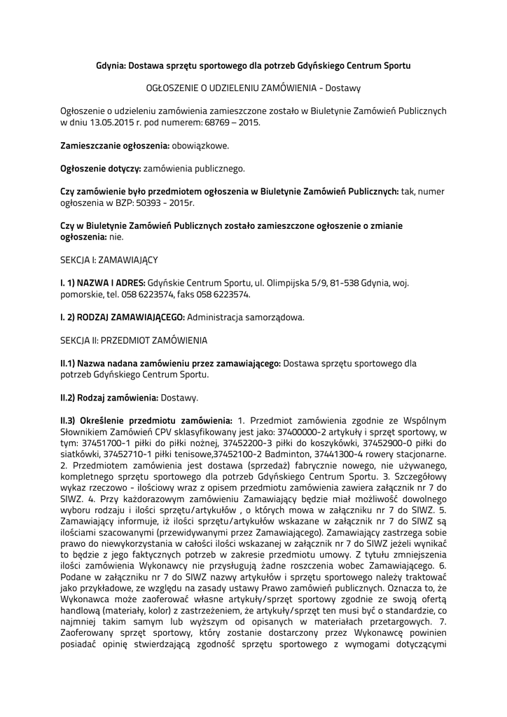Gdynia: Dostawa sprzętu sportowego dla potrzeb Gdyńskiego Centrum Sportu OGŁOSZENIE O UDZIELENIU ZAMÓWIENIA - Dostawy Ogłoszenie o udzieleniu zamówienia zamieszczone zostało w Biuletynie Zamówień Publicznych w dniu 13.05.2015 r. pod numerem: 68769 – 2015. Zamieszczanie ogłoszenia: obowiązkowe. Ogłoszenie dotyczy: zamówienia publicznego. Czy zamówienie było przedmiotem ogłoszenia w Biuletynie Zamówień Publicznych: tak, numer ogłoszenia w BZP: 50393 - 2015r. Czy w Biuletynie Zamówień Publicznych zostało zamieszczone ogłoszenie o zmianie ogłoszenia: nie. SEKCJA I: ZAMAWIAJĄCY I. 1) NAZWA I ADRES: Gdyńskie Centrum Sportu, ul. Olimpijska 5/9, 81-538 Gdynia, woj. pomorskie, tel. 058 6223574, faks 058 6223574. I. 2) RODZAJ ZAMAWIAJĄCEGO: Administracja samorządowa. SEKCJA II: PRZEDMIOT ZAMÓWIENIA II.1) Nazwa nadana zamówieniu przez zamawiającego: Dostawa sprzętu sportowego dla potrzeb Gdyńskiego Centrum Sportu. II.2) Rodzaj zamówienia: Dostawy. II.3) Określenie przedmiotu zamówienia: 1. Przedmiot zamówienia zgodnie ze Wspólnym Słownikiem Zamówień CPV sklasyfikowany jest jako: 37400000-2 artykuły i sprzęt sportowy, w tym: 37451700-1 piłki do piłki nożnej, 37452200-3 piłki do koszykówki, 37452900-0 piłki do siatkówki, 37452710-1 piłki tenisowe,37452100-2 Badminton, 37441300-4 rowery stacjonarne. 2. Przedmiotem zamówienia jest dostawa (sprzedaż) fabrycznie nowego, nie używanego, kompletnego sprzętu sportowego dla potrzeb Gdyńskiego Centrum Sportu. 3. Szczegółowy wykaz rzeczowo - ilościowy wraz z opisem przedmiotu zamówienia zawiera załącznik nr 7 do SIWZ. 4. Przy każdorazowym zamówieniu Zamawiający będzie miał możliwość dowolnego wyboru rodzaju i ilości sprzętu/artykułów , o których mowa w załączniku nr 7 do SIWZ. 5. Zamawiający informuje, iż ilości sprzętu/artykułów wskazane w załącznik nr 7 do SIWZ są ilościami szacowanymi (przewidywanymi przez Zamawiającego). Zamawiający zastrzega sobie prawo do niewykorzystania w całości ilości wskazanej w załącznik nr 7 do SIWZ jeżeli wynikać to będzie z jego faktycznych potrzeb w zakresie przedmiotu umowy. Z tytułu zmniejszenia ilości zamówienia Wykonawcy nie przysługują żadne roszczenia wobec Zamawiającego. 6. Podane w załączniku nr 7 do SIWZ nazwy artykułów i sprzętu sportowego należy traktować jako przykładowe, ze względu na zasady ustawy Prawo zamówień publicznych. Oznacza to, że Wykonawca może zaoferować własne artykuły/sprzęt sportowy zgodnie ze swoją ofertą handlową (materiały, kolor) z zastrzeżeniem, że artykuły/sprzęt ten musi być o standardzie, co najmniej takim samym lub wyższym od opisanych w materiałach przetargowych. 7. Zaoferowany sprzęt sportowy, który zostanie dostarczony przez Wykonawcę powinien posiadać opinię stwierdzającą zgodność sprzętu sportowego z wymogami dotyczącymi bezpieczeństwa i higieny użytkowania zgodnie z ustawą z dnia 12 grudnia 2003 r. o ogólnym bezpieczeństwie produktów (t.j. Dz. U. z 2015 poz. 322). 8. Zaoferowany sprzęt sportowy, który zostanie dostarczony przez Wykonawcę powinien posiadać wymagane przez Zamawiającego atesty lub certyfikaty zgodności z wymogami tj.: a) ITTF (Międzynarodowej Federacji Tenisa Stołowego) na sprzęt sportowy wskazany w załączniku nr 7 do SIWZ w pkt. 2 tj. piłeczki do tenisa stołowego (turniejowe), potwierdzające, że zostały zaaprobowane przez tą federację, b) FIVB (Międzynarodowej Federacji Piłki Siatkowej) na sprzęt sportowy wskazany w załączniku nr 7 do SIWZ w pkt. 7 tj. piłki do siatkówki plażowej (turniejowe), potwierdzające, że zostały zaaprobowane przez tą federację, c) FIVB (Międzynarodowej Federacji Piłki Siatkowej) na sprzęt sportowy wskazany w załączniku nr 7 do SIWZ pkt. 9 tj. piłki do siatkówki halowej (meczowe), potwierdzające, że zostały zaaprobowane przez tą federację, d) IFF (Międzynarodowa Federacja Unihokeja) na sprzęt sportowy wskazany w załączniku nr 7 do SIWZ w pkt. 13 tj. piłki do unihokeja, potwierdzające, że zostały zaaprobowane przez tą federację, 9. Wykonawca w ramach zamówienia zobowiązany będzie dostarczyć piłki, o których mowa w załączniku nr 7 do SIWZ w punktach od 7 do 14, napompowane. 10. Wymagania co do sposobu świadczenia dostawy: 1) dostawa przedmiotu zamówienia będzie realizowana sukcesywnie, zgodnie z zapotrzebowaniem Zamawiającego i na każdorazowe jego wezwanie, 2) przy każdorazowym zamówieniu Zamawiający będzie miał możliwość dowolnego wyboru ilości produktów, o których mowa w załączniku nr 7 do SIWZ. 3) dostawy przedmiotu zamówienia realizowane będą w ciągu 48 godzin od momentu złożenia zapotrzebowania /zgłoszenie telefonicznie potwierdzone faksem lub mailem/ i dostarczane bezpośrednio do siedziby Zamawiającego, w godzinach urzędowania tj. pomiędzy 7:30 a 15:30, w przypadku zgłoszenia zapotrzebowania w piątek dostawa nastąpi w najbliższy poniedziałek do godz. 12:00, 4) w przypadku stwierdzenia niezgodności ilościowych, pomyłek, uszkodzenia lub wad jakościowych otrzymanego towaru Zamawiający postawi towar do dyspozycji Wykonawcy, oraz niezwłocznie/zgłoszenie telefoniczne potwierdzone faksem lub mailem/ powiadomi Wykonawcę o stwierdzonych brakach i wadach w towarze, 5) Wykonawca będzie zobowiązany w terminie 24 godzin od wpłynięcia reklamacji, /zgłoszenie telefoniczne, potwierdzone faksem lub mailem/ dostarczyć zastępczą partię towaru wolną od wad bezpośrednio do siedziby Zamawiającego, w godzinach jego urzędowania tj. pomiędzy 07:30 a 15.30, w przypadku zgłoszenia reklamacji w piątek dostawa nastąpi w najbliższy poniedziałek do godz. 12:00, 6) wykaz osób upoważnionych do składania zapotrzebowania i odbioru towaru oraz do podpisywania i odbioru faktur w imieniu Zamawiającego zawierać będzie załącznik nr 2 do umowy, 7) Wykonawca zobowiązany będzie do realizacji dostaw na własny