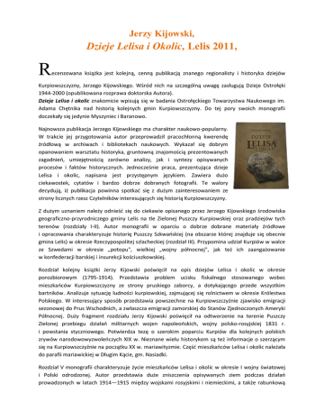 Jerzy Kijowski, Dzieje Lelisa i Okolic, Lelis 2011, R ecenzowana książka jest kolejną, cenną publikacją znanego regionalisty i historyka dziejów Kurpiowszczyzny, Jerzego Kijowskiego. Wśród nich na szczególną uwagę zasługują Dzieje Ostrołęki 1944-2000 (opublikowana rozprawa doktorska Autora). Dzieje Lelisa i okolic znakomicie wpisują się w badania Ostrołęckiego Towarzystwa Naukowego im. Adama Chętnika nad historią kolejnych gmin Kurpiowszczyzny. Do tej pory swoich monografii doczekały się jedynie Myszyniec i Baranowo. Najnowsza publikacja Jerzego Kijowskiego ma charakter naukowo-popularny. W trakcie jej przygotowania autor przeprowadził pracochłonną kwerendę źródłową w archiwach i bibliotekach naukowych. Wykazał się dobrym opanowaniem warsztatu historyka, gruntowną znajomością prezentowanych zagadnień, umiejętnością zarówno analizy, jak i syntezy opisywanych procesów i faktów historycznych. Jednocześnie praca, prezentująca dzieje Lelisa i okolic, napisana jest przystępnym językiem. Zawiera dużo ciekawostek, cytatów i bardzo dobrze dobranych fotografii. Te walory decydują, iż publikacja powinna spotkać się z dużym zainteresowaniem ze strony licznych rzesz Czytelników interesujących się historią Kurpiowszczyzny. Z dużym uznaniem należy odnieść się do ciekawie opisanego przez Jerzego Kijowskiego środowiska geograficzno-przyrodniczego gminy Lelis na tle Zielonej Puszczy Kurpiowskiej oraz pradziejów tych terenów (rozdziały I-II). Autor monografii w oparciu o dobrze dobrane materiały źródłowe i opracowania charakteryzuje historię Puszczy Szkwańskiej (na obszarze której znajduje się obecnie gmina Lelis) w okresie Rzeczypospolitej szlacheckiej (rozdział III). Przypomina udział Kurpiów w walce ze Szwedami w okresie „potopu", wielkiej „wojny północnej", jak też ich zaangażowanie w konfederacji barskiej i insurekcji kościuszkowskiej. Rozdział kolejny książki Jerzy Kijowski poświęcił na opis dziejów Lelisa i okolic w okresie porozbiorowym (1795-1914). Przedstawia problem ucisku fiskalnego stosowanego wobec mieszkańców Kurpiowszczyzny ze strony pruskiego zaborcy, a dotykającego przede wszystkim bartników. Analizuje sytuację ludności kurpiowskiej, zajmującej się rolnictwem w okresie Królestwa Polskiego. W interesujący sposób przedstawia powszechne na Kurpiowszczyźnie zjawisko emigracji sezonowej do Prus Wschodnich, a zwłaszcza emigracji zamorskiej do Stanów Zjednoczonych Ameryki Północnej. Duży fragment rozdziału Jerzy Kijowski poświęcił na odtworzenie na terenie Puszczy Zielonej przebiegu działań militarnych wojen napoleońskich, wojny polsko-rosyjskiej 1831 r. i powstania styczniowego. Potwierdza tezę o szerokim poparciu Kurpiów dla kolejnych polskich zrywów narodowowyzwoleńczych XIX w. Nieznane wielu historykom są też informacje o szerzącym się na Kurpiowszczyźnie na początku XX w. mariawityzmie. Część mieszkańców Lelisa i okolic należała do parafii mariawickiej w Długim Kącie, gm. Nasiadki. Rozdział V monografii charakteryzuje życie mieszkańców Lelisa i okolic w okresie I wojny światowej i Polski odrodzonej. Autor przedstawia duże zniszczenia opisywanych ziem podczas działań prowadzonych w latach 1914—1915 między wojskami rosyjskimi i niemieckimi, a także rabunkową politykę niemieckiego okupanta na Kurpiowszczyźnie. Podobne zniszczenia odnotowano podczas najazdu bolszewickiego na Polskę w sierpniu 1920 roku. Życie mieszkańców Lelisa i okolic w latach II RP zostało głównie omówione na tle wydarzeń politycznych, zagadnień gospodarczych, oświatowych i religijnych. Pewien niedosyt wiąże się natomiast z brakiem chociażby krótkiej analizy wyników kolejnych wyborów parlamentarnych z udziałem mieszkańców gminy Nasiadki, z których zawsze zwycięsko wychodziła Narodowa Demokracja. Rozdział VI publikacji charakteryzuje na terenie późniejszej gminy Lelis wydarzenia II wojny światowej. Jerzy Kijowski zarysował przebieg kampanii wrześniowej 1939 r., szczegółowo omówił politykę hitlerowskiego okupanta i formy ruchu oporu wobec niemieckich władz okupacyjnych i sam przebieg wyzwolenia przez oddziały Armii Czerwonej. Połowa zawartości publikacji książkowej (ok. 150 stron) została poświęcona na szczegółowe przedstawienie historii Lelisa i okolic w okresie Polski Ludowej i pierwszej dekady III Rzeczypospolitej. Autor szczegółowo analizuje usytuowanie miejscowości Lelis w administracyjnych granicach powiatu ostrołęckiego, a także w kontekście częstych decyzji władz o powołaniu gminy Lelis lub też jej przynależności np. do gminy Durlasy. Począwszy od 1 stycznia 1973 r. gmina Lelis była jedną z gmin pow. ostrołęckiego, a od 1975 r. - woj. ostrołęckiego. Jerzy Kijowski podaje szczegółowe wykazy przedstawicieli władz gminy, ich pełnione funkcje i osiągnięcia w życiu gospodarczym i oświatowym miejscowości. Szczególnie interesujące są fragmenty rozdziału, mówiące o walce władz komunistycznych ze zbrojnym podziemiem i opozycją legalną, jaką było mikołajczykowskie Polskie Stronnictwo Ludowe. W swoich rozważaniach autor uwzględnił także życie kulturalne i religijne mieszkańców gminy Lelis w okresie Polski Ludowej. Ostatnia część pracy poświęcona została na prezentację gminy Lelis w okresie ID RP (1990-2010). Dr Jerzy Kijowski eksponuje osiągnięcia miejscowego samorządu widoczne zwłaszcza w zakresie rozwoju placówek oświatowych i życia kulturalnego. Warto tu podkreślić różne formy działalności Gminnego Ośrodka Kulturalno-Oświatowego oraz miejscowego Ośrodka Etnograficznego Dziedzictwa Kulturowego Kurpiów. Treść monografii uzupełniają biogramy osób zasłużonych dla gminy Lelis oraz aneksy. Na podkreślenie zasługuje wzbogacenie treści książki o serwis 240 zdjęć, w tym wielu barwnych. Z obowiązku recenzenta chciałbym zasygnalizować drobne usterki wystę