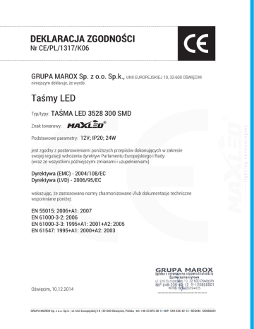 DEKLARACJA ZGODNOŚCI Nr CE/PL/1317/K06 GRUPA MAROX Sp. z o.o. Sp.k., UNII EUROPEJSKIEJ 10, 32-600 OŚWIĘCIM niniejszym deklaruje, że wyrób: Taśmy LED Typ/typy: TAŚMA LED 3528 300 SMD Znak towarowy: Podstawowe parametry: 12V; IP20; 24W jest zgodny z postanowieniami poniższych przepisów dokonujących w zakresie swojej regulacji wdrożenia dyrektyw Parlamentu Europejskiego i Rady: (wraz ze wszystkimi późniejszymi zmianami i uzupełnieniami) Dyrektywa (EMC) - 2004/108/EC Dyrektywa (LVD) - 2006/95/EC wskazując, że zastosowano normy zharmonizowane i/lub dokumentacje techniczne wspomniane poniżej: EN 55015: 2006+A1: 2007 EN 61000-3-2: 2006 EN 61000-3-3: 1995+A1: 2001+A2: 2005 EN 61547: 1995+A1: 2000+A2: 2003 Oświęcim, 10.12.2014 •••••••••••••••••••••••••••••••••••••••••••••••••••••••• GRUPA MAROX Sp. z o.o. Sp.k. | ul. Unii Europejskiej 10 | 32-600 Oświęcim, Polska | tel: +48 33 876 28 11| NIP: 549-236-42-12 | REGON: 120856001