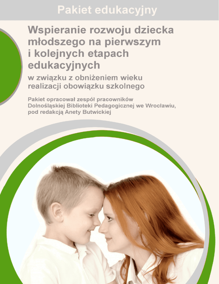 Wspieranie rozwoju dziecka młodszego na pierwszym i kolejnych etapach edukacyjnych w związku z obniżeniem wieku realizacji obowiązku szkolnego to jeden z głównych kierunków polityki oświatowej państwa w roku szkolnym 2014/2015, dlatego też powstał pakiet edukacyjny o takiej tematyce. Od 2009 roku rozpoczął się proces zmiany wieku szkolnego z 7 na 6 lat (Ustawą z dnia 19 marca 2009 roku o zmianie ustawy o systemie oświaty oraz o zmianie niektórych innych ustaw (Dz. U. Nr 56, poz. 458). Obecność dziecka sześcioletniego w szkole jest olbrzymim wyzwaniem. Podjęcie go i próba sprostania przyniesie pozytywne efekty tylko wówczas, gdy wspólnie podejmą je szkoła, nauczyciele i rodzice, którzy zrozumieją specyfikę rozwoju, potrzeby i możliwości sześciolatka. Zadaniem edukacji przedszkolnej będzie kształtowanie umiejętności potrzebnych dziecku do podjęcia nauki w szkole, w tym szczególnie umiejętności społecznych, odporności emocjonalnej i zwiększenie podatności na proces uczenia się pod kierunkiem dorosłego. Jak najbardziej w tym procesie większą rolę powinni odgrywać rodzice wspierając dziecko od najmłodszych lat w rozwoju. W placówkach szkolnych większy nacisk będzie musiał być położony na rozpoznawanie możliwości i potrzeb rozwojowych dzieci, diagnozowanie i analizowanie osiągnięć i zachowań dzieci z uwzględnieniem ich możliwości rozwojowych, indywidualizację pracy z każdym dzieckiem, wspomaganie dzieci wolniej rozwijających się oraz dzieci zdolnych. Pakiet powstał przede wszystkim z myślą o nauczycielach i rodzicach, stanowiąc obszerną formę pomocy służącą wspieraniu rozwoju dziecka młodszego w związku z obniżeniem wieku spełniania realizowania obowiązku szkolnego przez dzieci sześcioletnie. Opracowany przez pracowników Dolnośląskiej Biblioteki Pedagogicznej we Wrocławiu pakiet oparty jest o źródła wiedzy i informacji dostępnych w zgromadzonych zasobach Dolnośląskiej Biblioteki Pedagogicznej we Wrocławiu. Zebrany materiał wzbogacony został także o wyselekcjonowane zasoby Internetu. Spis treści 1. Przygotowanie do szkoły ............................................................................ 4 2. Gotowość szkolna dziecka ....................................................................... 14 3. Adaptacja dziecka w szkole ...................................................................... 25 4. Sześciolatek w szkole ............................................................................... 32 5. Scenariusze zajęć edukacyjnych w nauczaniu wczesnoszkolnym ....... 38 6. Wspieranie rozwoju dziecka ..................................................................... 53 7. Specjalne potrzeby edukacyjne ............................................................... 65 8. Współpraca z poradniami, świetlicą, biblioteką...................................... 78 1. Przygotowanie do szkoły Artykuły z wydawnictw ciągłych 1. Budowanie relacji sześciolatka z dorosłymi / Anna Izabela Brzezińska, Joanna Urbańska // Dyrektor Szkoły. - 2012, nr 3, s. 52-55 Jest jednym z wyznaczników gotowości dziecka do podjęcia nauki w szkole. Umiejętność nawiązywania kontaktów z dorosłymi. Dbanie o dobre relacje z dorosłymi. Samodzielność. Umiejętność podporządkowania się dorosłym. Umiejętność wejścia w rolę ucznia. Otwartość na ocenę. Kształtowanie własnej tożsamości społecznej i indywidualnej w kontakcie z dorosłymi. 2. Budowanie relacji sześciolatka z rówieśnikami / Anna Izabela Brzezińska, Joanna Urbańska // Przed Szkołą. - 2012, [nr] 1, s. 6-10 Omówiono elementy wpływające na rozwój umiejętności komunikowania się z rówieśnikami w szkole oraz wskazówki jak rodzice mogą dzieci na to przygotować. 3. By Twoje dziecko lubiło czytanie i pisanie – baw się z nim! / Katarzyna Lotkowska // Bliżej Przedszkola. - 2012, nr 1, s. 44-[45] Przykładowe propozycje Zabaw FundaMentalnych z zakresu przygotowywania dzieci do nauki czytania i pisania, do przeprowadzania ich z dzieckiem przez rodziców w domu. 4. Czy Twoje dziecko jest gotowe do szkoły? Elżbieta Trojan // Wychowawca. - 2014, nr 6, s. 1213 Omówienie serwisu Bazgroszyt.pl, na którym rodzice mogą sprowadzić, a przede wszystkim rozwijać gotowość szkolną 5-6 latków. 5. Czy warto dokonać samokontroli? / Małgorzata Aleksiak // Doradca Nauczyciela Przedszkola. 2013, nr 19, s. 50-51 Diagnoza przedszkolna przed rozpoczęciem przez dziecko nauki w pierwszej klasie szkoły podstawowej prowadzona przez nauczyciela przedszkola. Cele diagnozy. Praca wspomagająco- korygująca. 6. Dobry początek edukacji / Aleksandra Denst-Sadura. - (Psychologiczne łamigłówki) // Głos Nauczycielski. - 2012, nr 44, s. 16 Wskazówki dla nauczycieli, w jaki sposób stworzyć szkołę przyjazną dla sześciolatków rozpoczynających edukację. 7. Dyrektor w ankietach / Piotr Skura // Głos Nauczycielski. - 2014, nr 8, s. 8 Ankiety dotyczące przygotowania szkół na przyjęcie sześciolatków. 8. Dyrektorzy szkół czekają na sześciolatki / Paulina Gumowska. - Bibliogr. // Dyrektor Szkoły. 2013, nr 6, s. 14-16 Artykuł dotyczący reformy edukacji polegającej na obniżeniu wieku obowiązku szkolnego. 9. Jak pomóc dziecku w dobrym starcie do szkoły? / Bożena Janiszewska // Wychowanie w Przedszkolu. - 2013, nr 9, s. 18-[25] Dojrzałość szkolna. 10. Jak pomóc przedszkolakom w łagodnym przejściu do szkoły? / Agnieszka Boszko-Szcześniak // Wychowanie w Przedszkolu. - 2014, nr 1, s. 51-52 Współpraca przedszkola ze szkołą podstawową. Wycieczki dzieci 5- i 6-letnich do szkoły. 11. Jak radzić sobie z emocjami? / Anna Lesiuk. - Bibliogr. // Wychowanie w Przedszkolu. - 2014, nr 7, s. 40-42 Refleksje z obserwacji grupy sześciolatków. Zastosowanie metody niedokończonych zdań. Wykorzystanie prac plastycznych. Zastosowanie niedokończonego opowiadania. Reakcje nauczycieli na nieadekwatne do sytua