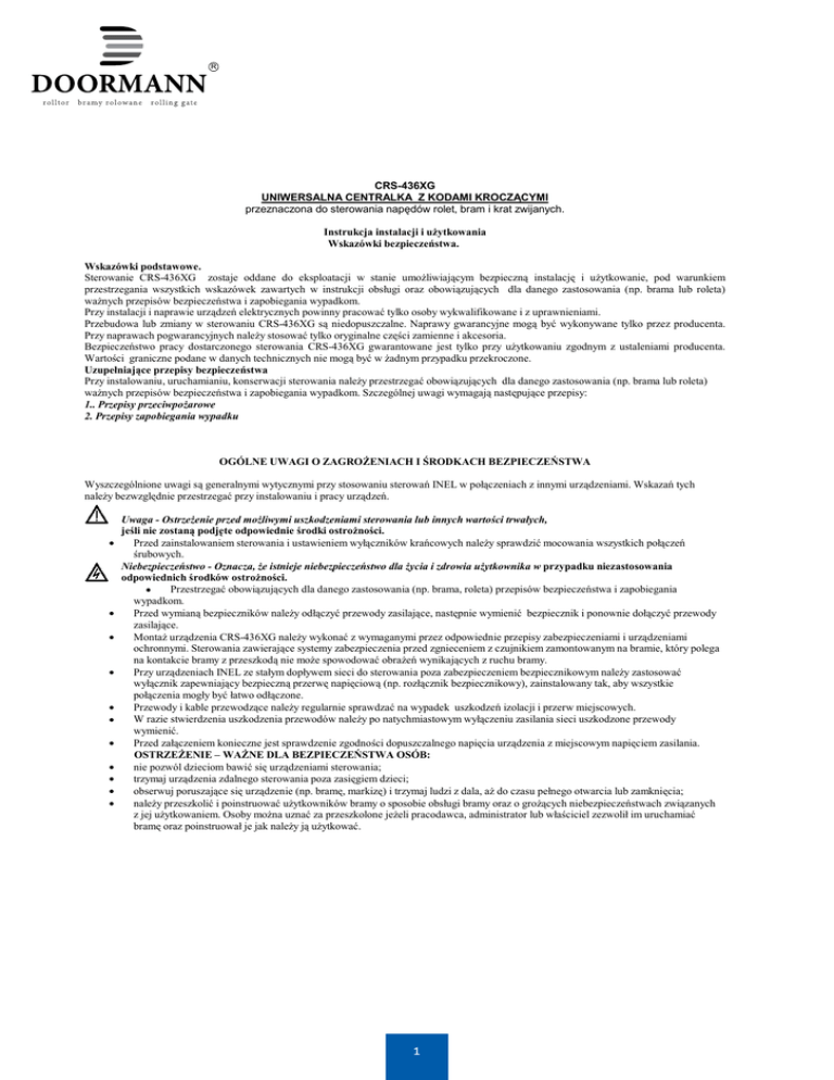 R CRS-436XG UNIWERSALNA CENTRALKA Z KODAMI KROCZĄCYMI przeznaczona do sterowania napędów rolet, bram i krat zwijanych. Instrukcja instalacji i użytkowania Wskazówki bezpieczeństwa. Wskazówki podstawowe. Sterowanie CRS-436XG zostaje oddane do eksploatacji w stanie umożliwiającym bezpieczną instalację i użytkowanie, pod warunkiem przestrzegania wszystkich wskazówek zawartych w instrukcji obsługi oraz obowiązujących dla danego zastosowania (np. brama lub roleta) ważnych przepisów bezpieczeństwa i zapobiegania wypadkom. Przy instalacji i naprawie urządzeń elektrycznych powinny pracować tylko osoby wykwalifikowane i z uprawnieniami. Przebudowa lub zmiany w sterowaniu CRS-436XG są niedopuszczalne. Naprawy gwarancyjne mogą być wykonywane tylko przez producenta. Przy naprawach pogwarancyjnych należy stosować tylko oryginalne części zamienne i akcesoria. Bezpieczeństwo pracy dostarczonego sterowania CRS-436XG gwarantowane jest tylko przy użytkowaniu zgodnym z ustaleniami producenta. Wartości graniczne podane w danych technicznych nie mogą być w żadnym przypadku przekroczone. Uzupełniające przepisy bezpieczeństwa Przy instalowaniu, uruchamianiu, konserwacji sterowania należy przestrzegać obowiązujących dla danego zastosowania (np. brama lub roleta) ważnych przepisów bezpieczeństwa i zapobiegania wypadkom. Szczególnej uwagi wymagają następujące przepisy: 1.. Przepisy przeciwpożarowe 2. Przepisy zapobiegania wypadku OGÓLNE UWAGI O ZAGROŻENIACH I ŚRODKACH BEZPIECZEŃSTWA Wyszczególnione uwagi są generalnymi wytycznymi przy stosowaniu sterowań INEL w połączeniach z innymi urządzeniami. Wskazań tych należy bezwzględnie przestrzegać przy instalowaniu i pracy urządzeń. • • • • • • • • • • • Uwaga - Ostrzeżenie przed możliwymi uszkodzeniami sterowania lub innych wartości trwałych, jeśli nie zostaną podjęte odpowiednie środki ostrożności. Przed zainstalowaniem sterowania i ustawieniem wyłączników krańcowych należy sprawdzić mocowania wszystkich połączeń śrubowych. Niebezpieczeństwo - Oznacza, że istnieje niebezpieczeństwo dla życia i zdrowia użytkownika w przypadku niezastosowania odpowiednich środków ostrożności. Przestrzegać obowiązujących dla danego zastosowania (np. brama, roleta) przepisów bezpieczeństwa i zapobiegania • wypadkom. Przed wymianą bezpieczników należy odłączyć przewody zasilające, następnie wymienić bezpiecznik i ponownie dołączyć przewody zasilające. Montaż urządzenia CRS-436XG należy wykonać z wymaganymi przez odpowiednie przepisy zabezpieczeniami i urządzeniami ochronnymi. Sterowania zawierające systemy zabezpieczenia przed zgnieceniem z czujnikiem zamontowanym na bramie, który polega na kontakcie bramy z przeszkodą nie może spowodować obrażeń wynikających z ruchu bramy. Przy urządzeniach INEL ze stałym dopływem sieci do sterowania poza zabezpieczeniem bezpiecznikowym należy zastosować wyłącznik zapewniający bezpieczną przerwę napięciową (np. rozłącznik bezpiecznikowy), zainstalowany tak, aby wszystkie połączenia mogły być łatwo odłączone. Przewody i kable przewodzące należy regularnie sprawdzać na wypadek uszkodzeń izolacji i przerw miejscowych. W razie stwierdzenia uszkodzenia przewodów należy po natychmiastowym wyłączeniu zasilania sieci uszkodzone przewody wymienić. Przed załączeniem konieczne jest sprawdzenie zgodności dopuszczalnego napięcia urządzenia z miejscowym napięciem zasilania. OSTRZEŻENIE – WAŻNE DLA BEZPIECZEŃSTWA OSÓB: nie pozwól dzieciom bawić się urządzeniami sterowania; trzymaj urządzenia zdalnego sterowania poza zasięgiem dzieci; obserwuj poruszające się urządzenie (np. bramę, markizę) i trzymaj ludzi z dala, aż do czasu pełnego otwarcia lub zamknięcia; należy przeszkolić i poinstruować użytkowników bramy o sposobie obsługi bramy oraz o grożących niebezpieczeństwach związanych z jej użytkowaniem. Osoby można uznać za przeszkolone jeżeli pracodawca, administrator lub właściciel zezwolił im uruchamiać bramę oraz poinstruował je jak należy ją użytkować. 1 1 CRS-436XG UNIWERSALNA CENTRALKA Z KODAMI KROCZĄCYMI przeznaczona do sterowania napędów rolet, bram i krat zwijanych. Instrukcja instalacji i użytkowania Wskazówki bezpieczeństwa. Wskazówki podstawowe. Sterowanie CRS-436XG zostaje oddane do eksploatacji w stanie umożliwiającym bezpieczną instalację i użytkowanie, pod warunkiem przestrzegania wszystkich wskazówek zawartych w instrukcji obsługi oraz obowiązujących dla danego zastosowania (np. brama lub roleta) ważnych przepisów bezpieczeństwa i zapobiegania wypadkom. Przy instalacji i naprawie urządzeń elektrycznych powinny pracować tylko osoby wykwalifikowane i z uprawnieniami. Przebudowa lub zmiany w sterowaniu CRS-436XG są niedopuszczalne. Naprawy gwarancyjne mogą być wykonywane tylko przez producenta. Przy naprawach pogwarancyjnych należy stosować tylko oryginalne części zamienne i akcesoria. Bezpieczeństwo pracy dostarczonego sterowania CRS-436XG gwarantowane jest tylko przy użytkowaniu zgodnym z ustaleniami producenta. Wartości graniczne podane w danych technicznych nie mogą być w żadnym przypadku przekroczone. Uzupełniające przepisy bezpieczeństwa Przy instalowaniu, uruchamianiu, konserwacji sterowania należy przestrzegać obowiązujących dla danego zastosowania (np. brama lub roleta) ważnych przepisów bezpieczeństwa i zapobiegania wypadkom. Szczególnej uwagi wymagają następujące przepisy: 1.. Przepisy przeciwpożarowe 2. Przepisy zapobiegania wypadku OGÓLNE UWAGI O ZAGROŻENIACH I ŚRODKACH BEZPIECZEŃSTWA Wyszczególnione uwagi są generalnymi wytycznymi przy stosowaniu sterowań INEL w połączeniach z innymi urządzeniami. Wskazań tych należy bezwzględnie przestrzegać przy instalowaniu i pracy urządzeń. • • • • • • • • • • • Uwaga - Ostrzeżenie przed możl