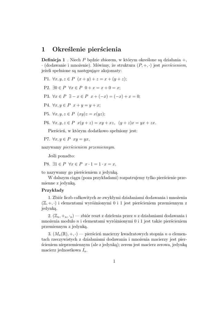 W dalszym ciągu (poza przykładami) rozpatrujemy tylko pierścienie przemienne z jedynką.