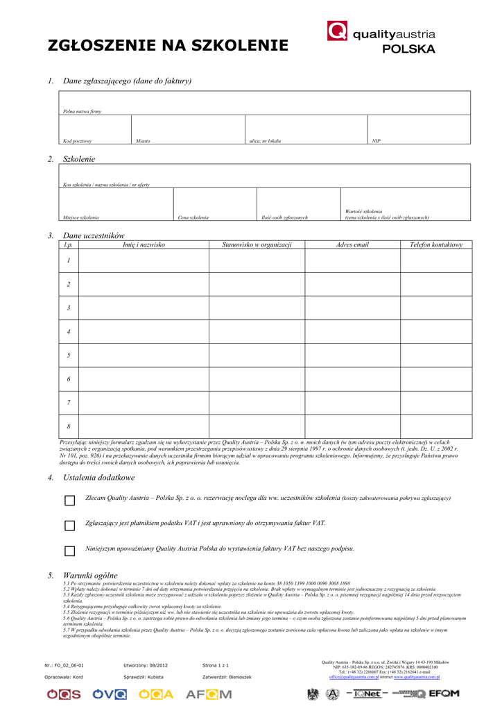 ZGŁOSZENIE NA SZKOLENIE 1. Dane zgłaszającego (dane do faktury) Pełna nazwa firmy Kod pocztowy 2. Miasto ulica, nr lokalu NIP Szkolenie Kos szkolenia / nazwa szkolenia / nr oferty Miejsce szkolenia 3. Cena szkolenia Wartość szkolenia (cena szkolenia x ilość osób zgłaszanych) Ilość osób zgłoszonych Dane uczestników l.p. Imię i nazwisko Stanowisko w organizacji Adres email Telefon kontaktowy 1 2 3 4 5 6 7 8 Przesyłając niniejszy formularz zgadzam się na wykorzystanie przez Quality Austria – Polska Sp. z o. o. moich danych (w tym adresu poczty elektronicznej) w celach związanych z organizacją spotkania, pod warunkiem przestrzegania przepisów ustawy z dnia 29 sierpnia 1997 r. o ochronie danych osobowych (t. jedn. Dz. U. z 2002 r. Nr 101, poz. 926) i na przekazywanie danych uczestnika firmom biorącym udział w opracowaniu programu szkoleniowego. Informujemy, że przysługuje Państwu prawo dostępu do treści swoich danych osobowych, ich poprawienia lub usunięcia. 4. Ustalenia dodatkowe □ □ □ 5. Zlecam Quality Austria – Polska Sp. z o. o. rezerwację noclegu dla ww. uczestników szkolenia (koszty zakwaterowania pokrywa zgłaszający) Zgłaszający jest płatnikiem podatku VAT i jest uprawniony do otrzymywania faktur VAT. Niniejszym upoważniamy Quality Austria Polska do wystawienia faktury VAT bez naszego podpisu. Warunki ogólne 5.1 Po otrzymaniu potwierdzenia uczestnictwa w szkoleniu należy dokonać wpłaty za szkolenie na konto 38 1050 1399 1000 0090 3008 1898 5.2 Wpłaty należy dokonać w terminie 7 dni od daty otrzymania potwierdzenia przyjęcia na szkolenie. Brak wpłaty w wymagalnym terminie jest jednoznaczny z rezygnacją ze szkolenia. 5.3 Każdy zgłoszony uczestnik szkolenia może zrezygnować z udziału w szkoleniu poprzez złożenie w Quality Austria – Polska Sp. z o. o. pisemnej rezygnacji najpóźniej 14 dnia przed rozpoczęciem szkolenia. 5.4 Rezygnującemu przysługuje całkowity zwrot wpłaconej kwoty za szkolenie. 5.5 Złożenie rezygnacji w terminie późniejszym niż ww. lub nie stawienie się uczestnika na szkolenie nie upoważnia do zwrotu wpłaconej kwoty. 5.6 Quality Austria – Polska Sp. z o. o. zastrzega sobie prawo do odwołania szkolenia lub zmiany jego terminu – o czym osoba zgłoszona zostanie poinformowana najpóźniej 5 dni przed planowanym terminem szkolenia. 5.7 W przypadku odwołania szkolenia przez Quality Austria – Polska Sp. z o. o. decyzją zgłoszonego zostanie zwrócona cala wpłacona kwota lub zaliczona jako wpłata na szkolenie w innym uzgodnionym obopólnie terminie. Nr.: FO_02_06-01 Utworzony: 08/2012 Strona 1 z 1 Opracowała: Kord Sprawdził: Kubista Zatwierdził: Bienioszek Quality Austria – Polska Sp. z o.o. ul. Żwirki i Wigury 14 43-190 Mikołów NIP: 635-182-89-86 REGON: 242745876 KRS 0000402100 Tel.: (+48 32) 2266007 Fax: (+48 32) 2162641 e-mail [email protected] internet www.qualityaustria.com.pl