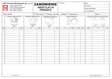 LBF Technika Wentylacyjna Sp. z o. o. Stara Kamienica 66 58-512 Stara Kamienica Tel. (075) 75 283 00 Fax. (075) 75 283 11 Odbiór własny Czerpnia dachowa typ C L.p. Wyrzutnia dachowa typ C XXX szt. .................................................................................... (miejscowość, data) Data: Nr sprawy: WENTYLACJA OKRĄGŁA Nazwa obiektu: XXX d ZAMÓWIENIE Zamawiający: d szt. Osoba kontaktowa: Tel. bezpośredni: Dostawa na budowę Króćce elastyczne Wywietrzak cylindryczny XXX d Spedycja (jaka) .............................................. Strona ......... z ......... Ekspres Podstawy dachowe (typ BI; BII; BIII) L szt. d L = 60 L = 90 szt. Typ d .................................................................................... (podpis składającego zamówienie) szt.
