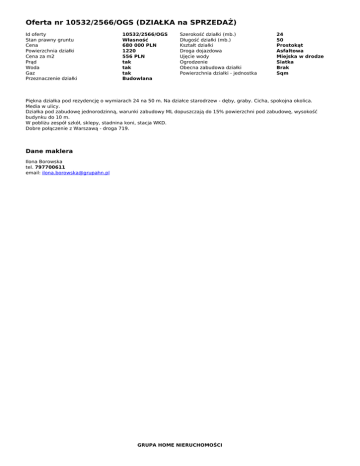 Oferta nr 10532/2566/OGS (DZIAŁKA na SPRZEDAŻ) Id oferty Stan prawny gruntu Cena Powierzchnia działki Cena za m2 Prąd Woda Gaz Przeznaczenie działki 10532/2566/OGS Własność 680 000 PLN 1220 556 PLN tak tak tak Budowlana Szerokość działki (mb.) Długość działki (mb.) Kształt działki Droga dojazdowa Ujęcie wody Ogrodzenie Obecna zabudowa działki Powierzchnia działki - jednostka 24 50 Prostokąt Asfaltowa Miejska w drodze Siatka Brak Sqm Piękna działka pod rezydencję o wymiarach 24 na 50 m. Na działce starodrzew - dęby, graby. Cicha, spokojna okolica. Media w ulicy. Działka pod zabudowę jednorodzinną, warunki zabudowy ML dopuszczają do 15% powierzchni pod zabudowę, wysokość budynku do 10 m. W pobliżu zespół szkół, sklepy, stadnina koni, stacja WKD. Dobre połączenie z Warszawą - droga 719. Dane maklera Ilona Borowska tel. 797700611 email: [email protected] GRUPA HOME NIERUCHOMOŚCI Powered by TCPDF (www.tcpdf.org)