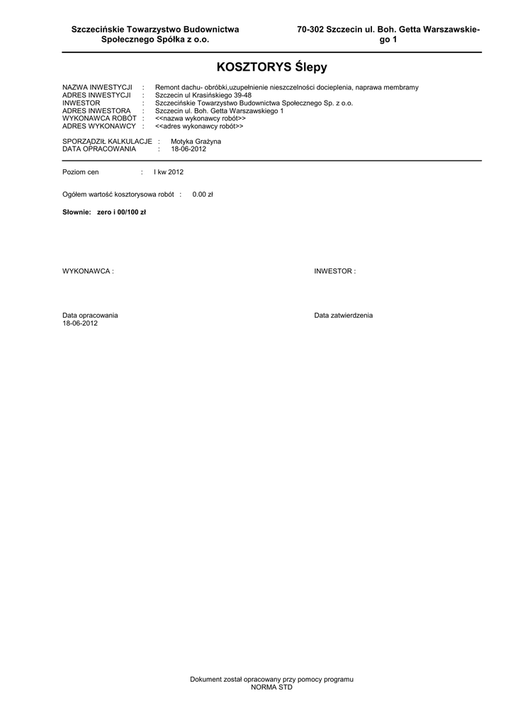 Szczecińskie Towarzystwo Budownictwa Społecznego Spółka z o.o. 70-302 Szczecin ul. Boh. Getta Warszawskiego 1 KOSZTORYS Ślepy NAZWA INWESTYCJI ADRES INWESTYCJI INWESTOR ADRES INWESTORA WYKONAWCA ROBÓT ADRES WYKONAWCY : : : : : : Remont dachu- obróbki,uzupełnienie nieszczelności docieplenia, naprawa membramy Szczecin ul Krasińskiego 39-48 Szczecińskie Towarzystwo Budownictwa Społecznego Sp. z o.o. Szczecin ul. Boh. Getta Warszawskiego 1 <<nazwa wykonawcy robót>> <<adres wykonawcy robót>> SPORZĄDZIŁ KALKULACJE : DATA OPRACOWANIA : Poziom cen : Motyka Grażyna 18-06-2012 I kw 2012 Ogółem wartość kosztorysowa robót : 0.00 zł Słownie: zero i 00/100 zł WYKONAWCA : INWESTOR : Data opracowania 18-06-2012 Data zatwierdzenia Dokument został opracowany przy pomocy programu NORMA STD Krasińskiego - 39-48 dachy -ślepy OBMIAR Lp. Podstawa Opis i wyliczenia Remont dachu- rynna ściekowa, obróbki kominów , okien połaciowych r.malarskie 1 KNR 4-01 Wykonanie zastaw zabezpieczających na dachu i w obrębie prowadzonych 0420-01 prac na ziemi analogia poz.3*2/0.5 2 KNR 4-01 0535 - 08 3 KNR 4-01 0520-08 analogia j.m. m 7 KNR 0-17 0926-01 8 KNR 0-17 0926-05 9 KNR 4-01 0621-05 m2 Dachowa powłoka ochronna z bitumicznej masy uszczelniającej PLASTIKOL m2 NFB - pokrycie dachu jedną warstwą papy klejonej Plastikolem NFB-- DOT KLEJENIA MEMBRANY Z EPDM ułożonej w korytach sciekowych na dachu nieliczne rozwarstwienia pomiędzy poszczególnymi płatami membrany + dodatkowe obrobienie i uszczelnienie miejsc odbiorowych ( lejów spustowych wody) 144.0*2*20% m2 Naprawa uszkodzeń podokienników i czapek kominowych- uzupełnienie braku- miejsc. jącej wyprawy pod czapkami kominowymi na pustakach kominowych i ociepleniu, z zasklepieniem wszystkich otworów w narożnikach ( wykonanie rolki z kleju z zalaniem nie wypełnionych otworów na wysokość ca 2,0 cm) w kominach 62 miejsc. Wyprawa elewacyjna cienkowarstwowa z tynku mineralnego CERESIT - nało- m2 żenie na podłoże farby gruntującej CT 16 - pierwsza warstwa 40.0*0.1+144.0*0.05< w rejonie podbitki> m2 Wyprawa elewacyjna cienkowarstwowa z tynku mineralnego CERESIT CT 35 m2 o fakturze rustykalnej grubości 3.5 mm z gotowej suchej mieszanki wyk. ręcznie na uprzednio przygotowanym podłożu na ościeżach o szer. do 30 cm uzupełnienie miejscowe ubytków w wyprawie ( wypłukanej , odspojonej ) poz.7 m2 Dwukrotne odgrzybianie ścian ceglanych o powierzchni ponad 5 m2 metodą smarowania - kominy 223.15 m2 m2 11 KNR 0-33 0128-01 m2 Malowanie elewacji w miejscach uzupełnień , tepowanie po kotwieniu rusztowań, kominy ( dobór kolorystyki NA POSZCZEGÓLNYCH SEGMENTACH O TON WYŻEJ w-g wzornika NCS w kolorze S 0505-G80Y, S 1005-G80Y, S 2005-G80Y, S 3005-G80Y, S 4005-G80Y kominy S 7010 R 90 B poz.8+40*0.01+223.15 m2 m2 12 KNR-W 4-01 Uzupełnienie pokryć lub obróbek blacharskich blachą z tytan cynku- dot m2 0539-04 wcześniej zdemontowanych przy założeniu 10% ubytków w materiale z uwagi na zwiększenie zakładów i precyzyjne połączenie blach poz.2 m2 14 KNR 19-01 0430-03 analogia 576.000 144.000 RAZEM 144.000 144.000 RAZEM 144.000 144.000 RAZEM 144.000 57.600 RAZEM 57.600 62.000 RAZEM 62.000 11.200 RAZEM 11.200 11.200 RAZEM 11.200 223.150 RAZEM 223.150 234.750 RAZEM 234.750 234.750 RAZEM 234.750 144.000 RAZEM 144.000 196.000 RAZEM 196.000 m2 10 NNRNKB (z.VII) Gruntowanie podłoży preparatami "CERESIT CT 17" i "ATLAS UNI 202 1134-02 GRUNT" - powierzchnie pionowe poz.11 13 KNR 4-01 0533-03 576.000 RAZEM Rozebranie pokrycia z tafli łupkowych nie nadających sie do użytku- dot roze- m2 brania podkłdu dystansowego z desek + styropian pod obróbkami ogniomurka 4 KNR-W 2-02 Pokrycie dachów papą termozgrzewalną - obróbki z papy nawierzchniowej kle- m2 0504-03 jenie na wywiniętą membranę EPDM celem doszczelnienia pod obróbką blacharską wypuszczona równo z rąbkiem wystającej obróbki na stronę zewnętrzną elewacji poz.2 m2 6 KNR 4-01 0205-04 analogia Razem m Rozebranie obróbek blacharskich murów ogniowych,okapów,kołnierzy,gzym- m2 sów i pokrycia ścianki kolankowej - zdięcie ostrozne do ponownego wbudowania 0.5*144.0*2 m2 poz.2 5 KNR 0-44 0104-05 analogia Poszcz Naprawa obróbek blacharskich ,wyprostowanie i polutowanie drobnych uszko- m2 dzeń- w szczególności obróbki pasów nadrynnowych, dokręcenie luźnych niezespolonych właściwie blach trapezowych poszycia dachu ~10% 196.0 m2 Pomosty/ drabiny pochyłe na dachu do wykonania robót objętych zakresem przy kominach i oknach połaciowych ( uśredniony) m2 9*2*2*7.0 m2 -2- Norma STD Wersja 4.30a Licencja: 2231 dla Szczecińskie TBS 252.000 Krasińskiego - 39-48 dachy -ślepy Lp. Podstawa 15 KNR 9-13 0103-03 analogia 16 KNR 2-02 0506-01 17 OBMIAR Opis i wyliczenia j.m. Ocieplenie ścian płytami z wełny mineralnej - przyklejenie płyt na oscieżach dot wypełnienia wszystkich ubytków w styropianie przy kominach ( pod nowe obróbki z blachy) oraz nieszczelności od spodu podbitki ( mur a więźba ) 94*3.4*0.1+144.0*0.05 m2 Obróbki przy szerokości w rozwinięciu do 25 cm - z blachy tytan ocynk obrobienie dodatkowe okien połaciowych i kominów ( w miejscach szczególnie uciążliwych wykonawczo możliwość zastosowania taśm z wkładką ołowianą) (11<okien>*9<segmentów>+8*9)*4.0<średnio>*0.35 m2 Mocowanie listew dociskowych na obróbkach z blachy tytancynkowej mocowycena indy- wanej kołkami , wpuszconej w nacięcie tynku ( docieplenia) przy kominach i widualna uszczelnionej kitem dekarskim 294.81 m2 m2 20 KNR 4-01 0108 - 13 m Wywietrzaki o śr. kołnierza do 100 mm- dot wymiany pochylonych niestabilnych z zastosowaniem kominków wentylacyjnych typu grzybek z kołnierzem ołowianym dot wybranych z zagrożeniem nieszczelności 10 szt. Wywiezienie kontenerami gruzu z rozbieranych konstrukcji m3 5.0 m3 szt. 21 KNR-W 2-02 Rusztowania rurowe punktowe o wysokości do 20 m- rusztownie przesuwne kpl 1605-01 kotwione np MP 1012 h - 11,95-13,95 m - w-g cen za wpoży