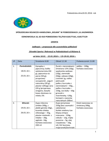Pobiedziska dnia10.01.2016 rok SPÓŁDZIELNIA ROLNICZO-HANDLOWA „ROLNIK” W POBIEDZISKACH ,UL.KAZIMIERZA ODNOWICIELA 16, 62-010 POBIEDZISKA TEL/FAX 618177161, 618177129 OFERTA Jadłospis – propozycja dla uczestników półkolonii Ośrodek Sportu i Rekreacji w Pobiedziskach ul.Różana 4, od dnia 18.01. - 22.01.2016 r. i 25-29.01.2016 r. LP. 1. Data Poniedziałek: 18.01.16 r. 25.01.16 r. 2. Wtorek: 19.01.16 r. 26.01.16 r. Śniadanie 8.00 Obiad 12.30 Podwieczorek 15.00 Kanapka z jajecznicą: bułka wieloziarnista (50 g), jajecznica na parze (50 g); przyprawy: szczypiorek , jogurt naturalny (20 g); plaster żółtego sera (20 g )przyprawy: oregano, bazylia kawa zbożowa na mleku 2% Żurek z ziemniakami: śmietana 12% (10g), wędzonka wołowa (10g), ziemniaki (50g), zakwas (20g), czosnek 1g, natka pietruszki pałka z kurczaka z ziemniakami – 40g, , pałka z kurczaka – 150g, sos biały – 50g groszek z marchewką -120g, kompot z owoców naturalnych 200ml Zupa jarzynowa 250g (bez zasmażki i zabielania) Kotlet mielony tzw klopsy (mięso mieszane - 150g, cebula – 12g, mąka pszenna – 5g, olej rzepakowy – 10g, sól, liść laurowy, majeranek)Ziemniaki jabłko – 100g, herbata owocowa Zupa mleczna (mleko 200g, z płatki górskie 30g) , kromka chleba sitkowego – 35g, plaster mielonki z indyka – 20g, ogórek– 10g, herbata owocowa 200 ml Kisiel owocowy ze śmietaną 200g, herbata owocowa 1 3. Środa: 20.01.16 r. 27.01.16 r. 4. Czwartek: 21.01.16 r. 28.01.16 r. 5. Piątek: Twarożek -2 kromki chleba żytniego (70g,) pasta twarogowa (ser twarogowy półtłusty 60g, jogurt - 10g, ogórek zielony -50g, szczypiorek – 5g), pomidor – 30g , herbata 200 ml Parówka z szynki (min. 90% mięsa) – 50g, kromka chleba wieloziarnistego – 35g, masło – 5g, sałatka z pomidora – 100g i kwaszonego ogórka – 50g, Cebula – 5g, ketchup 5g, kawa zbożowa na mleku 2% Kanapka z wędliną Kajzerka (50 g), masło (10 g), szynka – 150g, Jarzynka gotowana 100g kompot z owoców naturalnych 200ml Krupnik z kaszy jęczmiennej: włoszczyzna 75g, kasza jęczmienna 30g, ziemniaki 30g, masło 5g, koperek 10g) Kuleczki drobiowe duszone, w sosie pieczarkowym: mięso z indyka (150 g), bułka (15 g), jajko (10 g), cebula (2 g), przyprawy: tymianek, pieprz; sos: pieczarki (50 g), śmietana 12% (15 g);przyprawy: natka pietruszki; kasza (30g), koperek; Surówka z kapusty (50g), kukurydzy (30g) i pomidora(50g) i jogurtu naturalnego (10g) kompot z owoców naturalnych 200ml Wątróbka wieprzowa z cebulką ( 150g) ,Ziemniaki – 100g Surówka: kapusta(100 g), sok z cytryny, przyprawy kompot z owoców , 200ml Dorsz gotowany na parze (dorsz 150g) ,Ziemniaki – 100g Jogurt 150 ml, herbata 200 ml Galaretka z owocem naturalnym 150 ml Placek z owocem 250 g, herbata 200 ml 2 22.01.16 r. 29.01.16 r. wieprzowa (20 g), dżem(15 g) ,kawa zbożowa na mleku 2% Surówka: marchewka 150 g , sok z cytryny, świeże listki bazylii kompot z owoców , 200ml Opracowano na podstawie: 1. Jarosz M. 2012. Normy żywienia dla populacji polskiej – nowelizacja. Instytut Żywności i Żywienia http://mail.izz.waw.pl/~it/NORMY/NormyZywienia NowelizacjaIZZ2012.pdf, dostęp 15.12.2014. 2. Jarosz M. Obiady szkolne z uwzględnieniem zasad Dobrej Praktyki Higienicznej oraz systemu HACCP dla posiłków szkolnych, Instytut Żywności i Żywienia, Warszawa 2008 3. Jarosz M. Zasady prawidłowego żywienia dzieci i młodzieży oraz wskazówki dotyczące zdrowego stylu życia, Instytut Żywności i Żywienia, Warszawa 2008 4. Hamułka J. i wsp. Propozycja posiłków dla dzieci w przedszkolach i szkołach, Warszawa 2009. http://wiemcojem.um.warszawa.pl/files/propozycje_posilkow.pdf dostęp 15.12.2014 3