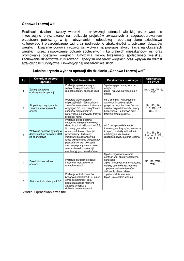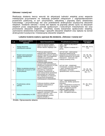 Odnowa i rozwój wsi Realizacja działania tworzy warunki do aktywizacji ludności wiejskiej przez wsparcie inwestycyjne przyznawane na realizację projektów związanych z zagospodarowaniem przestrzeni publicznej, w tym utrzymaniem, odbudową i poprawą stanu dziedzictwa kulturowego i przyrodniczego wsi oraz podniesienie atrakcyjności turystycznej obszarów wiejskich. Działanie odnowa i rozwój wsi wpływa na poprawę jakości życia na obszarach wiejskich przez zaspokojenie potrzeb społecznych i kulturalnych mieszkańców wsi oraz promowanie obszarów wiejskich. Umożliwia rozwój tożsamości społeczności wiejskiej, zachowanie dziedzictwa kulturowego i specyfiki obszarów wiejskich oraz wpływa na wzrost atrakcyjności turystycznej i inwestycyjnej obszarów wiejskich. Lokalne kryteria wyboru operacji dla działania „Odnowa i rozwój wsi” L.p. 1 2 3 4 5 Kryterium wyboru operacji Zasięg obszarowy oddziaływania operacji Stopień wykorzystywania zasobów wewnętrznych obszaru Wpływ na poprawę sytuacji w dziedzinach uznanych w LSR za priorytetowe Opis/Uzasadnienie Przykładowa punktacja Preferuje operacje mające wpływ na większy obszar w ramach obszaru objętego LSR 3 pkt – wpływ na cały obszar objęty LSR 2 pkt – wpływa na więcej niż 1 gminę Preferuje wykorzystanie większej ilości i różnorodności zasobów wewnętrznych obszaru objętego LSR, w szczególności zasobów przyrodniczych, historyczno-kulturowych, tradycji produkcji rolnej Preferuje próbę poprawy sytuacji w kilku priorytetowych dziedzinach określonych w LSR, tj. rozwój gospodarczy w oparciu o lokalny potencjał przyrodniczy i kulturowy; inicjatywy mieszkańców na rzecz wzmacniania wyróżników pszczyńskiej wsi; tworzenie sieci współpracy na obszarze; wzmacnianie kompetencji cywilizacyjnych mieszkańców od 0 do 5 pkt – wykorzystuje aktywność społeczną lub gospodarczą mieszkańców oraz zasoby przyrodnicze lub zasoby historyczno - kulturowe oraz tradycje produkcji rolnej Przedmiotowy zakres operacji Preferuje określone rodzaje inwestycji realizowanej w ramach operacji Status wnioskodawcy w LGD Preferuje wnioskodawców będących członkami LGD przez okres co najmniej 1 roku poprzedzającego moment złożenia wniosku o dofinansowanie operacji Źródło: Opracowanie własne od 0 do 3 pkt – działalności innowacyjne, turystyka, rekreacja i i sport, produkty kulturalne i edukacyjne, rzemiosło i rękodzielnictwo, kuchnia lokalna, 3 pkt – zagospodarowanie centrum wsi, obiekty społecznokulturalne 2 pkt – infrastruktura turystyczna, obiekty sportowe, rekreacyjne 1 pkt – urządzanie terenów zielonych, place zabaw, … 1 pkt – spełnia warunek 0 pkt – nie spełnia warunku Adekwatność do SWOT S13., W8., W.16, T15. S4., S5., S6., S10., O6., O7, O8., T5. S4., S5., S6., S10., W16., O2., O8., T11. S5., S8., W12., W14.,