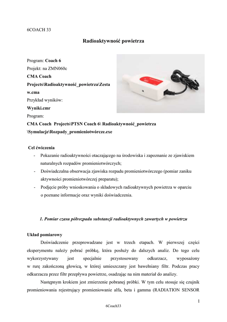 6COACH 33 Radioaktywność powietrza Program: Coach 6 Projekt: na ZMN060c CMA Coach Projects\Radioaktywność_powietrza\Zesta w.cma Przykład wyników: Wyniki.cmr Program: CMA Coach Projects\PTSN Coach 6\ Radioaktywność_powietrza \Symulacje\Rozpady_promieniotwórcze.exe Cel ćwiczenia - Pokazanie radioaktywności otaczającego na środowiska i zapoznanie ze zjawiskiem naturalnych rozpadów promieniotwórczych; - Doświadczalna obserwacja zjawiska rozpadu promieniotwórczego (pomiar zaniku aktywności promieniotwórczej preparatu); - Podjęcie próby wnioskowania o składowych radioaktywnych powietrza w oparciu o poznane informacje oraz wyniki doświadczenia. 1. Pomiar czasu półrozpadu substancji radioaktywnych zawartych w powietrzu Układ pomiarowy Doświadczenie przeprowadzane jest w trzech etapach. W pierwszej części eksperymentu naleŜy pobrać próbkę, która posłuŜy do dalszych analiz. Do tego celu wykorzystywany jest specjalnie przystosowany odkurzacz, wyposaŜony w rurę zakończoną głowicą, w której umieszczany jest bawełniany filtr. Podczas pracy odkurzacza przez filtr przepływa powietrze, osadzając na nim materiał do analizy. Następnym krokiem jest zmierzenie pobranej próbki. W tym celu stosuje się czujnik promieniowania rejestrujący promieniowanie alfa, beta i gamma (RADIATION SENSOR 1 6Coach33 (0666I) (CMA) (0…1000)). Czujnik ten pozwala na rejestrację aktywności promieniotwórczej preparatu poprzez zliczanie kwantów promieniowania alfa, beta i gamma. Sterownik tego czujnika przypisany jest do pierwszego wejścia analogowego konsoli pomiarowej CoachLabII+. Ostatnią częścią doświadczenia jest analiza danych. W tej części sporządza się wykresy ilości zliczeń rejestrowanych przez detektor w funkcji czasu pomiaru, dokonuje się dopasowania krzywych teoretycznych do danych doświadczalnych oraz wyznacza czas półrozpadu badanego Odkurzacz przystosowany do pobierania próbki materiału. MoŜna przeprowadzić takŜe komputerową symulację zjawiska. Przygotowanie układu: - Przeprowadzenie pomiaru w pomieszczeniu, które znajduje się moŜliwie blisko gruntu, a ponadto jest słabo wietrzone, pozwoli na uzyskanie większej liczy zliczeń rozpadów promieniotwórczych na minutę; - W głowicy rury ssącej odkurzacza umieścić czysty filtr bawełniany; - Całość układu umieścić w badanym pomieszczeniu i uruchomić odkurzacz; - Zbieranie próbki prowadzić przez około 10 minut. Sposób umieszczenia filtra w głowicy Ustawienia parametrów pomiaru: Method: Type: Time based Measuring time: 600 minutes Frequency: 1 per minute 6Coach33 2 Pomiar - Próbkę naleŜy umieścić moŜliwie blisko detektora; zadbać, by znajdowała się ona na wysokości „szyjki” detektora. MoŜna posłuŜyć się układem deseczek i ołowianych cegieł, zgodnie z ilustracją; - Uruchomić pomiar – przycisk start (F9) - ; DłuŜsze prowadzenie pomiaru, przez Przykładowy sposób ustawienia próbki przed detektorem około 10 – 12 godzin, pozwoli na pełne (aŜ do prawie całkowitego zaniku) zobrazowanie eksponencjalnego charakteru zaniku aktywności promieniotwórczej preparatu. - Przed dokonaniem pomiaru aktywności promieniotwórczej pobranej próbki, naleŜy dokonać oceny aktywności promieniotwórczej tła. Pomiaru tego dokonuje się w taki sam sposób, jak pomiaru aktywności promieniotwórczej próbki, z tym Ŝe oceny tej moŜna dokonać juŜ po kilku minutach pomiaru. Obserwacje Program dokonuje zliczeń ilości kwantów promieniowania docierających od badanego materiału do detektora. Ilość zliczeń w przypadku badanego materiału jest znacząco większa niŜ w przypadku badania tła (chociaŜ jest to silnie zaleŜne od miejsca pobrania próbki). MoŜna zatem stwierdzić, Ŝe w powietrzu występują pewne substancje radioaktywne. JeŜeli pomiar prowadzony był dostatecznie długo, uwidacznia się fakt, Ŝe ilość zliczeń rejestrowanych przez detektor maleje wraz z czasem. Oznacza to, Ŝe zmniejsza się ilość rozpadów radioaktywnych, czego przyczyną jest zmniejszanie się ilości danej substancji na filtrze. Zachodzi tu zjawisko rozpadu promieniotwórczego. 3 6Coach33 Analiza danych Program przedstawia na wykresie zaleŜność ilości kwantów promieniowania rejestrowanych na minutę od czasu trwania pomiaru. Wielkość ta jest proporcjonalna do ilości zachodzących w ciągu minuty rozpadów. Do danych doświadczalnych moŜliwe jest dopasowanie krzywej eksponencjalnej opisującej zaleŜność ilości rozpadów promieniotwórczych od czasu. W tym celu naleŜy otworzyć menu kontekstowe (klikając prawym przyciskiem myszy na wykresie), a następnie wskazać Process/Analyze i wybrać Function Fit. Jako Column wskazać „Rate” oraz jako Function type wybrać f(x)=a*exp(bx)+c. Po naciśnięciu przycisku Estimate program przeprowadzi oszacowanie przebiegu dopasowywanej krzywej. JeŜeli dopasowanie znacząco odbiega od danych doświadczalnych moŜliwe jest odgórne zadanie parametrów dopasowania. Parametr „a” odpowiada początkowej ilości zliczeń, parametr „b” związany jest z czasem półrozpadu i opisuje „wygięcie” krzywej, natomiast parametr „c” odnosi się do promieniowania tła i opisuje przesunięcie krzywej względem osi y. Po wprowadzeniu wartości parametru moŜna zaznaczyć pozycję Fix obok tej wartości. Spowoduje to, Ŝe przy dopasowywaniu program będzie traktował wartość danego współczynnika, jako ustaloną. Ostatecznego dopasowania krzywej dokonuje się naciskając przycisk Refine. Przyciskiem OK zatwierdza się wyniki dopasowania. Wartość parametru „b” Czas półrozpadu (wprowadzany ręcznie) Wykres ilości zliczeń na minutę od czasu pomiaru Tabela obliczania okresu półrozpadu Tabela z danymi pomiarowymi 6Coach33 Ogólny widok okna programu 4 naleŜy wpisać do tabeli „Czas półrozpadu” w pozycji „Stała rozpadu”. Czas półrozpadu zostanie obliczony automatycznie. MoŜna ten wynik wyekspo