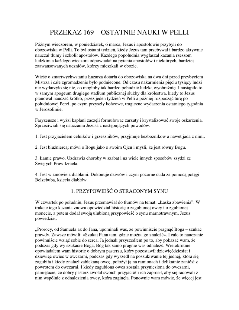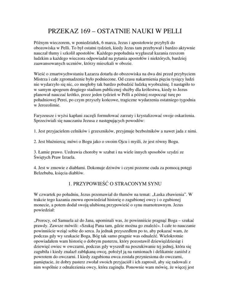 PRZEKAZ 169 – OSTATNIE NAUKI W PELLI Późnym wieczorem, w poniedziałek, 6 marca, Jezus i apostołowie przybyli do obozowiska w Pelli. To był ostatni tydzień, kiedy Jezus tam przebywał i bardzo aktywnie nauczał tłumy i szkolił apostołów. Każdego popołudnia wygłaszał kazania rzeszom ludzkim a każdego wieczora odpowiadał na pytania apostołów i niektórych, bardziej zaawansowanych uczniów, którzy mieszkali w obozie. Wieść o zmartwychwstaniu Łazarza dotarła do obozowiska na dwa dni przed przybyciem Mistrza i całe zgromadzenie było podniecone. Od czasu nakarmienia pięciu tysięcy ludzi nie wydarzyło się nic, co mogłoby tak bardzo pobudzić ludzką wyobraźnię. I nastąpiło to w samym apogeum drugiego stadium publicznej służby dla królestwa, kiedy to Jezus planował nauczać krótko, przez jeden tydzień w Pelli a później rozpocząć turę po południowej Perei, po czym przyszły końcowe, tragiczne wydarzenia ostatniego tygodnia w Jerozolimie. Faryzeusze i wyżsi kapłani zaczęli formułować zarzuty i krystalizować swoje oskarżenia. Sprzeciwiali się nauczaniu Jezusa z następujących powodów: 1. Jest przyjacielem celników i grzeszników, przyjmuje bezbożników a nawet jada z nimi. 2. Jest bluźniercą; mówi o Bogu jako o swoim Ojcu i myśli, że jest równy Bogu. 3. Łamie prawo. Uzdrawia choroby w szabat i na wiele innych sposobów szydzi ze Świętych Praw Izraela. 4. Jest w zmowie z diabłami. Dokonuje dziwów i czyni pozorne cuda za pomocą potęgi Belzebuba, księcia diabłów. 1. PRZYPOWIEŚĆ O STRACONYM SYNU W czwartek po południu, Jezus przemawiał do tłumów na temat: „Łaska zbawienia”. W trakcie tego kazania znowu opowiedział historię o zagubionej owcy i o zgubionej monecie, a potem dodał swoją ulubioną przypowieść o synu marnotrawnym. Jezus powiedział: „Prorocy, od Samuela aż do Jana, upominali was, że powinniście pragnąć Boga – szukać prawdy. Zawsze mówili: «Szukaj Pana tam, gdzie można go znaleźć». I całe to nauczanie powinniście wziąć sobie do serca. Ja jednak przyszedłem po to, aby pokazać wam, że podczas gdy wy szukacie Boga, Bóg tak samo pragnie was odnaleźć. Wielokrotnie opowiadałem wam historię o dobrym pasterzu, który pozostawił dziewięćdziesiąt i dziewięć owiec w owczarni, podczas gdy wyszedł na poszukiwanie tej jednej, która się zagubiła i kiedy znalazł zabłąkaną owcę, położył ją na ramionach i delikatnie zaniósł z powrotem do owczarni. I kiedy zagubiona owca została przyniesiona do owczarni, pamiętacie, że dobry pasterz zwołał swoich przyjaciół i ich zaprosił, aby się radowali z nim wspólnie z odnalezienia owcy, która zaginęła. Ponownie wam mówię, że więcej jest w niebie radości z jednego grzesznika, który żałuje, niż z dziewięćdziesięciu i dziewięciu sprawiedliwych, którzy nie potrzebują żałować za grzechy. To, że dusze się gubią, zwiększa tylko zainteresowanie niebiańskiego Ojca. Przyszedłem na ten świat na polecenie Ojca i dobrze jest powiedziane, że Syn Człowieczy jest przyjacielem celników i grzeszników. Uczono was, że Boska akceptacja przychodzi po waszym żalu za grzechy i jest rezultatem wszelkich waszych ofiarowań i skruchy, ale ja was zapewniam, że Ojciec was akceptuje zanim jeszcze wyraziliście skruchę, i wysyła Syna, i jego towarzyszy, aby was odnaleźli i z powrotem przyprowadzili z radością do owczarni, do królestwa synostwa i duchowego rozwoju. Wszyscy jesteście podobni do zabłąkanych owiec a ja przyszedłem odszukać i uratować te, które się zgubiły. I powinniście także pamiętać historię kobiety, która mając dziesięć sztuk srebra wplecionych w ozdobny naszyjnik, zgubiła jedną sztukę i jak zapaliła lampę, i pracowicie zamiotła dom, i szukała, aż znalazła zgubioną sztukę srebra. I zaraz jak tylko znalazła zgubioną monetę, zwołała swoich przyjaciół i sąsiadów, i mówiła: «Radujcie się ze mną, gdyż znalazłam tę sztukę, która zaginęła». Tak więc znowu wam powiem, że zawsze panuje radość w obecności aniołów w niebie z powodu jednego grzesznika, który żałuje za grzechy i wraca do owczarni Ojca. I mówię wam tę historię, aby wam wpoić to, że Ojciec i jego Syn wychodzą szukać tych, którzy się zgubili; i w tych poszukiwaniach używamy wszelkich środków, mogących nam pomóc w naszych starannych wysiłkach odnalezienia tych, którzy się zagubili, tych którzy potrzebują zbawienia. I tak, kiedy Syn Człowieczy wychodzi na pustkowie szukając owcy, która się zabłąkała, poszukuje on także monety, która zagubiła się w domu. Owca zabłąka się mimowolnie; moneta pokryta jest kurzem czasu i jest niewidoczna pod nagromadzonymi rzeczami ludzkimi. A teraz chciałbym wam opowiedzieć historię o bezmyślnym synu zamożnego rolnika, który celowo opuścił dom swego ojca i wyruszył w obce ziemie, gdzie popadł w wielkie tarapaty. Przypomnijcie sobie, że owca zbłądziła mimowolnie, ale ten młodzieniec opuścił swój dom rozmyślnie. A było to tak: Pewien człowiek miał dwóch synów; jeden, młodszy, był niefrasobliwy i beztroski, zawsze gonił za rozrywką i unikał obowiązków, podczas gdy jego starszy brat był poważny, zrównoważony, ciężko pracował i nie unikał obowiązków. Tych dwóch braci nie zgadzało się zbytnio ze sobą; zawsze się kłócili i sprzeczali. Młodszy chłopiec był radosny i pełen życia, ale leniwy i nierzetelny; starszy syn był poważny i pracowity a jednocześnie egocentryczny, gburowaty i zarozumiały. Młodszy syn lubił się bawić, ale unikał pracy; starszy poświęcił się pracy, ale rzadko się bawił. Ich wzajemne współżycie stało się tak trudne do zniesienia, że młodszy syn przyszedł do swego ojca i powiedział: «Ojcze, daj mi trzecią część twojego majątku, która na mnie przypada i pozwól mi odejść w świat, w poszukiwaniu mojego własnego szczęścia». I kied