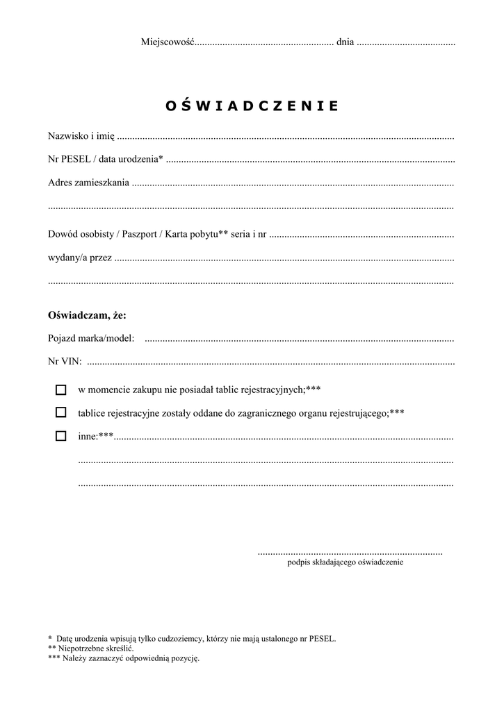 Miejscowość....................................................... dnia ....................................... OŚWIADCZENIE Nazwisko i imię ..................................................................................................................................... Nr PESEL / data urodzenia* .................................................................................................................. Adres zamieszkania ............................................................................................................................... ................................................................................................................................................................ Dowód osobisty / Paszport / Karta pobytu** seria i nr ......................................................................... wydany/a przez ...................................................................................................................................... ................................................................................................................................................................ Oświadczam, że: Pojazd marka/model: .......................................................................................................................... Nr VIN: ................................................................................................................................................. w momencie zakupu nie posiadał tablic rejestracyjnych;*** tablice rejestracyjne zostały oddane do zagranicznego organu rejestrującego;*** inne:***...................................................................................................................................... .................................................................................................................................................... .................................................................................................................................................... ......................................................................... podpis składającego oświadczenie * Datę urodzenia wpisują tylko cudzoziemcy, którzy nie mają ustalonego nr PESEL. ** Niepotrzebne skreślić. *** Należy zaznaczyć odpowiednią pozycję.