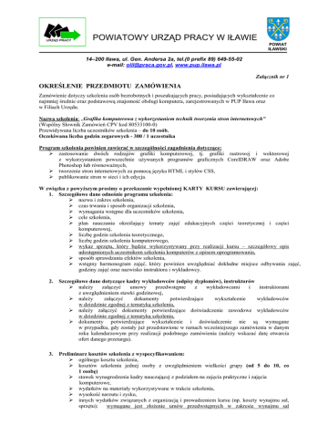 POWIATOWY URZĄD PRACY W IŁAWIE POWIAT IŁAWSKI 14–200 Iława, ul. Gen. Andersa 2a, tel.(0 prefix 89) 649-55-02 e-mail: [email protected], www.pup.ilawa.pl Załącznik nr 1 OKREŚLENIE PRZEDMIOTU ZAMÓWIENIA Zamówienie dotyczy szkolenia osób bezrobotnych i poszukujących pracy, posiadających wykształcenie co najmniej średnie oraz podstawową znajomość obsługi komputera, zarejestrowanych w PUP Iława oraz w Filiach Urzędu. Nazwa szkolenia: „Grafika komputerowa z wykorzystaniem technik tworzenia stron internetowych” (Wspólny Słownik Zamówień CPV kod 80533100-0) Przewidywana liczba uczestników szkolenia – do 10 osób. Oczekiwana liczba godzin zegarowych - 300 / 1 uczestnika Program szkolenia powinien zawierać w szczególności zagadnienia dotyczące: zastosowanie dwóch rodzajów grafiki komputerowej, tj. grafiki rastrowej i wektorowej z wykorzystaniem powszechnie używanych programów graficznych CorelDRAW oraz Adobe Photoshop lub równoważnych, tworzenie stron internetowych za pomocą języka HTML i stylów CSS, publikowanie stron w sieci i ich edycja. W związku z powyższym prosimy o przekazanie wypełnionej KARTY KURSU zawierającej: 1. Szczegółowe dane odnośnie programu szkolenia: nazwa i zakres szkolenia, czas trwania i sposób organizacji szkolenia, wymagania wstępne dla uczestników szkolenia, cele szkolenia, plan nauczania określający tematy zajęć edukacyjnych części teoretycznej i części komputerowej, liczbę godzin szkolenia teoretycznego, liczbę godzin szkolenia komputerowego, wykaz sprzętu, który będzie wykorzystywany przy realizacji kursu – szczegółowy opis udostępnionych uczestnikom szkolenia komputerów z opisem oprogramowania, sposób sprawdzania efektów szkolenia, wstępny harmonogram zajęć, który powinien uwzględniać dokładne miejsce odbywania zajęć, godziny zajęć oraz nazwisko instruktora i wykładowcy. 2. Szczegółowe dane dotyczące kadry wykładowców (odpisy dyplomów), instruktorów należy załączyć umowy przedwstępne z wykładowcami i instruktorami z uwzględnieniem stawki godzinowej, należy załączyć dokumenty potwierdzające wykształcenie wykładowców w dziedzinie zgodnej z tematyką szkolenia, należy załączyć dokumenty potwierdzające doświadczenie zawodowe wykładowców w dziedzinie zgodnej z tematyką szkolenia, dokumenty potwierdzające wykształcenie i doświadczenie nie są wymagane w przypadku, gdy zostały już przedstawione w ramach wcześniejszego zamówienia w danym roku kalendarzowym przy realizacji podobnego zamówienia (należy wskazać datę otwarcia ofert danego przetargu). 3. Preliminarz kosztów szkolenia z wyspecyfikowaniem: ogólnego kosztu szkolenia, kosztów szkolenia jednej osoby z uwzględnieniem wielkości grupy (od 5 do 10, co 1 osobę) stawek wynagrodzenia kadry nauczającej z podziałem na zajęcia praktyczne i zajęcia komputerowe, wydatków na materiały wykorzystywane w trakcie szkolenia, wysokość narzutu i zysku, innych wydatków związanych z organizacją i prowadzeniem kursu (np. koszty wynajmu sal, sprzętu); wymagane jest złożenie umów przedwstępnych w zakresie wynajmu sal POWIATOWY URZĄD PRACY W IŁAWIE POWIAT IŁAWSKI 14–200 Iława, ul. Gen. Andersa 2a, tel.(0 prefix 89) 649-55-02 e-mail: [email protected], www.pup.ilawa.pl wykładowych i z wykładowcami. zaplecza dydaktycznego, a także umowy przedwstępne Uwaga: daty zawarcia umów przedwstępnych, nie mogą być wcześniejsze od daty ogłoszenia przetargu na powyższe szkolenie. Umowy właściwe muszą być przedstawione Zamawiającemu przez oferenta, którego oferta została uznana za najkorzystniejszą. 4. Pozostałe warunki jakie należy wziąć pod uwagę przy opracowaniu programu szkolenia oraz jego organizacji: nacisk na wykształcenie umiejętności praktycznych wśród uczestników kursu, ścisły związek między teorią i praktyką, określenie minimalnej i maksymalnej liczby uczestników kursu; jeżeli będą zajęcia w grupach podać ilość i liczebność grup, zapewnienie codziennego rytmu zajęć – pięć dni w tygodniu, plan nauczania musi obejmować nie więcej niż 7 godzin dziennie, nie mniej niż 30 godzin tygodniowo i nie więcej niż 150 godzin miesięcznie, w programie szkolenia nie należy zawierać elementów stymulujących aktywność bezrobotnych (techniki poszukiwania pracy, trening interpersonalny itp.), do kalkulacji kosztów należy wliczyć co najmniej jeden podręcznik, który po zakończeniu szkolenia przechodzi na własność uczestników, należy zapewnić osobom bezrobotnym materiały biurowe (zeszyt, długopis). 5. Czas realizacji szkolenia: maj - lipiec 2010 roku. 6. Zwycięzca przetargu otrzyma zapłatę po zakończeniu szkolenia. 7. • Zamawiający zobowiązuje jednostkę szkolącą do: wypłaty bezrobotnym kosztów przejazdu zgodnie z regulaminem PUP Iława (najtańszym, dogodnym środkiem transportu, obsługiwanym przez przewoźnika wykonującego usługi w zakresie komunikacji publicznej) z miejsca zamieszkania do miejscowości, w której prowadzone będzie szkolenie, w terminach co najmniej 2 tygodniowych; dostarczenia do PUP wykazów zwrotu kosztów dojazdu wraz z kserokopią (potwierdzoną za zgodność z oryginałem) wszystkich przedstawionych biletów PKP lub PKS zgodnie z zasadami określonymi przez PUP Iława. Ww. koszt rozliczony będzie odrębnym rachunkiem. Kosztów przejazdu nie należy wliczać do jednostkowego kosztu szkolenia zawartego w „Karcie kursu”. Z up. STAROSTY DYREKTOR Powiatowego Urzędu Pracy w Iławie Walerian Polak