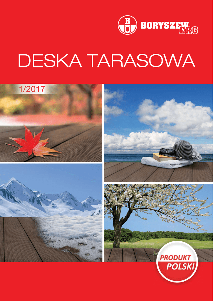 DESKA TARASOWA 1/2017 7 ZASTOSOWANIE Deska tarasowa Boryszew to wytrzymały, odporny na działanie czynników atmosferycznych materiał do krycia tarasów, obrzeży basenów i pomostów. Wykonane z kompozytu drewna doskonale imitują ryflowane deski z drewna egzotycznego, dzięki czemu idealnie wkomponowują się w architekturę nowoczesnych domów, budynków i budowli. Deska tarasowa Boryszew składa się w 45% z wysoko wyselekcjonowanej mączki drzewnej i 45% z czystego PVC. 10 % składu surowca stanowią dodatki poprawiające parametry wyrobu. Połączenie drewna z tworzywem sztucznym gwarantuje powstanie trwałego materiału, zachowującego wysokie parametry użytkowe przez wiele lat, bez konieczności konserwacji, olejowania i malowania, odpornego na wodę oraz zmienne warunki atmosferyczne. Ryflowana powierzchnia umożliwia szybkie i skuteczne odprowadzenie wody z deski. Deski oferowane są również w wersji szczotkowanej, które charakteryzują się doskonałymi właściwościami antypoślizgowymi. Ten innowacyjny produkt jest doskonałą alternatywą dla tradycyjnego drewna i drewna egzotycznego, które wymaga bardzo dużego nakładu pracy, by cały czas wyglądało atrakcyjnie. Deska kompozytowa cieszy się szerokim wachlarzem zastosowań począwszy od małych balkonów, werand, poprzez tarasy domów jednorodzinnych i dużych obiektów użytkowych typu motele, hotele, domy wczasowe, po budowę obrzeży oczek wodnych, basenów przydomowych, hotelowych, miejskich oraz pomostów, przystani, a także innych konstrukcji i budowli szeroko pojętej architektury ogrodowej i parkowej. Tarasy wykonane z deski kompozytowej tworzą wymarzoną podłogę, która spełni oczekiwania nawet najbardziej wymagających Klientów. Jej natural- www.boryszewerg.com.pl ny wygląd, harmonizujący z otoczeniem, zaprasza do zabaw z dziećmi i częstych spotkań na świeżym powietrzu. Pełna odporność na korozję, pleśnie i grzyby oraz wygoda użytkowania, to zaledwie kilka zalet deski tarasowej Boryszew z kompozytu drewna, która idealnie komponuje się z otoczeniem. Połączenie drewna z tworzywem sztucznym gwarantuje powstanie trwałego materiału, odpornego na wodę i zmienne warunki atmosferyczne. Eksploatacja deski kompozytowej jest bardzo prosta i nie wymaga skomplikowanych zabiegów konserwujących. Nie szkodzi jej śnieg, deszcz ani słońce. Dzięki jej zastosowaniu możemy cieszyć się z piękna i funkcjonalności tarasu przez długi czas. Dzięki dostępnym kolorom i wyjątkowym strukturom powierzchniowym, nadającym deskom wygląd drewna, możliwości projektowe z deski kompozytowej Boryszew są nieograniczone – bez względu na wielkość czy kształt tarasu. 2 ZALETY I WALORY UŻYTKOWE Trwałość Technologia kompozytowa WPC gwarantuje wytrzymałość i najwyższą odporność. Deska jest odporna na ścieranie, działanie zewnętrznych sił mechanicznych, warunków atmosferycznych i biologicznych, słoną wodę oraz chlor. Nie wymaga zabiegów konserwacyjnych i serwisowych, dzięki czemu możemy zaoszczędzić czas i pieniądze. Nie wymaga konserwacji i malowania Deska nie wymaga żadnej impregnacji, a jednocześnie nie traci swoich właściwości z upływem czasu. Wszechstronność zastosowania Zastosowanie desek kompozytowych jest bardzo szerokie: od balkonów i tarasów, poprzez obrzeża basenów i oczek wodnych, po pomosty żeglarskie. Bezpieczeństwo użytkowania Powierzchnia deski kompozytowej jest ryflowana. Dzięki ryflowaniom – podłużnym żłobieniom biegnącym wzdłuż deski, odprowadzanie wody z powierzchni tarasu odbywa się szybko i skutecznie. Po tarasie z desek kompozytowych można chodzić bez ryzyka poślizgnięcia nawet, gdy jest on mokry. Dzięki antypoślizgowej powierzchni deska sprawdza się jako bezpieczne i efektowne wykończenie schodów tarasowych i podestów. Estetyczny wygląd tarasu Deski są idealnie proste, pozbawione sęków i spękań. Dodatkowo nie odkształcają się i nie wybrzuszają. Dzięki mocowaniu desek kompozytowych na klipsy, taras nie ma widocznych wkrętów i gwoździ, co podnosi jego estetykę. Niespotykane walory wizualne Poprzez zastosowanie najnowszych zaawansowanych technik obróbki materiałów, uzyskaliśmy perfekcyjny efekt szczotkowania deski kompozytowej. Deska doskonale imituje prawdziwe drewno. Głębia koloru Poprzez zastosowanie najwyższej jakości pigmentów oraz dodatku w postaci filtra UV, opracowywanych przy współpracy z uznanymi światowymi producentami, uzyskaliśmy niespotykaną głębię koloru w produktach WPC. Niepalność Produkt wykonany jest z niepalnego i bezpiecznego materiału, który nadaje się do wszechstronnego zastosowania. Deska kompozytowa Boryszew posiada najwyższą z możliwych klasę niepalności Bf l – S1. Koekstruzja Koekstruzja czyli wielowarstwowość produktu to innowacyjna technologia, która gwarantuje zarówno najwyższą stabilność wymiarową produktu, jak również stabilność kolorystyczną. Poszczególne warstwy zawierają specjalistyczne dodatki: warstwa wewnętrzna oprócz wysoko wyselekcjonowanej mączki drzewnej i czystego PVC zawiera domieszkę komponentów podnoszących parametry wytrzymałościowe deski, natomiast w warstwie zewnętrznej, wykorzystując wieloletnie doświadczenie firmy, zastosowano dodatki, które zwiększają odporność na działanie promieni słonecznych (filtry UV). Dzięki takiej kombinacji uzyskaliśmy produkt, w którym wymagane cechy użytkowe prezentują najwyższą jakość. Proces koekstruzji zapewnia niezrównaną trwałość kolorów, podnosi walory estetyczne produktu oraz parametry wytrzymałościowe deski. Ekologiczność produktu Deski tarasowe Boryszew są przyjazne dla środowiska, posiadają wszelkie niezbędne atesty i mogą być poddawane procesowi recyklingu. 25-lat gwarancji Deska kompozytowa Boryszew zachowuje swoje właściwości nawet przy zmiennych warunkach atmosferycznych i po wielu latach użytkowania. Dowodem jest 25-let