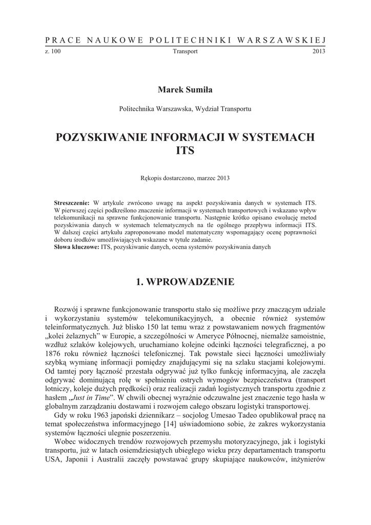 PRACE NAUKOWE POLITECHNIKI WARSZAWSKIEJ z. 100 Transport 2013 Marek Sumi!a Politechnika Warszawska, Wydzia7 Transportu POZYSKIWANIE INFORMACJI W SYSTEMACH ITS R9kopis dostarczono, marzec 2013 Streszczenie: W artykule zwrócono uwag9 na aspekt pozyskiwania danych w systemach ITS. W pierwszej cz9>ci podkre>lono znaczenie informacji w systemach transportowych i wskazano wp7yw telekomunikacji na sprawne funkcjonowanie transportu. Nast9pnie krótko opisano ewolucj9 metod pozyskiwania danych w systemach telematycznych na tle ogólnego przep7ywu informacji ITS. W dalszej cz9>ci artyku7u zaproponowano model matematyczny wspomagaj@cy ocen9 poprawno>ci doboru >rodków umoDliwiaj@cych wskazane w tytule zadanie. S!owa kluczowe: ITS, pozyskiwanie danych, ocena systemów pozyskiwania danych 1. WPROWADZENIE Rozwój i sprawne funkcjonowanie transportu sta7o si9 moDliwe przy znacz@cym udziale i wykorzystaniu systemów telekomunikacyjnych, a obecnie równieD systemów teleinformatycznych. JuD blisko 150 lat temu wraz z powstawaniem nowych fragmentów „kolei Delaznych” w Europie, a szczególno>ci w Ameryce Pó7nocnej, niemalDe samoistnie, wzd7uD szlaków kolejowych, uruchamiano kolejne odcinki 7@czno>ci telegraficznej, a po 1876 roku równieD 7@czno>ci telefonicznej. Tak powsta7e sieci 7@czno>ci umoDliwia7y szybk@ wymian9 informacji pomi9dzy znajduj@cymi si9 na szlaku stacjami kolejowymi. Od tamtej pory 7@czno>Y przesta7a odgrywaY juD tylko funkcj9 informacyjn@, ale zacz97a odgrywaY dominuj@c@ rol9 w spe7nieniu ostrych wymogów bezpiecze[stwa (transport lotniczy, koleje duDych pr9dko>ci) oraz realizacji zada[ logistycznych transportu zgodnie z has7em „Just in Time”. W chwili obecnej wyra^nie odczuwalne jest znaczenie tego has7a w globalnym zarz@dzaniu dostawami i rozwojem ca7ego obszaru logistyki transportowej. Gdy w roku 1963 japo[ski dziennikarz – socjolog Umesao Tadeo opublikowa7 prac9 na temat spo7ecze[stwa informacyjnego [14] u>wiadomiono sobie, De zakres wykorzystania systemów 7@czno>ci ulegnie poszerzeniu. Wobec widocznych trendów rozwojowych przemys7u motoryzacyjnego, jak i logistyki transportu, juD w latach osiemdziesi@tych ubieg7ego wieku przy departamentach transportu USA, Japonii i Australii zacz97y powstawaY grupy skupiaj@ce naukowców, inDynierów ! 202 Marek Sumi7a ! telekomunikacji i sterowania ruchem drogowym maj@ce na celu opracowanie i wdroDenie rozwi@za[ informacyjnych umoDliwiaj@cych popraw9 funkcjonowania transportu drogowego w miastach i na autostradach. Grupy te stanowi7y zal@Dek pierwszych instytucji ITS (Intelligent Transportation Systems) [9]. Dalszy ich rozwój sta7 si9 moDliwy tylko dzi9ki wzajemnej wspó7pracy na trzech p7aszczyznach: technologicznej, systemowej i instytucjonalnej. P7aszczyzna technologiczna jest szczególnie wyra^nie odczuwalna w zakresie >rodków komunikacji mobilnej oraz systemów teleinformatycznych. P7aszczyzna systemowa to przede wszystkim dzia7ania maj@ce na celu w7a>ciwe wykorzystanie i propagowanie informacji. Wreszcie p7aszczyzna instytucjonalna, której zadaniem jest propagowanie idei ITS, dostosowanie norm prawnych, inicjowanie programów badawczych i przydzielanie >rodków na cele z tym zwi@zane [13]. Dzi> poj9cie Inteligentnych Systemów Transportowych jest usystematyzowane i oznacza zastosowanie wysokorozwini9tych technologii zarz@dzania, telekomunikacyjnych, elektroniki (hardware) i informatycznych (software) do wspomagania systemów transportu powierzchniowego [12]. Celem ITS wg [1] jest poprawa bezpiecze[stwa i mobilno>ci transportu oraz zwi9kszenie jego wydajno>ci poprzez integracj9 zaawansowanych technologii telekomunikacyjnych w ramach infrastruktury transportowej i w pojazdach. Kluczowe znaczenie w rozwoju systemów sta7o si9 pozyskiwanie danych, których ^ród7em sta7a si9 nie tylko infrastruktura transportowa, jak równieD odpowiednio doposaDone pojazdy. 2. DEFINICJA I EWOLUCJA METOD POZYSKIWANIA INFORMACJI W SYSTEMACH ITS Pozyskiwanie informacji w systemach ITS polega na zapewnieniu >rodków technicznych maj@cym na celu zdobycie wiedzy o stanie pojazdów i infrastruktury drogowej. Proces pozyskiwania informacji jest pierwszym etapem ogólnego przep7ywu informacji w systemach ITS maj@cego wp7yw na czas podróDy kierowców, bezpiecze[stwo podróDy, komfort jazdy, nadzór procesu transportowego, jak równieD koszty transportu ludzi i towarów. Uczestnikami, zainteresowanymi zdobyciem informacji, s@ podróDuj@cy, centra zarz@dzania ITS, zarz@dcy infrastruktury transportowej i przewo^nicy. hród7em informacji moDe byY zewn9trzny obserwator, uczestnik ruchu, urz@dzenie telematyczne zainstalowane na pok7adzie pojazdu lub urz@dzenie b9d@ce w otoczeniu infrastruktury transportowej i wreszcie hurtownie danych centrów zarz@dzania ITS. Generalnie, ^ród7em informacji o stanie procesu transportowego s@ ludzie i czujniki, ^ród7em informacji dla cz7owieka s@ systemy prezentacji danych, np.: znaki zmiennej tre>ci, interfejsy MMI. W dalszej cz9>ci artyku7u podj9to analiz9 pozyskiwania danych pochodz@cych z urz@dze[ telematyki przy uDyciu dost9pnych >rodków 7@czno>ci. Pozyskiwanie danych na tle przep7ywu informacji, w ogólnym uj9ciu, przedstawiono na rysunku 1. ! Pozyskiwanie danych w systemach ITS 203 ! Rys. 1. Przep7yw informacji w systemach ITS [4] Wskazuje si9 cztery generacje metod pozyskiwania danych o stanie infrastruktury transportowej [12]. Pierwsza generacja systemów pozyskiwania wiedzy o stanie dróg bazowa7a na fizycznej obserwacji infrastruktury drogowej. Obserwacja ta mog7a byY przeprowadzona punktowo przez osob9 obserwuj@c@ okre>lone skrzyDowanie dróg lub arteri9 komunikacyjn@, jak równieD obszarowo, z powietrza, wykorzystuj@c do tego celu helikoptery. W Polsce od lat dziewi9Ydziesi@tych ubieg7ego wieku, na obszarze duDych miast, wykorzystuje si9 wspó7pracuj@ce z rozg7o>niami radiowymi, korporacje taksówkowe, których flota przemieszczaj@c si9 ulicami miast, zbiera i przekazuje informacje o stanie przejezdno>ci ulic, 