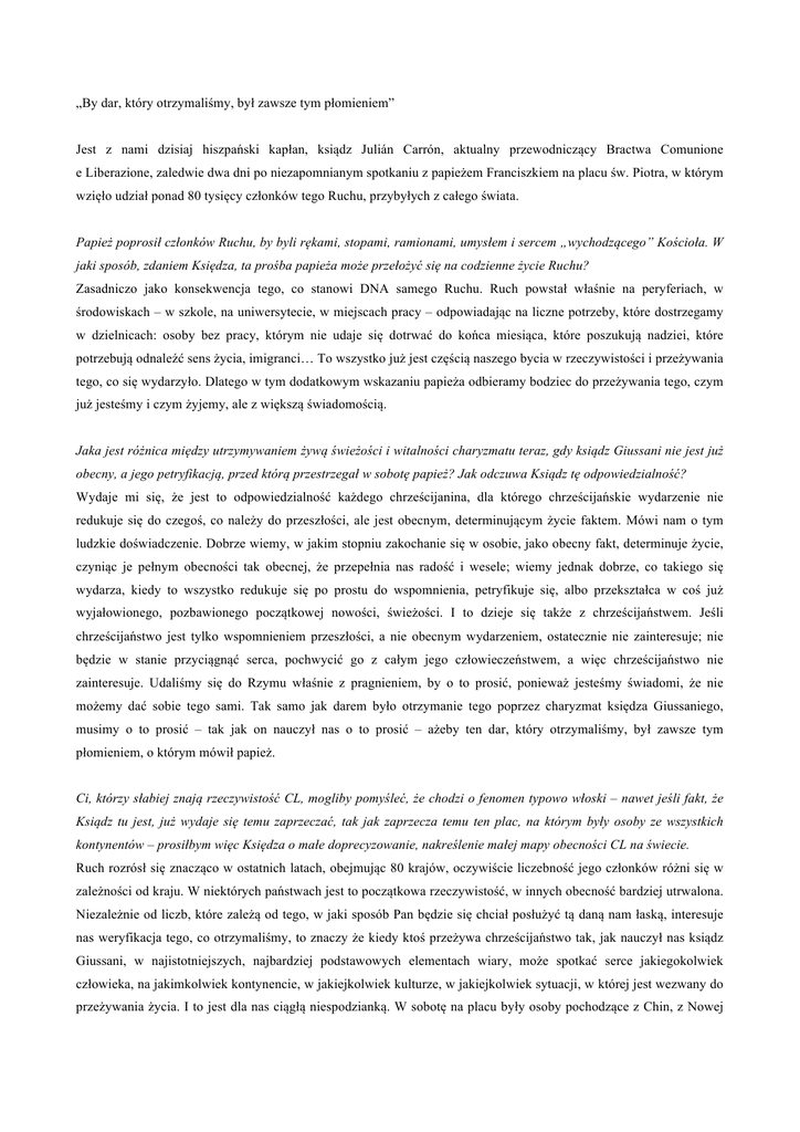 „By dar, który otrzymaliśmy, był zawsze tym płomieniem” Jest z nami dzisiaj hiszpański kapłan, ksiądz Julián Carrón, aktualny przewodniczący Bractwa Comunione e Liberazione, zaledwie dwa dni po niezapomnianym spotkaniu z papieżem Franciszkiem na placu św. Piotra, w którym wzięło udział ponad 80 tysięcy członków tego Ruchu, przybyłych z całego świata. Papież poprosił członków Ruchu, by byli rękami, stopami, ramionami, umysłem i sercem „wychodzącego” Kościoła. W jaki sposób, zdaniem Księdza, ta prośba papieża może przełożyć się na codzienne życie Ruchu? Zasadniczo jako konsekwencja tego, co stanowi DNA samego Ruchu. Ruch powstał właśnie na peryferiach, w środowiskach – w szkole, na uniwersytecie, w miejscach pracy – odpowiadając na liczne potrzeby, które dostrzegamy w dzielnicach: osoby bez pracy, którym nie udaje się dotrwać do końca miesiąca, które poszukują nadziei, które potrzebują odnaleźć sens życia, imigranci… To wszystko już jest częścią naszego bycia w rzeczywistości i przeżywania tego, co się wydarzyło. Dlatego w tym dodatkowym wskazaniu papieża odbieramy bodziec do przeżywania tego, czym już jesteśmy i czym żyjemy, ale z większą świadomością. Jaka jest różnica między utrzymywaniem żywą świeżości i witalności charyzmatu teraz, gdy ksiądz Giussani nie jest już obecny, a jego petryfikacją, przed którą przestrzegał w sobotę papież? Jak odczuwa Ksiądz tę odpowiedzialność? Wydaje mi się, że jest to odpowiedzialność każdego chrześcijanina, dla którego chrześcijańskie wydarzenie nie redukuje się do czegoś, co należy do przeszłości, ale jest obecnym, determinującym życie faktem. Mówi nam o tym ludzkie doświadczenie. Dobrze wiemy, w jakim stopniu zakochanie się w osobie, jako obecny fakt, determinuje życie, czyniąc je pełnym obecności tak obecnej, że przepełnia nas radość i wesele; wiemy jednak dobrze, co takiego się wydarza, kiedy to wszystko redukuje się po prostu do wspomnienia, petryfikuje się, albo przekształca w coś już wyjałowionego, pozbawionego początkowej nowości, świeżości. I to dzieje się także z chrześcijaństwem. Jeśli chrześcijaństwo jest tylko wspomnieniem przeszłości, a nie obecnym wydarzeniem, ostatecznie nie zainteresuje; nie będzie w stanie przyciągnąć serca, pochwycić go z całym jego człowieczeństwem, a więc chrześcijaństwo nie zainteresuje. Udaliśmy się do Rzymu właśnie z pragnieniem, by o to prosić, ponieważ jesteśmy świadomi, że nie możemy dać sobie tego sami. Tak samo jak darem było otrzymanie tego poprzez charyzmat księdza Giussaniego, musimy o to prosić – tak jak on nauczył nas o to prosić – ażeby ten dar, który otrzymaliśmy, był zawsze tym płomieniem, o którym mówił papież. Ci, którzy słabiej znają rzeczywistość CL, mogliby pomyśleć, że chodzi o fenomen typowo włoski – nawet jeśli fakt, że Ksiądz tu jest, już wydaje się temu zaprzeczać, tak jak zaprzecza temu ten plac, na którym były osoby ze wszystkich kontynentów – prosiłbym więc Księdza o małe doprecyzowanie, nakreślenie małej mapy obecności CL na świecie. Ruch rozrósł się znacząco w ostatnich latach, obejmując 80 krajów, oczywiście liczebność jego członków różni się w zależności od kraju. W niektórych państwach jest to początkowa rzeczywistość, w innych obecność bardziej utrwalona. Niezależnie od liczb, które zależą od tego, w jaki sposób Pan będzie się chciał posłużyć tą daną nam łaską, interesuje nas weryfikacja tego, co otrzymaliśmy, to znaczy że kiedy ktoś przeżywa chrześcijaństwo tak, jak nauczył nas ksiądz Giussani, w najistotniejszych, najbardziej podstawowych elementach wiary, może spotkać serce jakiegokolwiek człowieka, na jakimkolwiek kontynencie, w jakiejkolwiek kulturze, w jakiejkolwiek sytuacji, w której jest wezwany do przeżywania życia. I to jest dla nas ciągłą niespodzianką. W sobotę na placu były osoby pochodzące z Chin, z Nowej Zelandii, ze Stanów Zjednoczonych, z Ameryki Łacińskiej czy z Rosji. I to mówi, że serce człowieka, każdego człowieka pod jakąkolwiek szerokością geograficzną, czeka na spotkanie, które mogłoby nadać smaku jego życiu. Papież Franciszek powiedział, że chrześcijańska moralność nie jest tytanicznym wysiłkiem, by być spójnym z serią zasad, ale wzruszoną odpowiedzią człowieka na nieprzewidywalne miłosierdzie Boga. Mam wrażenie, że jest to kwestia, która dzisiaj w niektórych środowiskach kościelnych jest paląca, wznieca dyskusje i oczywiście pokazuje wyjątkową zgodność z pojmowaniem księdza Giussaniego. To my w pierwszej kolejności jesteśmy wzruszeni faktem, że coś, co ksiądz Giussani mówił nam wiele lat temu – a co gdy słyszeliśmy to po raz pierwszy, zdumiało nas tak bardzo, że nas poruszyło, ponieważ poczuliśmy się objęci w naszym człowieczeństwie oraz w naszym grzechu – dzisiaj powiedział papież całemu Kościołowi. I to mówi nam o jednej zasadniczej dla zrozumienia chrześcijaństwa rzeczy: że chrześcijaństwo może być zredukowane – jak podkreślali to już wcześniejsi papieże, poczynając od Jana Pawła I, następnie Jana Pawła II i Benedykta XVI – do etyki. Ksiądz Giussani zawsze nam przypominał sławne stwierdzenie Jana Pawła I, według którego Kościół w usiłowaniu ukazywania się nowoczesnym przekształcił początkowe zdumienie w serię reguł, w tytaniczny wysiłek człowieka. Na to kładli nacisk przy wielu okazjach Jan Paweł II i Benedykt XVI: kiedy chrześcijaństwo zostaje zredukowane tylko do tego, traci swoją prawdziwą naturę wydarzenia, które zmienia życie. W sobotę papież przywołał sławną scenę Powołania św. Mateusza, namalowaną przez Caravaggia, na której sam Mateusz, grzesznik ze względu na sam tylko wykonywany przez siebie zawód, poborca podatkowy, jest pełen zd