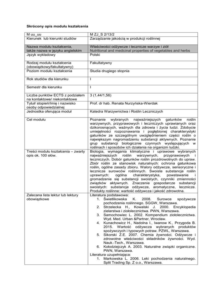 Skrócony opis modułu kształcenia M uu_uu Kierunek lub kierunki studiów M ZJ_S 2/13/2 Zarządzanie jakością w produkcji roślinnej Nazwa modułu kształcenia, także nazwa w języku angielskim Język wykładowy Właściwości odżywcze i lecznicze warzyw i ziół Nutritional and medicinal properties of vegetables and herbs Polski Rodzaj modułu kształcenia (obowiązkowy/fakultatywny) Poziom modułu kształcenia Fakultatywny Rok studiów dla kierunku I Semestr dla kierunku I Liczba punktów ECTS z podziałem na kontaktowe/ niekontaktowe Tytuł/ stopień/Imię i nazwisko osoby odpowiedzialnej Jednostka oferująca moduł 3 (1,44/1,56) Cel modułu Poznanie wybranych najważniejszych gatunków roślin warzywnych, przyprawowych i leczniczych uprawianych oraz dzikorosnących, ważnych dla zdrowia i życia ludzi. Zdobycie umiejętności rozpoznawania i pogłębionej charakterystyki gatunków ze szczególnym uwzględnieniem części roślin o największym nagromadzeniu substancji aktywnych. Poznanie grup substancji biologicznie czynnych występujących w roślinach i sposobów ich działania na organizm ludzki. Biologia, wymagania klimatyczne i uprawowe wybranych najważniejszych roślin warzywnych, przyprawowych i leczniczych. Dobór gatunków roślin prozdrowotnych do upraw. Zbiór roślin ze stanowisk naturalnych: ochrona gatunkowa roślin, ogólne zasady zbioru. Walory odżywcze, sensoryczne i lecznicze surowców roślinnych. Swoiste substancje roślin uprawnych: ogólna charakterystyka, powstawanie i gromadzenie się substancji swoistych, czynniki zmienności związków aktywnych. Znaczenie gospodarcze substancji swoistych: substancje odżywcze, aromatyczne, lecznicze. Produkty roślinne: wartość odżywcza i jakość zdrowotna. Literatura podstawowa: 1. Świetlikowska K. 2008. Surowce spożywcze pochodzenia roślinnego. SGGW, Warszawa. 2. Strzelecka H., Kowalski J. 2000. Encyklopedia zielarstwa i ziołolecznictwa. PWN, Warszawa. 3. Samochowiec L. 2002. Kompendium ziołolecznictwa. Wyd. Med. Urban &Partner, Wrocław. 4. Kunachowicz H., Nadolna I., Iwanow K., Przygoda B. 2015. Wartość odżywcza wybranych produktów spożywczych i typowych potraw. PZWL, Warszawa. 5. Sikorski Z.E. 2007. Chemia żywności. Odżywcze i zdrowotne właściwości składników żywności. Wyd. Nauk.-Tech., Warszawa. 6. Kołodziejczyk A. 2003. Naturalne związki organiczne. PWN, Warszawa. Literatura uzupełniająca: 1. Markowska L. 2006. Leki pochodzenia naturalnego. Split Trading Sp. Z o.o., Warszawa. Treści modułu kształcenia – zwarty opis ok. 100 słów. Zalecana lista lektur lub lektury obowiązkowe Studia drugiego stopnia Prof. dr hab. Renata Nurzyńska-Wierdak Katedra Warzywnictwa i Roślin Leczniczych 2. Lewkowicz-Mosiej T. 2014. Zapomniane warzywa. Zysk i S-ka, Poznań. 3. Kosiński M., Krzyściak-Kosińska R. 2008. Atlas ziół. Pascal. Planowane formy/działania/metody dydaktyczne Wykład, ćwiczenia audytoryjne, ćwiczenia laboratoryjne materiałem roślinnym.