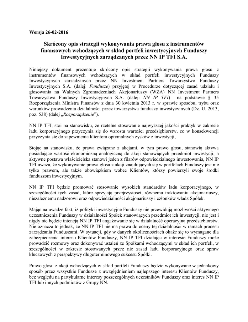 Wersja 26-02-2016 Skrócony opis strategii wykonywania prawa głosu z instrumentów finansowych wchodzących w skład portfeli inwestycyjnych Funduszy Inwestycyjnych zarządzanych przez NN IP TFI S.A. Niniejszy dokument prezentuje skrócony opis strategii wykonywania prawa głosu z instrumentów finansowych wchodzących w skład portfeli inwestycyjnych Funduszy Inwestycyjnych zarządzanych przez NN Investment Partners Towarzystwo Funduszy Inwestycyjnych S.A. (dalej: Fundusze) przyjętej w Procedurze dotyczącej zasad udziału i głosowania na Walnych Zgromadzeniach Akcjonariuszy (WZA) NN Investment Partners Towarzystwa Funduszy Inwestycyjnych S.A. (dalej: NN IP TFI) na podstawie § 35 Rozporządzenia Ministra Finansów z dnia 30 kwietnia 2013 r. w sprawie sposobu, trybu oraz warunków prowadzenia działalności przez towarzystwa funduszy inwestycyjnych (Dz. U. 2013, poz. 538) (dalej „Rozporządzenie”). NN IP TFI, stoi na stanowisku, że rzetelne stosowanie najwyższej jakości praktyk w zakresie ładu korporacyjnego przyczynia się do wzrostu wartości przedsiębiorstw, co w konsekwencji przyczynia się do zapewnienia klientom optymalnych zysków z inwestycji, Stojąc na stanowisku, że prawa związane z akcjami, w tym prawo głosu, stanowią aktywa posiadające wartość ekonomiczną analogiczną do akcji stanowiących przedmiot inwestycji, a aktywne postawa właścicielska stanowi jeden z filarów odpowiedzialnego inwestowania, NN IP TFI uważa, że wykonywanie prawa głosu z akcji znajdujących się w portfelach Funduszy jest nie tylko prawem, ale także obowiązkiem wobec Klientów, którzy powierzyli swoje środki funduszom inwestycyjnym. NN IP TFI będzie promować stosowanie wysokich standardów ładu korporacyjnego, w szczególności tych zasad, które sprzyjają przejrzystości, równemu traktowaniu akcjonariuszy, niezależnemu nadzorowi oraz odpowiedzialności akcjonariuszy i członków władz Spółek. Mając na uwadze fakt, iż polityki inwestycyjne Funduszy nie przewidują możliwości aktywnego uczestniczenia Funduszy w działalności Spółek stanowiących przedmiot ich inwestycji, nie jest i nigdy nie będzie intencją NN IP TFI angażowanie się w działalność operacyjną przedsiębiorstw. Nie oznacza to jednak, że NN IP TFI nie ma prawa do oceny tej działalności w ramach procesu zarządzania Funduszami. W sytuacji, gdy w danych okolicznościach okaże się to wymagane dla zabezpieczenia interesu Klientów Funduszy, NN IP TFI działając w interesie Funduszy może prowadzić rozmowy oraz dokonywać ustaleń ze Spółkami wchodzącymi w skład ich portfeli, w szczególności w zakresie stosowanych przez nie zasad ładu korporacyjnego oraz spraw kluczowych z perspektywy długoterminowego sukcesu Spółki. Prawo głosu z akcji wchodzących w skład portfeli Funduszy będzie wykonywane w jednakowy sposób przez wszystkie Fundusze z uwzględnieniem najlepszego interesu Klientów Funduszy, bez względu na partykularne interesy poszczególnych uczestników Funduszy oraz interes NN IP TFI lub innych podmiotów z Grupy NN. W przypadku powierzenia zarządzania portfelami Funduszy podmiotowi zewnętrznemu NN IP TFI nie udziela pełnomocnictwa do wykonywania prawa głosu z akcji znajdujących się w portfelach Funduszy. Zasady udziału i głosowania na WZA mają służyć przede wszystkim: 1) wykonywaniu prawa głosu w najlepszym interesie Klientów Funduszy, bez względu na wpływ podjętych decyzji na interesy NN IP TFI oraz interesy innych podmiotów z Grupy NN; 2) zapobieganiu konfliktom interesów wynikających z wykonywania prawa głosu oraz zarządzaniu nimi; 3) zapewnieniu, że prawa głosu są wykonywane zgodnie z celami inwestycyjnymi i polityką inwestycyjną poszczególnych Funduszy oraz 4) zapewnieniu jak największej przejrzystości decyzji podejmowanych przez NN IP TFI w procesie zarządzania Funduszami. Zasady wykonywania prawa głosu Z uwzględnieniem akapitów poniższych, Fundusze powinny uczestniczyć w WZA oraz wykonywać prawo głosu przynależne do posiadanych przez nie akcji, chyba że wykonanie tychże praw w danych okolicznościach nie będzie zgodne z najlepszym interesem Klientów Funduszy bądź też nie będzie to dozwolone postanowieniami obowiązujących w danym państwie regulacji. Fundusze obowiązane są uczestniczyć w WZA Spółki, jeśli jej akcje w portfelach Funduszy dają prawo do wykonywania głosów stanowiących co najmniej 5% ogólnej liczby głosów wynikających z wyemitowanych przez Spółkę akcji. W przypadku, gdy akcje w portfelach Funduszy dają prawo do wykonywania głosów stanowiących mniej niż 5% ogólnej liczby głosów wynikających z wyemitowanych przez Spółkę akcji, Fundusze powinny uczestniczyć w tych WZA, których przedmiotem są istotne sprawy Spółki, a zaniechanie wykonywania prawa głosu zwiększyłoby ryzyko istotnego zmniejszenia wartości posiadanych akcji. Fundusze powinny uczestniczyć w WZA Spółki, jeśli NN IP TFI uzna to za konieczne lub użyteczne z punktu widzenia celu inwestycyjnego Funduszy, ich polityki inwestycyjnej, stosowanych zasad ładu korporacyjnego i obowiązków powierniczych. W szczególności dotyczy to: a) podwyższenia kapitału w drodze emisji akcji z wyłączeniem prawa poboru, b) akceptacji programów opcyjnych (bądź innych powiązanych z akcjami form wynagrodzenia), c) zmian statutu Spółki dotyczących zagadnień związanych z przejęciem Spółki, d) zmian statutu Spółki dotyczących zagadnień związanych z równoprawnym traktowaniem akcjonariuszy. W sytuacji, gdy uczestnictwo w WZA wiązać się będzie z koniecznością poniesienia kosztów nieproporcjonalnych do możliwych do osiągnięcia korzyści, bądź też będzie nadmiernie utrudnione, NN IP TFI zastrzega, iż ewentualne uczestnictwo w tym WZA i wykonywanie prawa głosu przez Fundusze pozostanie do decyzji NN IP TFI. Zasada ta odnosi się zarówno do przypadku dysponowania jak i niedysponowania pakietam