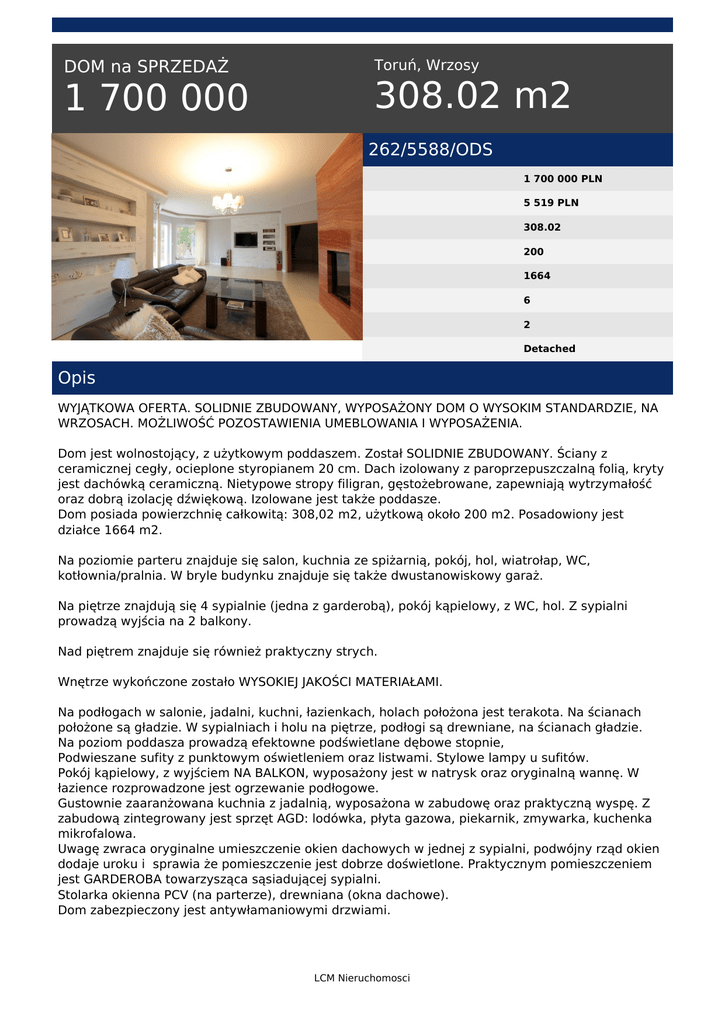 DOM na SPRZEDAŻ 1 700 000 Toruń, Wrzosy 308.02 m2 262/5588/ODS 1 700 000 PLN 5 519 PLN 308.02 200 1664 6 2 Detached Opis WYJĄTKOWA OFERTA. SOLIDNIE ZBUDOWANY, WYPOSAŻONY DOM O WYSOKIM STANDARDZIE, NA WRZOSACH. MOŻLIWOŚĆ POZOSTAWIENIA UMEBLOWANIA I WYPOSAŻENIA. Dom jest wolnostojący, z użytkowym poddaszem. Został SOLIDNIE ZBUDOWANY. Ściany z ceramicznej cegły, ocieplone styropianem 20 cm. Dach izolowany z paroprzepuszczalną folią, kryty jest dachówką ceramiczną. Nietypowe stropy filigran, gęstożebrowane, zapewniają wytrzymałość oraz dobrą izolację dźwiękową. Izolowane jest także poddasze. Dom posiada powierzchnię całkowitą: 308,02 m2, użytkową około 200 m2. Posadowiony jest działce 1664 m2. Na poziomie parteru znajduje się salon, kuchnia ze spiżarnią, pokój, hol, wiatrołap, WC, kotłownia/pralnia. W bryle budynku znajduje się także dwustanowiskowy garaż. Na piętrze znajdują się 4 sypialnie (jedna z garderobą), pokój kąpielowy, z WC, hol. Z sypialni prowadzą wyjścia na 2 balkony. Nad piętrem znajduje się również praktyczny strych. Wnętrze wykończone zostało WYSOKIEJ JAKOŚCI MATERIAŁAMI. Na podłogach w salonie, jadalni, kuchni, łazienkach, holach położona jest terakota. Na ścianach położone są gładzie. W sypialniach i holu na piętrze, podłogi są drewniane, na ścianach gładzie. Na poziom poddasza prowadzą efektowne podświetlane dębowe stopnie, Podwieszane sufity z punktowym oświetleniem oraz listwami. Stylowe lampy u sufitów. Pokój kąpielowy, z wyjściem NA BALKON, wyposażony jest w natrysk oraz oryginalną wannę. W łazience rozprowadzone jest ogrzewanie podłogowe. Gustownie zaaranżowana kuchnia z jadalnią, wyposażona w zabudowę oraz praktyczną wyspę. Z zabudową zintegrowany jest sprzęt AGD: lodówka, płyta gazowa, piekarnik, zmywarka, kuchenka mikrofalowa. Uwagę zwraca oryginalne umieszczenie okien dachowych w jednej z sypialni, podwójny rząd okien dodaje uroku i sprawia że pomieszczenie jest dobrze doświetlone. Praktycznym pomieszczeniem jest GARDEROBA towarzysząca sąsiadującej sypialni. Stolarka okienna PCV (na parterze), drewniana (okna dachowe). Dom zabezpieczony jest antywłamaniowymi drzwiami. LCM Nieruchomosci W domu może pozostać UMEBLOWANIE I WYPOSAŻENIE. Ogrzewanie zapewnia nowoczesny, oszczędny gazowy piec kondensacyjny "Viessmann", z zasobnikiem wody 300 litrów, oraz PRÓŻNIOWE PANELE SŁONECZNE. Ciepła i niepowtarzalnego nastroju doda KOMINEK w salonie. Salon posiada wyjście do ogrodu przez duży TARAS wyłożony płytkami. Ogród jest ładnie zagospodarowany krzewami, trawą. Znajduje się w nim góralska chatka, z grillem, wędzarnia, oczko wodne. Ogród posiada elektrycznie sterowane nawadnianie zieleni. Przed i wokół domu położone jest 810 m2 kostki brukowej. Przednia część działki z wybrukowanym podjazdem. Ogrodzenie działki, częściowo drewniane, częściowo kute. Elektrycznie sterowana brama wjazdowa. Wszystkie dostępne media pochodzą z sieci miejskiej : wodociąg, kanalizacja, gaz. Otoczenie to luźna zabudowa. Teren bardzo dobrze zagospodarowany, dzięki czemu przebywając na terenie posesji można cieszyć się poczuciem prywatności. Lokalizacja w SĄSIEDZTWIE LASU, jednocześnie w pobliżu pełnej infrastruktury: sklepów, marketów, przystanków autobusowych. W pobliżu przedszkole, szkoła, piekarnia, centrum fitness. 6 kilometrów do Starego Miasta. WYSOKI STANDARD I FUNKCJONALNOŚĆ W ŚWIETNEJ LOKALIZACJI! POLECAM !!! POŚREDNICTWO W OBROCIE NIERUCHOMOŚCIAMI JEST USŁUGĄ ODPŁATNĄ. Oświadczenie Biuro Pośrednictwa LCM Nieruchomości działa zgodnie z zasadami Standardów Zawodowych Pośredników w Obrocie Nieruchomościami, zamieszcza w ofertach informacje prawdziwe wg wszelkiej wiedzy i starania, nie łamie regulaminów serwisów nieruchomościowych, w tym nie publikuje celowo nieaktualnych i nieistniejących ofert, oraz stanowczo odcina się od praktyk nieetycznych i wprowadzających inne firmy oraz potencjalnych klientów w błąd. ZAPEWNIAMY BEZPŁATNE I PROFESJONALNE DORADZTWO W ZAKRESIE POZYSKIWANIA KREDYTÓW HIPOTECZNYCH NA ZAKUP NIERUCHOMOŚCI Powyższe informacje zostały sporządzone na podstawie oświadczeń i nie są ofertą w rozumieniu przepisów Kodeksu Cywilnego. Mają one jedynie charakter informacyjny. Joanna Bucewicz tel. 793941092 email: [email protected] LCM Nieruchomosci Powered by TCPDF (www.tcpdf.org)