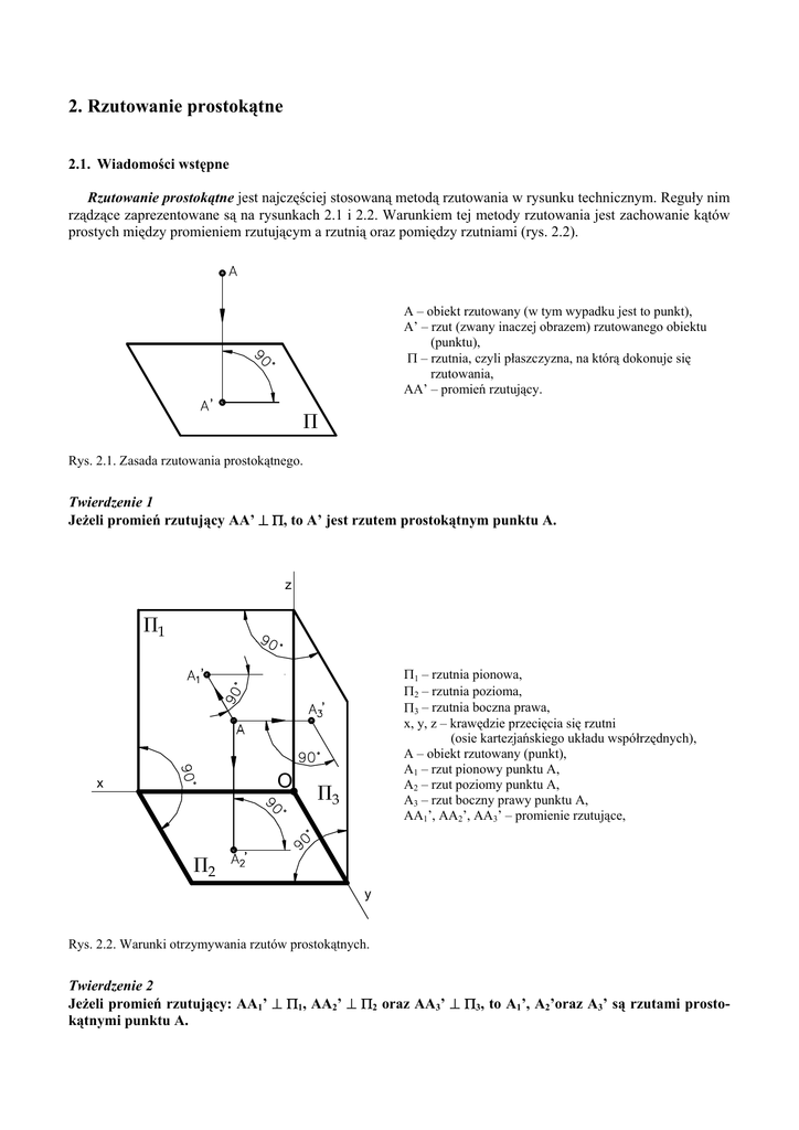 2. Rzutowanie prostokątne 2.1. Wiadomości wstępne Rzutowanie prostokątne jest najczęściej stosowaną metodą rzutowania w rysunku technicznym. Reguły nim rządzące zaprezentowane są na rysunkach 2.1 i 2.2. Warunkiem tej metody rzutowania jest zachowanie kątów prostych między promieniem rzutującym a rzutnią oraz pomiędzy rzutniami (rys. 2.2). A – obiekt rzutowany (w tym wypadku jest to punkt), A’ – rzut (zwany inaczej obrazem) rzutowanego obiektu (punktu), Π – rzutnia, czyli płaszczyzna, na którą dokonuje się rzutowania, AA’ – promień rzutujący. Π Rys. 2.1. Zasada rzutowania prostokątnego. Twierdzenie 1 Jeżeli promień rzutujący AA’ ⊥ Π, to A’ jest rzutem prostokątnym punktu A. z Π1 O x Π1 – rzutnia pionowa, Π2 – rzutnia pozioma, Π3 – rzutnia boczna prawa, x, y, z – krawędzie przecięcia się rzutni (osie kartezjańskiego układu współrzędnych), A – obiekt rzutowany (punkt), A1 – rzut pionowy punktu A, A2 – rzut poziomy punktu A, A3 – rzut boczny prawy punktu A, AA1’, AA2’, AA3’ – promienie rzutujące, Π3 Π2 y Rys. 2.2. Warunki otrzymywania rzutów prostokątnych. Twierdzenie 2 Jeżeli promień rzutujący: AA1’ ⊥ Π1, AA2’ ⊥ Π2 oraz AA3’ ⊥ Π3, to A1’, A2’oraz A3’ są rzutami prostokątnymi punktu A. 36 Elementy zapisu konstrukcji - Marcin Graba Wyróżnia się dwie metody rzutowania prostokątnego: ¾ rzutowanie prostokątne metodą europejską – E , ¾ rzutowanie prostokątne metodą amerykańską – A. 2.2. Rzutowanie prostokątne metodą europejską – E Rzutowanie prostokątne metodą europejską – E polega na wyznaczaniu rzutów prostokątnych przedmiotu na wzajemnie prostopadłych rzutniach, przy założeniu, że przedmiot rzutowany znajduje się między obserwatorem a rzutnią. Rzutnię tworzą ściany wyobrażalnego prostopadłościanu, wewnątrz którego znajduje się przedmiot rzutowany. Wyróżnia się trzy rzutnie podstawowe I, II i III, oraz rzutnie leżące naprzeciw nich, które oznacza się odpowiednio I’, II’ i III’. Układ rzutni w rzutowaniu metodą europejską – E przedstawiono na rysunku 2.3. I III II Rys. 2.3. Układ rzutni w rzutowaniu metodą europejską – E. Przedmiot charakterystyczny należy ustawić w taki sposób, aby jego charakterystyczne płaszczyzny i osie były równoległe lub prostopadłe do rzutni. Wówczas, zgodnie z metodą europejską – E, na rzutniach tych wyznacza się rzuty prostokątne przedmiotu. Kierunki rzutowania obrazuje rysunek 2.4. Po rozwinięciu ścian prostopadłościanu otrzymuje się następujący rozkład rzutów (rys. 2.5): 9 rzut główny (rzut z przodu) – rzut w kierunku A – na rzutnię I, 9 rzut z góry – rzut w kierunku B – na rzutnię II, 9 rzut od lewej strony (rzut boczny prawy) – rzut w kierunku C – na rzutnię III, 9 rzut od prawej strony (rzut boczny lewy) – rzut w kierunku D – na rzutnię III’, 9 rzut z dołu – rzut w kierunku E – na rzutnię II’, 9 rzut z góry – rzut w kierunku F – na rzutnię I’. Marcin Graba - Rzutowanie prostokątne 37 F B C D A E Rys. 2.4. Oznaczenie kierunków rzutowania w metodzie europejskiej – E. Nazwy kolejnych rzutów określają także ich położenie w stosunku do rzutu głównego. Przyjmując rzutnię I za płaszczyznę rysunku i kładąc na nią pozostałe rzutnie, rzuty rozmieszcza się zasadniczo w następujący sposób: rzut główny – w głównym polu rysunku, rzut boczny prawy – z prawej strony rzutu głównego, rzut z góry – pod rzutem głównym, rzut boczny lewy – z lewej strony rzutu głównego, rzut z dołu – nad rzutem głównym, rzut z tyłu – z prawej strony rzutu bocznego prawego (jeżeli rozmieszczenie nie pozwala na zachowanie tej normy, rzut z tyłu można umieścić ewentualnie z lewej strony rzutu bocznego lewego). II' I' III' I III I' II Rys. 2.5. Rozkład rzutów w metodzie europejskiej – E. Rzut główny przedstawia zwykle przedmiot w położeniu użytkowym, widziany ze strony prezentującej najwięcej cech charakterystycznych. Zasada ta dotyczy zarówno rzutu przedstawiającego złożenie, jak i rzutu poszczególnych części. Z konstrukcyjnego punktu widzenia rzut główny powinien prezentować sobą jak najwięcej cech rysowanego elementu, co oznacza, że na rzucie tym powinno dążyć się do pokazania maksymalnej liczby krawędzi. Przedmioty wydłużone, zajmujące w rzeczywistości położenie inne niż poziome (np. wrzeciono wiertarki, śruby itp.) oraz przedmioty dowolnego kształtu, przyjmujące położenia w zespole (np. korbowody, dźwignie itp.) przedstawia się w położeniu, jakie zajmują one przy obróbce nadającej im najwięcej kształtów charakterystycznych. 38 Elementy zapisu konstrukcji - Marcin Graba Na rysunkach zabiegowych rzut główny przedstawia przedmiot w położeniu, jakie zajmuje on w danym zabiegu, widziany od strony stanowiska roboczego. Liczbę rzutów należy ograniczać do minimum koniecznego do przejrzystego przedstawienia i zwymiarowania przedmiotu. Rzut główny rysuje się zawsze, a z pozostałych najczęściej stosuje się rzuty na rzutnie II i III. Bardziej zaawansowana technika wymaga wykorzystania minimalnej liczby rzutów łączonej z przekrojami. Przykład 1. Rzutowanie prostokątne metodą europejską – E. Rozkład rzutów w metodzie europejskiej – E dla przykładowej bryły (rys. 2.6) przedstawia rysunek 2.7. Rys. 2.6. Prostopadłościan rzutni z zaznaczonymi kierunkami rzutów [2]. E F D A C F B Rys. 2.7. Rozkład rzutów w metodzie europejskiej – E. 2.3. Rzutowanie prostokątne metodą amerykańską – A W krajach anglosaskich stosuje się nieco inny sposób rzutowania, różny od tego, który powszechnie jest używany w Polsce i w większości krajów Europy Zachodniej. Różnice między metodą europejską i amerykańską wynikają z odmiennego rozmieszczenia rzutów: ¾ rzut główny metody E – w głównym polu rysunku, ¾ rzut z góry metody E