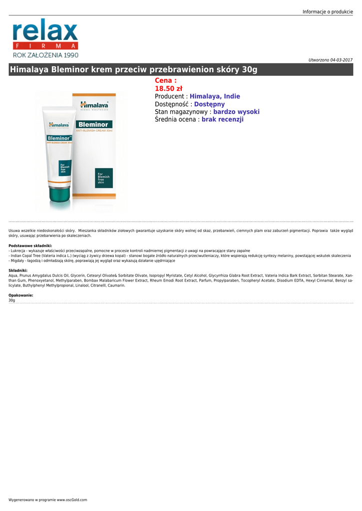Informacje o produkcie Utworzono 04-03-2017 Himalaya Bleminor krem przeciw przebrawienion skóry 30g Cena : 18.50 zł Producent : Himalaya, Indie Dostępność : Dostępny Stan magazynowy : bardzo wysoki Średnia ocena : brak recenzji Usuwa wszelkie niedoskonałości skóry. Mieszanka składników ziołowych gwarantuje uzyskanie skóry wolnej od skaz, przebarwień, ciemnych plam oraz zaburzeń pigmentacji. Poprawia także wygląd skóry, usuwając przebarwienia po skaleczeniach. Podstawowe składniki: - Lukrecja - wykazuje właściwości przeciwzapalne, pomocne w procesie kontroli nadmiernej pigmentacji z uwagi na powracające stany zapalne - Indian Copal Tree (Vateria indica L.) (wyciąg z żywicy drzewa kopal) - stanowi bogate źródło naturalnych przeciwutleniaczy, które wspierają redukcję syntezy melaniny, powstającej wskutek skaleczenia - Migdały - łagodzą i odmładzają skórę, poprawiają jej wygląd oraz wykazują działanie ujędrniające Składniki: Aqua, Prunus Amygdalus Dulcis Oil, Glycerin, Cetearyl Olivate& Sorbitate Olivate, Isopropyl Myristate, Cetyl Alcohol, Glycyrrhiza Glabra Root Extract, Vateria Indica Bark Extract, Sorbitan Stearate, Xanthan Gum, Phenoxyetanol, Methylparaben, Bombax Malabaricum Flower Extract, Rheum Emodi Root Extract, Parfum, Propylparaben, Tocopheryl Acetate, Disodium EDTA, Hexyl Cinnamal, Benzyl salicylate, Buthylphenyl Methylpropional, Linalool, Citranelll, Caumarin. Opakowanie: 30g Wygenerowano w programie www.oscGold.com