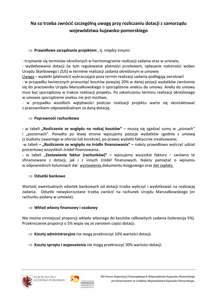 Na co trzeba zwrócić szczególną uwagę przy rozliczaniu dotacji z samorządu województwa kujawsko-pomorskiego ⇒ Prawidłowe zarządzanie projektem , tj. między innymi: - trzymanie się terminów określonych w harmonogramie realizacji zadania oraz w umowie, - wydatkowanie dotacji (w tym regulowanie płatności przelewem, opłacanie należności wobec Urzędu Skarbowego i ZUS) w terminie realizacji zadania określonym w umowie. Uwaga – wydatki (płatności) wykraczające poza termin realizacji zadania podlegają zwrotowi! - w przypadku koniecznych przesunięć kosztów powyżej 20% w danej pozycji wydatków zwrócenie się do pracownika Urzędu Marszałkowskiego o sporządzenie aneksu do umowy. Aneks do umowy musi być sporządzony w trakcie realizacji projektu. Po zakończeniu terminu realizacji określonego w umowie sporządzenie aneksu nie jest możliwe, - w przypadku wszelkich wątpliwości podczas realizacji projektu warto się skontaktować z pracownikiem odpowiedzialnym za daną dotację. ⇒ Poprawność rachunkowa - w tabeli „Rozliczenie ze względu na rodzaj kosztów” – muszą się zgadzać sumy w „pionach” i „poziomach”. Ponadto po lewej stronie wpisujemy pozycje wydatków zgodnie z umową (z budżetu zawartego w ofercie lub korekcie), po prawej wydatki faktycznie zrealizowane; -w tabeli – „Rozliczenie ze względu na źródło finansowania” – należy prawidłowo wyliczyć udział procentowy wszystkich źródeł finansowania. - w tabeli „Zestawienie faktur (rachunków)” – wpisujemy wszystkie faktury – zarówno te sfinansowane z dotacji, jak i z innych źródeł finansowych. Należy pamiętać o wpisaniu w odpowiednich kolumnach dat wystawienia dokumentu księgowego oraz dat zapłaty. ⇒ Odsetki bankowe Wartość ewentualnych odsetek bankowych od dotacji trzeba wyliczyć i wydatkować na realizację zadania. Odsetki niewykorzystane trzeba zwrócić na rachunek Urzędu Marszałkowskiego (nr rachunku podany w umowie). ⇒ Wkład własny finansowy i osobowy Nie można zmniejszyć proporcji wkładu własnego do kosztów całkowitych zadania (tolerancja 5%). Przekroczenie proporcji o 5% wiąże się ze zwrotem części dotacji. ⇒ Koszty administracyjne nie mogą przekroczyć 10% wartości dotacji. ⇒ Koszty sprzętu i wyposażenia nie mogą przekroczyć 30% wartości dotacji. XIII Forum Organizacji Pozarządowych Województwa Kujawsko-Pomorskiego jest finansowane ze środków Województwa Kujawsko-Pomorskiego. ⇒ Terminowe sporządzenie sprawozdania Obowiązujący termin - 30 dni od dnia zakończenia realizacji zadania (przy wysyłce pocztą liczy się data stempla pocztowego). Do sprawozdania załączamy kopie potwierdzonych za zgodność z oryginałem faktur/rachunków opłaconych z dotacji. Nie załączamy kopii faktur, rachunków oraz porozumień z wolontariuszami finansowanych z innych źródeł. Oryginały przechowujemy w siedzibie organizacji. Za nieterminowe złożenie sprawozdania grozi kara umowna w wysokości do 10% wartości dotacji, jednak nie więcej niż 1000 zł. ⇒ Obowiązki informacyjne Należy stosować zapisy zawarte w umowie. Sposób informowania trzeba ponadto opisać w sprawozdaniu. Niewywiązanie się z obowiązków informacyjnych grozi krą umowna do 10% dotacji. ⇒ Zwrot niewykorzystanej części dotacji – w terminie do 15 dni od daty zakończenia realizacji zadania. Opracowanie: Urząd Marszałkowski Województwa Kujawsko-Pomorskiego Biuro Współpracy z Organizacjami Pozarządowymi tel. 56 62 18 371, 56 62 18 403 e-mail: [email protected] XIII Forum Organizacji Pozarządowych Województwa Kujawsko-Pomorskiego jest finansowane ze środków Województwa Kujawsko-Pomorskiego.