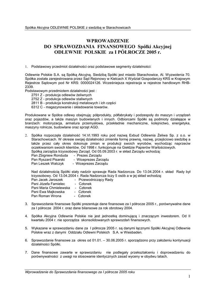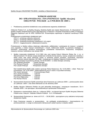 Spółka Akcyjna ODLEWNIE POLSKIE z siedzibą w Starachowicach WPROWADZENIE DO SPRAWOZDANIA FINANSOWEGO Spółki Akcyjnej ODLEWNIE POLSKIE za I PÓŁROCZE 2005 r. 1. Podstawowy przedmiot działalności oraz podstawowe segmenty działalności: Odlewnie Polskie S.A. są Spółką Akcyjną. Siedzibą Spółki jest miasto Starachowice, Al. Wyzwolenia 70. Spółka została zarejestrowana przez Sąd Rejonowy w Kielcach X Wydział Gospodarczy KRS w Krajowym Rejestrze Sądowym pod Nr KRS: 0000024126. Wcześniejsza rejestracja w rejestrze handlowym RHB2339. Podstawowym przedmiotem działalności jest : 2751 Z - produkcja odlewów Ŝeliwnych 2752 Z - produkcja odlewów staliwnych 2811 B - produkcja konstrukcji metalowych i ich części 6312 C - magazynowanie i składowanie towarów. Produkowane w Spółce odlewy obejmują: półprodukty, półfabrykaty i podzespoły do maszyn i urządzeń oraz pojazdów, a takŜe maszyn budowlanych i innych. Odbiorcami Spółki są podmioty działające w branŜach: motoryzacja, armatura przemysłowa, przekładnie mechaniczne, kolejnictwo, energetyka, maszyny rolnicze, budowlane oraz sprzęt AGD. 2. Spółka rozpoczęła działalność 14.VI.1993 roku pod nazwą Exbud Odlewnia śeliwa Sp. z o.o. w Starachowicach. W okresie swojej działalności zmieniła formę prawną, nazwę, przejściowo siedzibę a takŜe przez cały okres dokonuje zmian w produkcji swoich wyrobów, wychodząc naprzeciw oczekiwaniom swoich klientów. Od 1998 r. funkcjonuje na Giełdzie Papierów Wartościowych. Spółką zarządza trzyosobowy Zarząd. Od 05.09.2003 r. w skład Zarządu wchodzą: Pan Zbigniew Ronduda - Prezes Zarządu Pan Ryszard Pisarski - Wiceprezes Zarządu Pan Leszek Walczyk - Wiceprezes Zarządu Nad działalnością Spółki stały nadzór sprawuje Rada Nadzorcza. Do 13.04.2004 r. skład Rady był trzyosobowy. Od 13.04.2004 r. Rada Nadzorcza liczy 5 osób a w jej skład wchodzą: Pan Jacek Jaroszek - Przewodniczący Rady Pani Józefa Famielec - Członek Pani Maria Chmielewska - Członek Pani Ewa Majkowska - Członek Pan Roman Wrona - Członek 3. Sprawozdanie finansowe Spółki prezentuje dane finansowe za I półrocze 2005 r., porównywalne dane za I półrocze 2004 r. oraz dane bilansowe za rok obrotowy 2004. 4. Spółka Akcyjna Odlewnie Polskie nie jest jednostką dominującą i znaczącym inwestorem. Od II kwartału 2004 r. nie sporządza skonsolidowanych sprawozdań finansowych. 5. Wykazane w sprawozdaniu dane za I półrocze 2005 r. są danymi łącznymi Spółki Akcyjnej Odlewnie Polskie wraz z danymi Oddziału Odlewni Polskich S.A. w Wiesbaden. 6. Sprawozdanie finansowe za okres od 01.01. – 30.06.2005 r. sporządzono przy załoŜeniu kontynuacji działalności Spółki. 7. Dane finansowe zawarte w sprawozdaniu nie podlegały przekształceniu i doprowadzeniu do porównywalności z uwagi na stosowanie identycznych zasad wyceny w obydwu latach. Wprowadzenie do Sprawozdania finansowego za I półrocze 2005 roku 1 Spółka Akcyjna ODLEWNIE POLSKIE z siedzibą w Starachowicach 8. W sprawozdaniu za I półrocze 2005 r. nie dokonano korekt wynikających z zastrzeŜeń biegłych rewidentów za rok poprzedni tj. 2004 z uwagi na brak takich zastrzeŜeń. 9. W Spółce Odlewnie Polskie księgi rachunkowe prowadzone są zgodnie z przepisami Ustawy o rachunkowości z 29 września 1994 r. z późniejszymi zmianami (Dz. U. Nr 76 z 2002 r., poz.694) w sposób zapewniający wyodrębnienie wszystkich informacji istotnych dla oceny sytuacji majątkowej i finansowej, wyniku finansowego oraz moŜliwości sporządzenia obowiązujących sprawozdań finansowych w rachunku zysków i strat w układzie kalkulacyjnym - dla potrzeb spełnienia wymogów wynikających z Rozporządzenia Rady Ministrów dot. emitentów papierów wartościowych, i w układzie rodzajowym - dla potrzeb GUS; rachunku przepływów środków pienięŜnych metodą pośrednią jak równieŜ właściwego dokonania rozliczeń podatkowych i innych (US, ZUS, PFRON itp.). 10. Główne zasady to: 1) Rok obrotowy pokrywa się z rokiem kalendarzowym, 2) Ewidencję księgową operacji gospodarczych prowadzi się w układzie syntetycznym i analitycznym zgodnie z ZPK dostosowanym do potrzeb Spółki w sposób zapewniający gromadzenie informacji niezbędnych do oceny sytuacji finansowej i majątkowej, efektywności działania i podejmowania decyzji zarządczych, 3) Wyceny aktywów i pasywów oraz ustalenia wyniku finansowego dokonuje się na zakończenie kaŜdego miesiąca w następujący sposób: a) środki trwałe oraz wartości niematerialne i prawne wycenia się wg cen nabycia lub kosztów wytworzenia /w przypadku realizacji inwestycji lub wykonania środków trwałych we własnym zakresie/ pomniejszonych o odpisy z tyt. trwałej utraty wartości. Środki trwałe i wartości niematerialne i prawne o jednostkowej cenie zakupu niŜszej niŜ 3500 zł. obciąŜają koszty działalności w chwili ich wydania do uŜytkowania). Są sukcesywnie umarzane /amortyzowane/ w sposób liniowy wg stawek amortyzacyjnych zawartych w Wykazie rocznych stawek amortyzacyjnych stanowiącym załącznik do ustawy podatkowej, b) środki trwałe w budowie - w wysokości kosztów związanych z ich nabyciem lub wytworzeniem pomniejszonych o odpisy z tyt. utraty wartości, c) aktywa trwałe - wg cen nabycia pomniejszonych o odpisy z tyt. trwałej utraty wartości, d) inwestycje krótkoterminowe - wg ceny nabycia nie wyŜszej od ceny rynkowej, e) zapasy rzeczowych składników aktywów obrotowych - wg cen nabycia lub kosztów wytworzenia nie wyŜszych od cen sprzedaŜy netto; zuŜycie lub sprzedaŜ odnosi się w koszty z uwzględnieniem zasady FIFO (pierwsze przyszło - pierwsze wyszło), f) zapasy produkcji w toku wycenia się - wg rzeczywistego kosztu wytworzenia obejmującego koszty bezpośrednie związane z produkcją oraz uzasadnioną częścią kosztów pośrednich tj. zmiennych kosztów pośrednich i stałych w wysokości tych kosztów odpowiadających