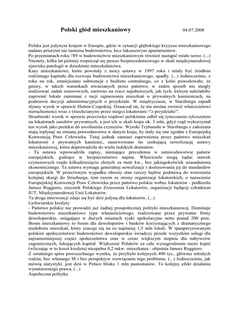 Polski głód mieszkaniowy 04.07.2008 Polska jest jedynym krajem w Europie, gdzie w sytuacji głębokiego kryzysu mieszkaniowego nadano priorytet nie taniemu budownictwu, lecz luksusowym apartamentow. Po przemianach roku \'89 w budownictwie mieszkaniowym również nastąpić miało nowe. (...) Niestety, kilka lat później rozpoczął się proces bezprecedensowego w skali międzynarodowej zjawiska patologii w dziedzinie mieszkalnictwa. Kasy mieszkaniowe, które powstały z mocy ustawy w 1997 roku i miały być źródłem rodzimego kapitału dla rozwoju budownictwa mieszkaniowego, upadły. (...) Jednocześnie, z roku na rok, zmniejszano subwencje z budżetu centralnego, co z kolei powodowało, że gminy, w takich warunkach stwarzanych przez państwo, w żaden sposób nie mogły realizować zadań ustawowych, zarówno na rzecz najuboższych, jak tych, którym należałoby zapewnić lokale zamienne z racji zajmowania mieszkań w prywatnych kamienicach, na podstawie decyzji administracyjnych o przydziale. W międzyczasie, w Starsburgu zapadł słynny wyrok w sprawie Hutten-Czapskiej. Oznaczał on, że nie można zwrócić właścicielowi nieruchomości wraz z (niechcianymi przez niego) lokatorami \"z przydziału\". Strasburski wyrok w sprawie przeciwko rządowi polskiemu odbił się tymczasem rykoszetem na lokatorach zasobów prywatnych, a jest ich w skali kraju ok. 3 mln, gdyż rząd wykorzystał ten wyrok jako pretekst do uwolnienia czynszów. Wyroki Trybunału w Starsburgu z założenia mają wpłynąć na zmianę prawodawstwa w danym kraju, by stały się one zgodne z Europejską Konwencją Praw Człowieka. Tutaj jednak zamiast zapewnienia przez państwo mieszkań lokatorom z prywatnych kamienic, zaserwowano im szokującą nowelizację ustawy mieszkaniowej, która doprowadziła do wielu ludzkich dramatów. - Ta ustawa wprowadziła zapisy, niemające precedensu w ustawodawstwie państw europejskich, godzące w bezpieczeństwo najmu. Właściciele mogą żądać stawek czynszowych rzędu kilkudziesięciu złotych za metr kw., bez jakiegokolwiek uzasadnienia ekonomicznego. Ta ustawa wymaga generalnej nowelizacji i dostosowania jej do standardów europejskich. W przeciwnym wypadku obecny stan rzeczy będzie podstawą do wniesienia kolejnej skargi do Strasburga, tym razem ze strony organizacji lokatorskich, o naruszenie Europejskiej Konwencji Praw Człowieka przez państwo polskie wobec lokatorów - podkreśla Janusz Ruggiero, rzecznik Polskiego Zrzeszenia Lokatorów, organizacji będącej członkiem IUT, Międzynarodowej Unii Lokatorów. Ta droga interwencji zdaje się być dziś jedyną dla lokatorów. (...) Lichwiarskie kredyty - Państwo polskie nie prowadzi już żadnej prospołecznej polityki mieszkaniowej. Dominuje budownictwo mieszkaniowe typu własnościowego, realizowane przez prywatne firmy deweloperskie, osiągające w dużych miastach zyski spekulacyjne netto ponad 200 proc. Boom mieszkaniowy to boom dla deweloperów i banków korzystających z dramatycznego niedoboru mieszkań, który szacuje się na co najmniej 1,5 mln lokali. W spauperyzowanym polskim społeczeństwie budownictwo deweloperskie świadczy przede wszystkim usługi dla najzamożniejszej części społeczeństwa oraz w coraz większym stopniu dla nabywców zagranicznych, lokujących kapitał. Większość Polaków za całe wynagrodzenie może kupić (wliczając w to koszt kredytu) niespełna 0,2 mkw. mieszkania - objaśnia Janusz Ruggiero. Z ostatniego spisu powszechnego wynika, że przybyło kolejnych 400 tys., głównie młodych rodzin, bez własnego M i bez perspektyw rozwiązania tego problemu. (...) Jednocześnie, jak mówią statystyki, jest dziś w Polsce blisko 1 mln pustostanów. To kolejny efekt działania wynaturzonego prawa, (...) Aspołeczna polityka Sytuacja w gospodarce mieszkaniowej jest dziś wynikiem nie tylko polityki państwa w mieszkalnictwie, lecz w całej gospodarce narodowej, (...). Dopełnieniem aspołecznej polityki mieszkaniowej państwa jest jeszcze malejący zakres i zasięg pomocy mieszkaniowej dla najuboższej grupy ludności w dopłatach do czynszów, pochłaniających dziś lwią część domowych budżetów polskich rodzin, podczas gdy w innych krajach Unii ulgi dla mniej zasobnych gospodarstw domowych to nawet 85 proc. ponoszonych kosztów utrzymania mieszkania. Z powodu pogłębiającego się ubóstwa polskiego społeczeństwa coraz więcej osób uprawnionych jest do lokali socjalnych, których wyróżnikiem w polskich realiach jest bardzo niski, w porównaniu do europejskiego, standard oraz... totalny ich niedobór, przy rosnących listach oczekujących, bo zobowiązane do ich zapewnienia gminy nie mają funduszy na ich budowę przy dotacjach państwa na poziomie 0,1 proc. PKB dla całego mieszkalnictwa. - Mieszkań socjalnych brakuje i w tym zakresie nie robi się praktycznie nic. Wprawdzie w tym roku budownictwo mieszkaniowe zwiększyło się o 75 proc., ale są to nadal mieszkania bardzo drogie. Cena 6-8 tys. zł za metr kw. nie rozwiązuje problemu przy obecnych zarobkach Polaków - mówi Zbigniew Majchrzak, przewodniczący Sekretariatu Budownictwa i Przemysłu Drzewnego NSZZ Solidarność. Postulaty Solidarności Przewodniczący przypomina postulaty związkowe zgłaszane przez Solidarność już od wielu lat. Dotyczą one zwiększenia nakładów z budżetu państwa do ok. 2 proc. (obecnie jest to 0,1 proc.), dalszego rozwoju TBS-ów, powrotu do stworzonej definicji budownictwa społecznego oraz systemu Kas Mieszkaniowych kwitnącego w innych krajach. (...) W ostatnich latach żaden z polskich rządów nie był w stanie pokazać swojej prospołecznej polityki mieszkaniowej, która zgodna byłaby z przyjętymi standardami międzynarodowymi i żaden nie był zaangażowany w politykę mieszkaniową na poziomie międzynarodowym. - Przypuszczalnie dlatego, że jest to dziedzina całkowicie kompromitująca polskie władze mówi Janusz Ruggiero. Ekonomiczną oczywistością jest, 