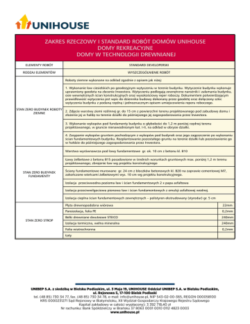 ZAKRES RZECZOWY I STANDARD ROBÓT DOMÓW UNIHOUSE DOMY REKREACYJNE DOMY W TECHNOLOGII DREWNIANEJ ELEMENTY ROBÓT STANDARD DEVELOPERSKI RODZAJ ELEMENTÓW WYSZCZEGÓLNIENIE ROBÓT Roboty ziemne wykonane na odkład zgodnie z opisem jak niżej: 1. Wykonanie ław ciesielskich po geodezyjnym wytyczeniu w terenie budynku. Wytyczenie budynku wykonuje uprawniony geodeta na zlecenie Inwestora. Wytyczeniu podlegają zewnętrzne narożniki i załamania budynku, osie wewnętrznych ścian konstrukcyjnych oraz wysokościowy reper roboczy. Dokumentem potwierdzającym prawidłowość wytyczenia jest wpis do dziennika budowy dokonany przez geodetę oraz dołączony szkic wytyczenia budynku z podaną rzędną i jednoznacznym opisem umiejscowienia reperu roboczego. STAN ZERO BUDYNEK ROBOTY 2. Zdjęcie warstwy ziemi roślinnej gr. do 15 cm z powierzchni terenu projektowanego pod zabudowę domu i ZIEMNE złożenie jej w hałdę na terenie działki do późniejszego jej zagospodarowania przez Inwestora. 3. Wykonanie wykopów pod fundamenty budynku o głębokości do 1,2 m poniżej rzędnej terenu projektowanego, w gruncie nienawodnionym kat. I-II, na odkład w obrysie działki. 4. Zasypanie wykopów gruntem pochodzącym z wykopów pod budynek oraz jego zagęszczenie po wykonaniu ścian fundamentowych budynku. Rozplantowanie pozostałego gruntu na terenie działki lub pozostawienie go w hałdzie do późniejszego zagospodarowania przez Inwestora. Warstwa wyrównawcza pod ławy fundamentowe gr. ok. 10 cm z betonu kl. B10 Ławy żelbetowe z betonu B15 posadowione w średnich warunkach gruntowych max. poniżej 1,2 m terenu projektowanego; zbrojenie ław wg projektu konstrukcyjnego STAN ZERO BUDYNEK FUNDAMENTY Ściany fundamentowe murowane gr. 24 cm z bloczków betonowych kl. B20 na zaprawie cementowej M7, zakończone wieńcami żelbetowymi wys. 10 cm wg projektu konstrukcyjnego. Izolacja przeciwwodna pozioma ław i ścian fundamentowych 2 x papa asfaltowa Izolacja przeciwwilgociowa pionowa ław i ścian fundamentowych z emulsji asfaltowej wodnej. Izolacja cieplna ścian fundamentowych zewnętrznych – polistyren ekstrudowany (styrodur) gr. 5 cm STAN ZERO STROP Płyta drewnopodobna wiórowa 22mm Paroizolacja, folia PE 0,2mm Belki drewniane dwuteowe STEICO 240mm Izolacja termiczna, wełna mineralna 240mm Folia wiatrochronna 0,2mm Łaty UNIBEP S.A. z siedzibą w Bielsku Podlaskim, ul. 3 Maja 19, UNIHOUSE Oddział UNIBEP S.A. w Bielsku Podlaskim, ul. Rejonowa 5, 17-100 Bielsk Podlaski tel. (48 85) 730 34 77, fax. (48 85) 730 34 78, e-mail: [email protected], NIP 543-02-00-365, REGON 000058100 KRS 0000231271 Sąd Rejonowy w Białymstoku, XII Wydział Gospodarczy Krajowego Rejestru Sądowego Kapitał zakładowy w całości wypłacony): 3 392 718,40 zł Nr rachunku: Bank Spółdzielczy w Brańsku 37 8063 0001 0010 0112 4823 0003 www.unihouse.pl Szalówka 19mm Łaty pod szalówkę 25mm Folia wiatrochronna ŚCIANY ZEWNĘTRZNE PARTERU I PIĘTRA K=0,26 W/(m2*K) ŚCIANY WEWNĘTRZNE KONSTRUKCYJNE ŚCIANA DZIAŁOWA Płyta drewnopodobna wiórowa 12mm Krawędziaki drewniane z drewna iglastego 150mm Izolacja termiczna, wełna mineralna 150mm Płyta drewnopodobna wiórowa 12mm Paroizolacja, folia PE 0,2mm Płyta gipsowo- kartonowa 12,5mm Płyta gipsowo- kartonowa 12,5mm Płyta drewnopodobna wiórowa 12mm Krawędziaki drewniane z drewna iglastego 120mm Izolacja akustyczna, wełna mineralna 50mm Płyta drewnopodobna wiórowa 12mm Płyta gipsowo- kartonowa 12,5mm Płyta gipsowo- kartonowa 12,5mm Płyta drewnopodobna wiórowa 12mm Krawędziaki drewniane z drewna iglastego 80mm Izolacja akustyczna, wełna mineralna 50mm Płyta gipsowo- kartonowa STROP NAD PARTEREM (budunek 2- kondygnac.) STROP NAD PIĘTREM K=0,23 W/(m2*K) 12,5mm Płyta drewnopodobna wiórowa 22mm Belki drewniane dwuteowe STEICO 240mm Izolacja akustyczna, wełna mineralna 50mm Łaty pod płyty gipsowo- kartonowe 25mm Płyty gipsowo- kartonowe 12,5mm Belki drewniane z drewna iglastego 180mm Izolacja termiczna, wełna mineralna 180mm Paroizolacja, folia PE 0,2mm Łaty pod płyty gipsowo- kartonowe Płyty gipsowo- kartonowe 30mm 12,5mm Pas dolny wiązara dachowego z tarcicy niestruganej impregnowanego i przeciwgrzybicznie - wg projektu konstrukcyjnego STROP NAD PARTEREM (budynek 1- kondygn.) K=0,21 W/(m2*K) Izolacja termiczna, wełna mineralna 200mm Paroizolacja, folia PE 0,2mm Łaty pod płyty gipsowo- kartonowe 30mm Płyty gipsowo- kartonowe UNIBEP S.A. z siedzibą w Bielsku Podlaskim, ul. 3 Maja 19, UNIHOUSE Oddział UNIBEP S.A. w Bielsku Podlaskim, ul. Rejonowa 5, 17-100 Bielsk Podlaski tel. (48 85) 730 34 77, fax. (48 85) 730 34 78, e-mail: [email protected], NIP 543-02-00-365, REGON 000058100 KRS 0000231271 Sąd Rejonowy w Białymstoku, XII Wydział Gospodarczy Krajowego Rejestru Sądowego Kapitał zakładowy w całości wypłacony): 3 392 718,40 zł Nr rachunku: Bank Spółdzielczy w Brańsku 37 8063 0001 0010 0112 4823 0003 www.unihouse.pl 12,5mm Blachodachówka DACH NAD CZĘŚCIĄ MIESZKALNĄ BUDYNKI Z UŻYTKOWYM PODDASZEM K=0.23W(m2*K) Łaty dachu 35mm Kontrłaty 25mm Folia dachowa 0,38mm Krokwie dachowe z drewna iglastego 180mm Izolacja termiczna, wełna mineralna 180mm Folia PE 0,2mm Łaty pod płyty gipsowo- kartonowe 25mm Płyty gipsowo- kartonowe 12,5mm Konstrukcja dachu przyjęta dla I strefy obciążenia śniegiem i wiatrem Blachodachówka DACH NAD CZĘŚCIĄ MIESZKALNĄ DLA DOMÓW PARTEROWYCH Łaty dachu 35mm Kontrłaty 25mm Folia dachowa Wiązary dachowe z tarcicy niestruganej impregnowanej przeciwogniowo i przeciwgrzybicznie – wg projektu konstrukcyjnego. PODBITKA OKAPÓW DACHU Wykończenie okapów dachu i lukarn szalówką drewnianą Drzwi wejściowe PCV pełne w kolorze białym STOLARKA OKIENNA I DRZWIOWA Okna jednoramowe PCV pięciokomorowe, bez szprosów, z okuciami obwiedniowymi, w kolorze białym, zestaw szyb jednokomorowy K=1,1 W/mºK Okna dachowe drewniane obrotowe k=1,4W/m2K SCHODY WEWNĘTRZNE KOMINY Schody drewniane ażurowe bukowe z balustr