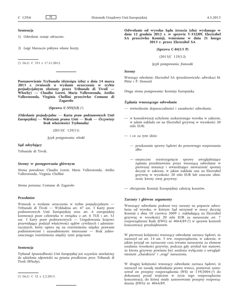 C 129/6 PL Dziennik Urzędowy Unii Europejskiej 4.5.2013 Odwołanie od wyroku Sądu (trzecia izba) wydanego w dniu 12 grudnia 2012 r. w sprawie T-332/09, Electrabel SA przeciwko Komisji, wniesione w dniu 21 lutego 2013 r. przez Electrabel SA Sentencja 1) Odwołanie zostaje odrzucone. 2) Luigi Marcuccio pokrywa własne koszty. (Sprawa C-84/13 P) (2013/C 129/12) (1) Dz.U. C 355 z 17.11.2012. Język postępowania: francuski Strony Postanowienie Trybunału (dziesiąta izba) z dnia 14 marca 2013 r. (wniosek o wydanie orzeczenia w trybie prejudycjalnym złożony przez Tribunale di Tivoli — Włochy) — Claudio Loreti, Maria Vallerotonda, Attilio Vallerotonda, Virginia Chellini przeciwko Comune di Zagarolo (Sprawa C-555/12) (1 ) (Odesłanie prejudycjalne — Karta praw podstawowych Unii Europejskiej — Wdrożenie prawa Unii — Brak — Oczywisty brak właściwości Trybunału) Wnoszący odwołanie: Electrabel SA (przedstawiciele: adwokaci M. Pittie i P. Honoré) Druga strona postępowania: Komisja Europejska Żądania wnoszącego odwołanie — stwierdzenie dopuszczalności i zasadności odwołania; — w konsekwencji uchylenie zaskarżonego wyroku w zakresie, w jakim nakłada on na Electrabel grzywnę w wysokości 20 mln EUR; (2013/C 129/11) Język postępowania: włoski Sąd odsyłający Tribunale di Tivoli. Strony w postępowaniu głównym Strona powodowa: Claudio Loreti, Maria Vallerotonda, Attilio Vallerotonda, Virginia Chellini Strona pozwana: Comune di Zagarolo — i co za tym idzie: — przekazanie sprawy Sądowi do ponownego rozpoznania albo — ostateczne rozstrzygnięcie sprawy uwzględniające żądania przedstawione przez wnoszącą odwołanie w pierwszej instancji i stwierdzające nieważność spornej decyzji w zakresie, w jakim nakłada ona na Electrabel grzywnę w wysokości 20 mln EUR lub znaczne obni żenie kwoty owej grzywny; — obciążenie Komisji Europejskiej całością kosztów. Przedmiot Zarzuty i główne argumenty Wniosek o wydanie orzeczenia w trybie prejudycjalnym — Tribunale di Tivoli — Wykładnia art. 47 ust. 3 Karty praw podstawowych Unii Europejskiej oraz art. 6 europejskiej konwencji praw człowieka w związku z art. 6 TUE i art. 52 ust. 3 karty praw podstawowych — Uregulowania krajowe przewidujące podział właściwości sądów cywilnych i administ racyjnych, który opiera się na rozróżnieniu między prawami podmiotowymi i uzasadnionymi interesami — Brak jedno znacznego rozróżnienia między tymi pojęciami Wnoszący odwołanie podnosi trzy zarzuty na poparcie odwo łania od wyroku, w którym Sąd utrzymał w mocy decyzję Komisji z dnia 10 czerwca 2009 r. nakładającą na Electrabel grzywnę w wysokości 20 mln EUR za naruszenie art. 7 rozporządzenia Rady (EWG) nr 4064/89 (1) w sprawie kontroli koncentracji przedsiębiorstw. Sentencja Trybunał Sprawiedliwości Unii Europejskiej jest oczywiście niewłaściwy do udzielenia odpowiedzi na pytania przedłożone przez Tribunale di Tivoli (Włochy). (1) Dz.U. C 32 z 2.2.2013. W pierwszej kolejności wnoszący odwołanie zarzuca Sądowi, że naruszył on art. 14 ust. 3 ww. rozporządzenia, w zakresie, w jakim przyjął on zarzucony czas trwania naruszenia za element ustalania wysokości grzywny, podczas gdy artykuł ten stanowi, że kwota grzywny powinna być ustalona wyłącznie z uwzględ nieniem „charakteru” i „wagi” naruszenia. W drugiej kolejności wnoszący odwołanie zarzuca Sądowi, iż naruszył on zasadę niedziałania prawa wstecz, ponieważ zasto sował on przepisy rozporządzenia (WE) nr 139/2004 (2) do dokonanej przed wejściem w życie tego rozporządzenia koncentracji, do której miały zastosowanie przepisy rozporzą dzenia (EWG) nr 4064/89.