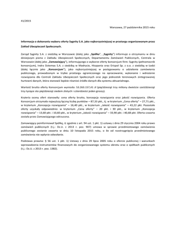 41/2015 Warszawa, 27 października 2015 roku Informacja o dokonaniu wyboru oferty Sygnity S.A. jako najkorzystniejszej w przetargu organizowanym przez Zakład Ubezpieczeń Społecznych. Zarząd Sygnity S.A. z siedzibą w Warszawie (dalej jako „Spółka”, „Sygnity”) informuje o otrzymaniu w dniu dzisiejszym pisma z Zakładu Ubezpieczeń Społecznych, Departamentu Zamówień Publicznych, Centrala w Warszawie (dalej jako „Zamawiający”), informującego o wyborze oferty konsorcjum firm: Sygnity (pełnomocnik konsorcjum), Indra Sistemas S.A. z siedzibą w Madrycie, Hiszpania oraz Ericpol Sp. z o.o. z siedzibą w Łodzi (dalej łącznie jako „Konsorcjum”), jako najkorzystniejszej w postępowaniu o udzielenie zamówienia publicznego, prowadzonym w trybie przetargu ograniczonego na opracowanie, wykonanie i wdrożenie rozwiązania dla Centrali Zakładu Ubezpieczeń Społecznych oraz jego jednostek terenowych zintegrowanej hurtowni danych, która stanowić będzie również źródło danych dla systemu aktuarialnego. Wartość brutto oferty Konsorcjum wyniosła: 53.263.157,41 zł (pięćdziesiąt trzy miliony dwieście sześćdziesiąt trzy tysiące sto pięćdziesiąt siedem złotych i czterdzieści jeden groszy). Kryteria oceny ofert stanowiły: cena oferty brutto, koncepcja rozwiązania oraz jakość rozwiązania. Oferta Konsorcjum otrzymała najwyższą łączną liczbę punktów – 87,33 pkt., tj. w kryterium „Cena oferty” – 27,71 pkt., w kryterium „Koncepcja rozwiązania” – 16,40 pkt., w kryterium „Jakość rozwiązania” – 43,22 pkt. Pozostałe oferty uzyskały odpowiednio: w kryterium „Cena oferty” – 20 pkt. i 30 pkt., w kryterium „Koncepcja rozwiązania” – 13,60 pkt. i 10,60 pkt., w kryterium „Jakość rozwiązania” – 33,90 pkt. i 40,68 pkt. Oferta czwarta została przez Zamawiającego odrzucona. Zamawiający poinformował Spółkę, iż zgodnie z art. 94 ust. 1 pkt. 1) ustawy z dnia 29 stycznia 2004 roku prawo zamówień publicznych (t.j.: Dz.U. z 2013 r. poz. 907) umowa w sprawie przedmiotowego zamówienia publicznego zostanie zawarta w dniu 10 listopada 2015 roku, o ile od rozstrzygnięcia przedmiotowego zamówienia nie wpłynie odwołanie. Podstawa prawna: § 56 ust. 1 pkt. 1) Ustawy z dnia 29 lipca 2005 roku o ofercie publicznej i warunkach wprowadzenia instrumentów finansowych do zorganizowanego systemu obrotu oraz o spółkach publicznych (t.j.: Dz.U. z 2013 r. poz. 1382).