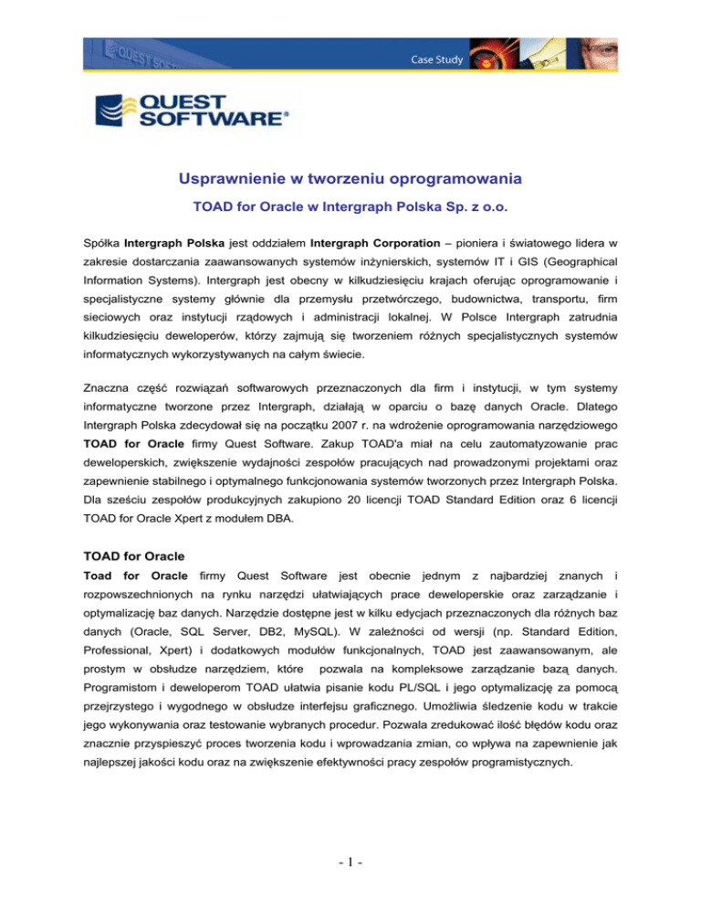 Usprawnienie w tworzeniu oprogramowania TOAD for Oracle w Intergraph Polska Sp. z o.o. Spółka Intergraph Polska jest oddziałem Intergraph Corporation – pioniera i światowego lidera w zakresie dostarczania zaawansowanych systemów inżynierskich, systemów IT i GIS (Geographical Information Systems). Intergraph jest obecny w kilkudziesięciu krajach oferując oprogramowanie i specjalistyczne systemy głównie dla przemysłu przetwórczego, budownictwa, transportu, firm sieciowych oraz instytucji rządowych i administracji lokalnej. W Polsce Intergraph zatrudnia kilkudziesięciu deweloperów, którzy zajmują się tworzeniem różnych specjalistycznych systemów informatycznych wykorzystywanych na całym świecie. Znaczna część rozwiązań softwarowych przeznaczonych dla firm i instytucji, w tym systemy informatyczne tworzone przez Intergraph, działają w oparciu o bazę danych Oracle. Dlatego Intergraph Polska zdecydował się na początku 2007 r. na wdrożenie oprogramowania narzędziowego TOAD for Oracle firmy Quest Software. Zakup TOAD'a miał na celu zautomatyzowanie prac deweloperskich, zwiększenie wydajności zespołów pracujących nad prowadzonymi projektami oraz zapewnienie stabilnego i optymalnego funkcjonowania systemów tworzonych przez Intergraph Polska. Dla sześciu zespołów produkcyjnych zakupiono 20 licencji TOAD Standard Edition oraz 6 licencji TOAD for Oracle Xpert z modułem DBA. TOAD for Oracle Toad for Oracle firmy Quest Software jest obecnie jednym z najbardziej znanych i rozpowszechnionych na rynku narzędzi ułatwiających prace deweloperskie oraz zarządzanie i optymalizację baz danych. Narzędzie dostępne jest w kilku edycjach przeznaczonych dla różnych baz danych (Oracle, SQL Server, DB2, MySQL). W zależności od wersji (np. Standard Edition, Professional, Xpert) i dodatkowych modułów funkcjonalnych, TOAD jest zaawansowanym, ale prostym w obsłudze narzędziem, które pozwala na kompleksowe zarządzanie bazą danych. Programistom i deweloperom TOAD ułatwia pisanie kodu PL/SQL i jego optymalizację za pomocą przejrzystego i wygodnego w obsłudze interfejsu graficznego. Umożliwia śledzenie kodu w trakcie jego wykonywania oraz testowanie wybranych procedur. Pozwala zredukować ilość błędów kodu oraz znacznie przyspieszyć proces tworzenia kodu i wprowadzania zmian, co wpływa na zapewnienie jak najlepszej jakości kodu oraz na zwiększenie efektywności pracy zespołów programistycznych. -1- Oprócz licencji TOAD’a for Oracle Standard Edition, firma Intergraph Polska zakupiła także TOAD for Oracle Xpert – najbardziej rozbudowaną wersję TOAD’a oferującą dodatkowe możliwości tuningu wydajności kodu SQL. TOAD for Oracle Xpert zawiera narzędzia SQL Scanner i SQL Optimizer, które pozwalają na wykrycie nieodpowiednich zapytań SQL i przeprowadzenie ich automatycznego tuningu. Ponadto SQL Optimizer dostarcza szczegółowych porad dotyczących optymalizacji poleceń SQL. Toad jest wyposażony także w wiele innych praktycznych funkcji, które pomagają deweloperom być bardziej produktywnymi i efektywniejszymi przy tworzeniu kodu: debugger kodu PL/SQL, baza wiedzy dla programistów i deweloperów (PL/SQL Knowledge Base) czy moduł Code Expert zintegrowany z edytorem i pozwalający na pisanie poprawnego i wydajnego kodu zgodnie z dobrymi praktykami programistycznymi. Duża funkcjonalność TOAD’a, intuicyjna i prosta obsługa oraz automatyzacja procesów wpłynęły na znaczą oszczędność czasu i zwiększyły efektywność pracy zespołów projektowych w Intergraph Polska. „Zaletą TOAD’a jest ogromna funkcjonalność połączona z łatwą obsługą i przejrzystym interfejsem graficznym. Od razu po wdrożeniu TOAD’a zauważyliśmy znaczne skrócenie czasu tworzenia systemów informatycznych. TOAD wpłynął na zmniejszenie ilości błędów popełnianych przez programistów. Ponadto usprawnił wykonywanie tuningu i pozwala łatwiej sprawdzić nieprawidłowości. To zmniejsza czas potrzebny na wykrycie i naprawienie problemu. TOAD stał się obecnie pewnym standardem jeżeli chodzi o zarządzanie środowiskiem Oracle. Bardzo wiele firm już korzysta z tego narzędzia, albo chce z niego korzystać.” - Jerzy Wiśniewski, Główny Projektant Systemów Informatycznych, Intergraph Polska Sp. z o.o. Oprócz uproszczenia i przyspieszenia rozwijania aplikacji, a także możliwości usuwania błędów kodu PL/SQL, TOAD pozwala na kompleksowe zarządzanie bazą danych Oracle i zautomatyzowanie wykonywania codziennych zadań administracyjnych, jak np. import/eksport danych, uaktualnianie statystyk, zarządzanie przestrzeniami tabel czy synchronizacja schematów. Dodatkowe moduły, takie jak zakupiony przez Intergraph Polska moduł DBA, pozwala sprawdzić kondycję instancji oraz testować wydajność bazy danych. „Poszukując narzędzi do zwiększenia wydajności i ułatwienia pracy, użytkownicy często decydują się na rozwiązania freeware’owe. Głównie z jednego powodu – rozwiązania takie są za darmo. Jednak żadne narzędzie informatyczne przeznaczone dla środowiska Oracle nie oferuje takiej dużej funkcjonalności połączonej z prostą i intuicyjną obsługą jak TOAD firmy Quest Software. To właśnie dlatego zakupiliśmy licencje TOAD’a.” - Jerzy Wiśniewski, Główny Projektant Systemów Informatycznych, Intergraph Polska Sp. z o.o. -2- …………………………………………………………………………………………………………………………………………………….. Intergraph Polska Sp. z o.o. jest częścią międzynarodowej korporacji Intergraph Corporation założonej ponad 35 lat. Firma stała się pionierem w zakresie dostarczania zaawansowanych systemów inżynierskich, systemów GIS i IT przeznaczonych głównie dla przemysłu przetwórczego, budownictwa, transportu, firm sieciowych oraz instytucji rządowych i administracji lokalnej. Intergraph oferuje k