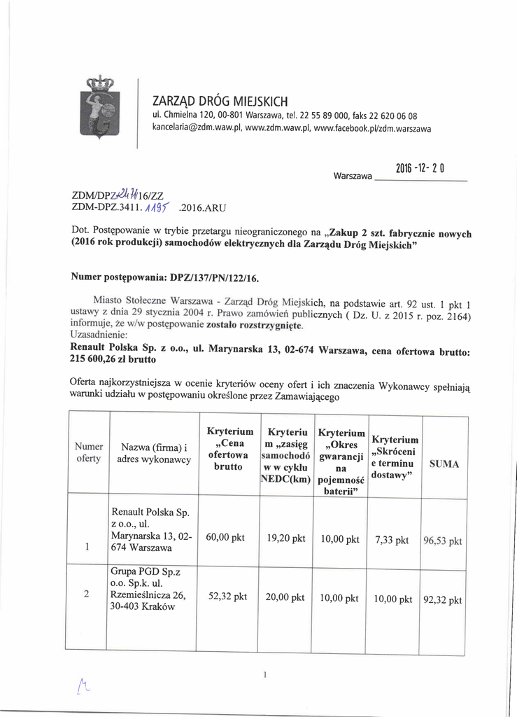 ZARZAD DROG MtEJSK|CH ul. Chmielna 120,00-801 Warszawa, tel.22 55 89 000, faks22 620 06 Og kancelaria@zd m.waw. pl, www.zd m.waw. pl, www.facebook.pl/zdm.wa rszawa Warszawa 2016‐ 12‐ 20 zDw/Dpzlililltrctzz zDM-DPZ.34rr. t[gf .20I6.ARU Dot. Postgpowanie w trybie przetargu nieograniczonego na ,,Zakup 2 szt. fabrycznie norvych Q0l6 rok produkcji) samochodriw elektrycznych dla ZarzqduOiOg Miejskich" Numer postgpowa niaz DP Zl 137 lpN | 122t 16. ch, na podstawie art. 92 ust. I pkt I cznych (Dz. U. z 2015 r. poz. 2164) Renault Polska Sp. z o.o., ul. Marynarska 13, 02-674 Warszawa, cena ofertowa brutto: 215 600,26 zl brutto oferta najkorzystniejsza w ocenie kryteri6w oceny ofert i ich znaczenia Wykonawcy spelniaj4 warunki udziaht w po stgp owaniu okre s I on e prze t, zamawiaiEc e go Nazwa (firma) i adres wykonawcy Renault Polska Sp. z o.o., ul. Marynarska 13,026T4Warszawa Grupa PGD Sp.z o.o. Sp.k. ul. RzemieSlnicza26, 30-403 Krak6w Kryterium Kryteriu Kryterium ,rCena m rrzasigg ,rOkres ofertowa brutto 60,00 pkt 52,32 pkt Kryterium gwarancji ,,Skr6ceni e terminu w w cyklu na dostawy" EDC(km) pojemnoS6 baterii" pkt 10,00 pkt 7,33 pkt 20,00 pkt 10,00 pkt 10,00 pkt 19,20 92,32 pkt た‘ ′ Prosimy o zgloszenie sig wybranej firmy w terminie nie kr6tszym niz 5 dni od dnia przeslania zawiadomienia o wyborze najkorzystriejszej oferty lecz, nie p6iniej niZ przed uptywem terminu zwiqzarnia ofert% do Zarzqdu Dr6g Miejskich, ul. Chmielnu IZO bi*o Obsfugi Klienta w celu podpisania umowy. zgodnie z art. 92 ust. 2 ustawy Pzp zawiadomienie o wyborze naj zostanieniezwloczniezantieszcz,onenastonieintemetowejhttp:llwww.zAry - D\TR flDU A.k [email protected]