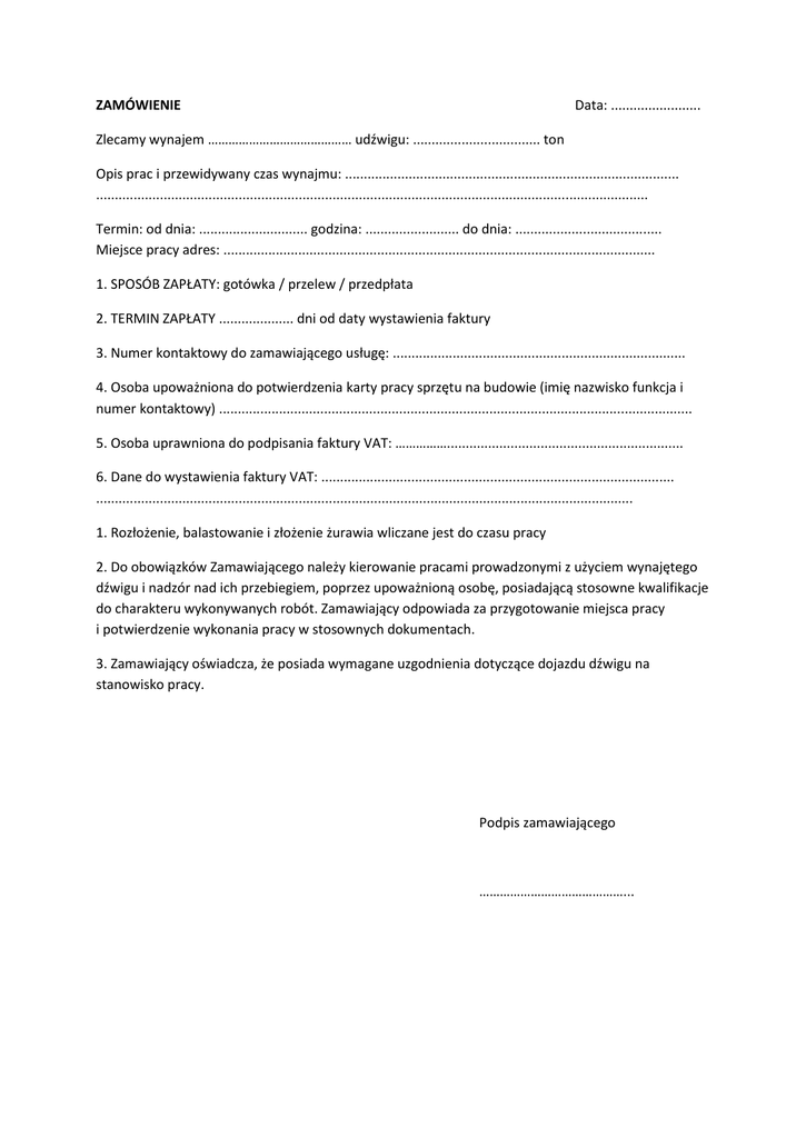 ZAMÓWIENIE Data: ........................ Zlecamy wynajem …………………………………… udźwigu: .................................. ton Opis prac i przewidywany czas wynajmu: ......................................................................................... ................................................................................................................................................... Termin: od dnia: ............................. godzina: ......................... do dnia: ....................................... Miejsce pracy adres: ................................................................................................................... 1. SPOSÓB ZAPŁATY: gotówka / przelew / przedpłata 2. TERMIN ZAPŁATY .................... dni od daty wystawienia faktury 3. Numer kontaktowy do zamawiającego usługę: .............................................................................. 4. Osoba upoważniona do potwierdzenia karty pracy sprzętu na budowie (imię nazwisko funkcja i numer kontaktowy) .............................................................................................................................. 5. Osoba uprawniona do podpisania faktury VAT: ……………............................................................... 6. Dane do wystawienia faktury VAT: .............................................................................................. ............................................................................................................................................... 1. Rozłożenie, balastowanie i złożenie żurawia wliczane jest do czasu pracy 2. Do obowiązków Zamawiającego należy kierowanie pracami prowadzonymi z użyciem wynajętego dźwigu i nadzór nad ich przebiegiem, poprzez upoważnioną osobę, posiadającą stosowne kwalifikacje do charakteru wykonywanych robót. Zamawiający odpowiada za przygotowanie miejsca pracy i potwierdzenie wykonania pracy w stosownych dokumentach. 3. Zamawiający oświadcza, że posiada wymagane uzgodnienia dotyczące dojazdu dźwigu na stanowisko pracy. Podpis zamawiającego ……………………………………...
