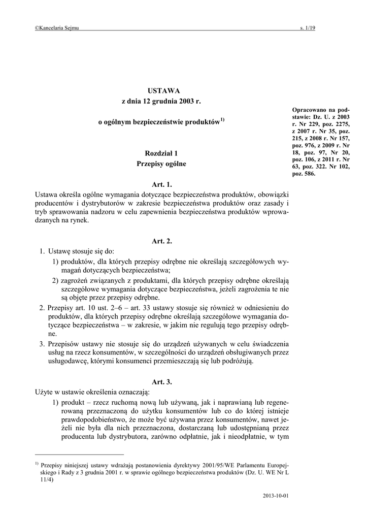 ©Kancelaria Sejmu s. 1/19 USTAWA z dnia 12 grudnia 2003 r. Opracowano na podstawie: Dz. U. z 2003 r. Nr 229, poz. 2275, z 2007 r. Nr 35, poz. 215, z 2008 r. Nr 157, poz. 976, z 2009 r. Nr 18, poz. 97, Nr 20, poz. 106, z 2011 r. Nr 63, poz. 322. Nr 102, poz. 586. o ogólnym bezpieczeństwie produktów 1) Rozdział 1 Przepisy ogólne Art. 1. Ustawa określa ogólne wymagania dotyczące bezpieczeństwa produktów, obowiązki producentów i dystrybutorów w zakresie bezpieczeństwa produktów oraz zasady i tryb sprawowania nadzoru w celu zapewnienia bezpieczeństwa produktów wprowadzanych na rynek. Art. 2. 1. Ustawę stosuje się do: 1) produktów, dla których przepisy odrębne nie określają szczegółowych wymagań dotyczących bezpieczeństwa; 2) zagrożeń związanych z produktami, dla których przepisy odrębne określają szczegółowe wymagania dotyczące bezpieczeństwa, jeżeli zagrożenia te nie są objęte przez przepisy odrębne. 2. Przepisy art. 10 ust. 2–6 – art. 33 ustawy stosuje się również w odniesieniu do produktów, dla których przepisy odrębne określają szczegółowe wymagania dotyczące bezpieczeństwa – w zakresie, w jakim nie regulują tego przepisy odrębne. 3. Przepisów ustawy nie stosuje się do urządzeń używanych w celu świadczenia usług na rzecz konsumentów, w szczególności do urządzeń obsługiwanych przez usługodawcę, którymi konsumenci przemieszczają się lub podróżują. Art. 3. Użyte w ustawie określenia oznaczają: 1) produkt – rzecz ruchomą nową lub używaną, jak i naprawianą lub regenerowaną przeznaczoną do użytku konsumentów lub co do której istnieje prawdopodobieństwo, że może być używana przez konsumentów, nawet jeżeli nie była dla nich przeznaczona, dostarczaną lub udostępnianą przez producenta lub dystrybutora, zarówno odpłatnie, jak i nieodpłatnie, w tym 1) Przepisy niniejszej ustawy wdrażają postanowienia dyrektywy 2001/95/WE Parlamentu Europejskiego i Rady z 3 grudnia 2001 r. w sprawie ogólnego bezpieczeństwa produktów (Dz. U. WE Nr L 11/4) 2013-10-01 ©Kancelaria Sejmu s. 2/19 również w ramach świadczenia usługi; produktem nie jest rzecz używana dostarczana jako antyk albo jako rzecz wymagająca naprawy lub regeneracji przed użyciem, o ile dostarczający powiadomił konsumenta o tych właściwościach rzeczy; 2) producent: a) przedsiębiorcę prowadzącego w Unii Europejskiej lub na terytorium państw członkowskich Europejskiego Porozumienia o Wolnym Handlu (EFTA) – stron umowy o Europejskim Obszarze Gospodarczym działalność polegającą na wytwarzaniu produktu albo każdą inną osobę, która występuje jako wytwórca, umieszczając na produkcie bądź do niego dołączając swoje nazwisko, nazwę, znak towarowy bądź inne odróżniające oznaczenie, a także osobę, która naprawia lub regeneruje produkt, b) przedstawiciela wytwórcy, a jeżeli wytwórca nie wyznaczył przedstawiciela – importera produktu, w przypadkach gdy wytwórca nie prowadzi działalności w Unii Europejskiej lub na terytorium państw członkowskich Europejskiego Porozumienia o Wolnym Handlu (EFTA) – stron umowy o Europejskim Obszarze Gospodarczym, c) przedsiębiorcę uczestniczącego w dowolnym etapie procesu dostarczania lub udostępniania produktu, jeżeli jego działanie może wpływać na właściwości produktu związane z jego bezpieczeństwem; 3) dystrybutor – przedsiębiorcę uczestniczącego w dowolnym etapie procesu dostarczania lub udostępniania produktu, którego działalność nie wpływa na właściwości produktu związane z jego bezpieczeństwem; 4) wypadek konsumencki – zaistniałe w związku z używaniem produktów zdarzenie nagłe, którego następstwem jest zgon albo uszkodzenie ciała wymagające udzielenia pomocy medycznej, w szczególności skaleczenie, zatrucie, oparzenie, ugryzienie lub użądlenie; 5) wprowadzenie na rynek – dostarczanie lub udostępnianie przez producenta lub dystrybutora produktu dystrybutorowi lub konsumentowi; 6) wprowadzenie na rynek polski – dostarczenie lub udostępnienie produktu po raz pierwszy na terytorium Rzeczypospolitej Polskiej. Rozdział 2 Ogólne wymagania dotyczące bezpieczeństwa produktów Art. 4. 1. Produktem bezpiecznym jest produkt, który w zwykłych lub w innych, dających się w sposób uzasadniony przewidzieć, warunkach jego używania, z uwzględnieniem czasu korzystania z produktu, a także, w zależności od rodzaju produktu, sposobu uruchomienia oraz wymogów instalacji i konserwacji, nie stwarza żadnego zagrożenia dla konsumentów lub stwarza znikome zagrożenie, dające się pogodzić z jego zwykłym używaniem i uwzględniające wysoki poziom wymagań dotyczących ochrony zdrowia i życia ludzkiego. 2. Przy ocenie bezpieczeństwa produktu uwzględnia się: 1) cechy produktu, w tym jego skład, opakowanie, instrukcję montażu i uruchomienia, a także – biorąc pod uwagę rodzaj produktu – instrukcję instalacji i konserwacji; 2013-10-01 ©Kancelaria Sejmu s. 3/19 2) oddziaływanie na inne produkty, jeżeli można w sposób uzasadniony przewidzieć, że będzie używany łącznie z innymi produktami; 3) wygląd produktu, jego oznakowanie, ostrzeżenia i instrukcje dotyczące jego użytkowania i postępowania z produktem zużytym oraz wszelkie inne udostępniane konsumentowi wskazówki lub informacje dotyczące produktu; 4) kategorie konsumentów narażonych na niebezpieczeństwo w związku z używaniem produktu, w szczególności dzieci i osoby starsze. Art. 5. 1. Produkt, który nie spełnia wymagań określonych w art. 4, nie jest produktem bezpiecznym. 2. Do stwierdzenia, że produkt nie jest bezpieczny, nie wystarcza możliwość osiągnięcia wyższego poziomu bezpieczeństwa lub dostępność innych produktów stwarzających mniejsze zagrożenia dla konsumentów. 3. Przy dokonywaniu oceny, czy produkt stwarza poważne zagrożenie, przez które rozumie się wymagające natychmiastowych działań n