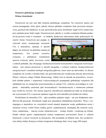 Oszustwo globalnego ocieplenia Wiktor Kobylinski Oszustwem nie jest sam fakt istnienia globalnego ocieplenia. Na oszustwie oparty jest system propagandy, który głosi, jakoby obecne globalne ocieplenie było procesem nietypowym, groźnym dla ludzkości, że jest spowodowane przez dwutlenek węgla (CO2) emitowany przy spalaniu przez ludzi węgla. Oszustwem jest, jakoby w wyniku ocieplenia klimatu podnosił się poziom wody w oceanach – co miałoby skutkować zalewaniem nisko położonych obszarów Ziemi. Oszustwem jest pogląd, że człowiek może, zmniejszając zawartość CO2 w atmosferze, wpłynąć w sposób dający się zmierzyć na globalną zmianę jej temperatury. związany z Ten system globalnym oszustwa ociepleniem sprawia wrażenie, jakby stworzony został z niskich pobudek, aby obciążając niesłusznymi karami konsumentów energetyki konwencjonalnej – tym samym promować w sposób niezgodny z wolnym rynkiem, bezpieczeństwem energetycznym i zasadami ekologii energetykę jądrową. Autor stara się udowodnić, że obecne ocieplenie nie wynika z działań ludzi, ale spowodowane jest zwiększoną obecnie aktywnością Słońca i dotyczy całego Układu Słonecznego. Gdyby teza ta okazała się prawdziwa, wszystkich działań państw i organizacji wykorzystujących propagandę globalnego ocieplenia dla nakładania kar na energetykę konwencjonalną za emisję CO2, rzekomo powodującą to ocieplenie – należałoby zaniechać jako bezzasadnych i bezskutecznych, a niesłusznie pobrane kary trzeba by zwrócić. Nie można negować szkodliwych oddziaływań ludzi na środowisko, ale wytwarzanie CO2 w procesie spalania węgla do tych szkodliwych działań nie należy. Wydzielanie do atmosfery CO2 – jako produktu spalania węgla – nie jest działaniem szkodliwym dla przyrody. Dwutlenek węgla jest naturalnym składnikiem atmosfery. Wraz z występującą w atmosferze we wszystkich trzech stanach skupienia wodą, podtlenkiem azotu i metanem tworzy wokół Ziemi otulinę gazów cieplarnianych, niezbędną dla istnienia życia. Gazy cieplarniane – inaczej zwane szklarniowymi – izolują Ziemię i moderują jej klimat. Dzięki osłonie gazów cieplarnianych zmiany temperatury powierzchni Ziemi w cyklach dziennych, a nawet rocznych są nieznaczne. Dla przykładu na bliskim nam, lecz pozbawionym takiej otuliny Księżycu różnica temperatur lokalnego dnia i nocy sięga 200 stopni. Wykres 1 ilustruje udział CO2 w otulinie gazów cieplarnianych Ziemi. Jest on niewielki. Część dwutlenku węgla powstałego z działalności człowieka ilustruje w skali wykresu mała czerwona kreska. Można oszacować, że skoro otulina gazów szklarniowych podniesienie powoduje średniej temperatury o około 20°C, to CO2 powstały w wyniku działalności człowieka „jest odpowiedzialny” za wzrost średniej temperatury o około 1/50°C – co jest wielkością praktycznie niemierzalną. Wypowiadając się na temat zmian temperatury Ziemi, niektórzy politycy, dziennikarze, a nawet naukowcy twierdzą, że przyczyną obecnego ocieplenia jest dwutlenek węgla (CO2) emitowany do atmosfery w procesie spalania węgla. Cały sektor energetyczny świata emituje tylko 37% produkowanego przez ludzi CO2, co stanowi mniej niż 0,05% gazów cieplarnianych Ziemi. Jednak dotkliwe działania propagandy są skierowane obecnie niemal wyłącznie przeciwko konsumentom energii uzyskiwanej ze spalania węgla kopalnego. Hipokryzję tego systemu widać też w tym, że kary nie dotyczą emisji CO2 powstającego przy spalaniu innych paliw, emitujących do atmosfery pozostałe 63% CO2. Jeden tylko przelot samolotu liniowego nad Atlantykiem pozostawia w atmosferze kilkaset ton CO2, ale to nie jest karane – w przeciwieństwie do spalania węgla. Nie żąda się od lotnictwa na przykład gromadzenia produkowanego CO2 w butlach i zakopywania pod ziemią, co niektórzy mało mądrzy sugerują energetyce konwencjonalnej. Propaganda nie wspomina, że w przeciwieństwie do odpadów energetyki jądrowej, dwutlenek węgla jest gazem nieszkodliwym i nie zanieczyszcza środowiska. CO2 jest w sposób naturalny redukowany z atmosfery w procesie asymilacji węgla przez rośliny. Proces asymilacji węgla z CO2 w roślinach jest nie tylko niezbędny dla podtrzymywania życia na Ziemi, ale równocześnie odnawia jej zużywane zasoby energetyczne i odzyskuje zużywany tlen. Niektórzy naukowcy, jakby zaślepieni histerią szkodliwości występowania CO2 w atmosferze, wydają się nie wiedzieć, że przerabianie przez rośliny CO2 we wspomaganym chlorofilem procesie asymilacji węgla nie tylko tworzy substancje niezbędne dla życia na Ziemi, odtwarza zużywane surowce energetyczne i wytwarza tlen – ale również, jako proces endotermiczny, chłodzi klimat. Kto nie wierzy, może sprawdzić, odwiedzając w upalny dzień bogaty w roślinność park w rozgrzanym mieście. Jakby zapominając, że źródłem ciepła dla Ziemi jest Słońce, autorzy wielu prac na temat globalnego ocieplenia pomijają wpływ zmian intensywności jego promieniowania na zmiany temperatury na Ziemi. Rzetelny badacz tego ignorować nie powinien, bo przez 65 minut Ziemia otrzymuje od Słońca tyle energii, ile cała współczesna cywilizacja produkuje przez rok. Globalne ocieplenia i globalne oziębienia są to zjawiska polegające na zmianie średniej temperatury powierzchni Ziemi w funkcji czasu. Czyta się w publikacjach, że w ubiegłym stuleciu temperatura powierzchni Ziemi wzrosła o 0,81 ± 0,2°C. A jak było wcześniej? Ktoś pisze z trwogą o wzroście temperatury powierzchni Ziemi w ciągu ostatnich 40 lat o 0,4°C. A jak było 60 lat temu? Ktoś inny przewiduje w najbliższym stuleciu wzrost tej temperatury o ileś-tam celsjuszy i zgubne dla ludzi tego skutki. Czy można traktować poważnie tak odległe w czasie wróżby „naukowców” nie umiejących przywidzieć pogody w następnym miesiącu? Przypomnijmy z jaką swadą naukowcy w latach 70. XX